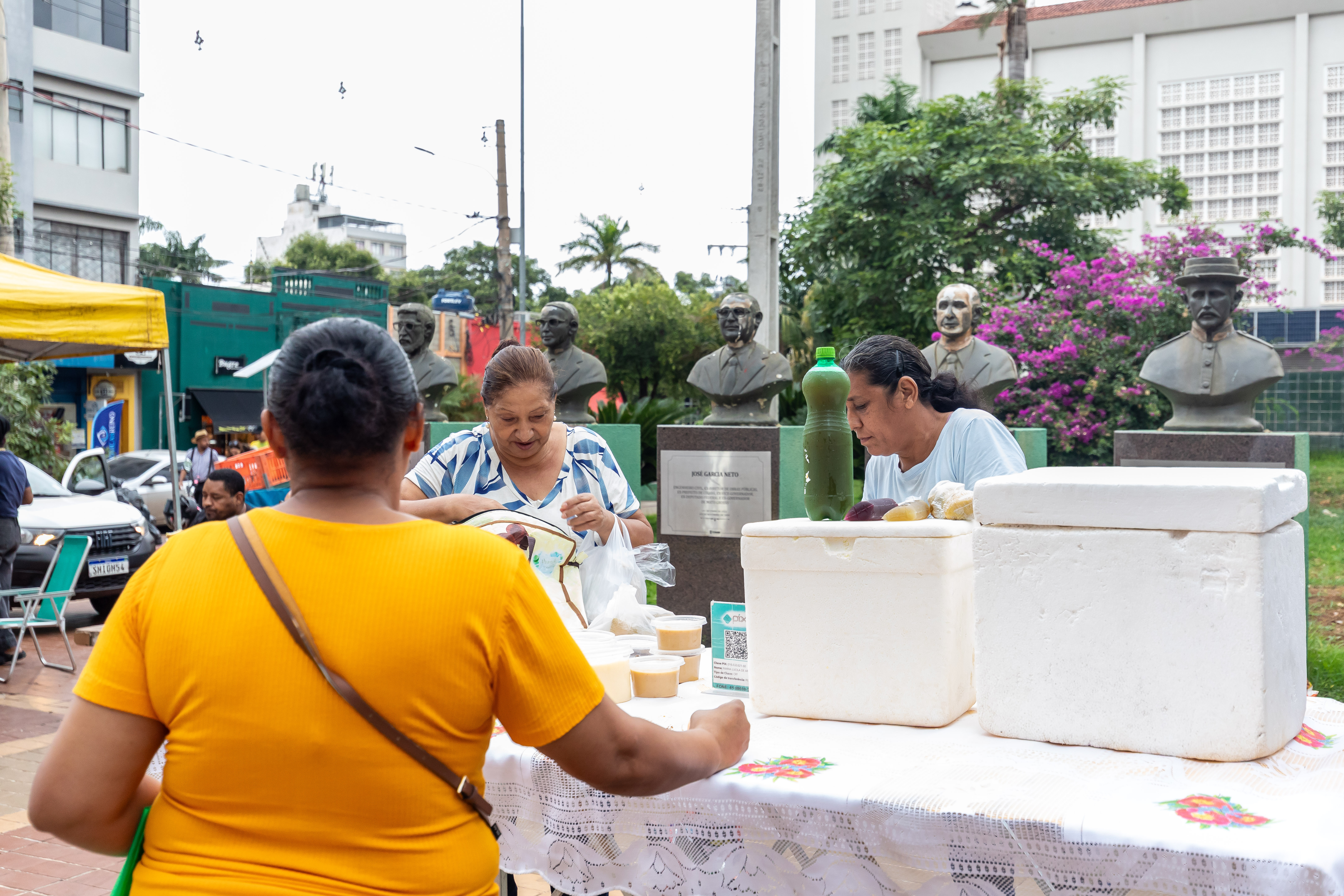 Thaara Gayva, empreendedora cuiabana, ofereceu salgados em bandeja, como esfihas abertas e pãezinhos de canela. Após um tempo afastada do mercado, ela está retomando a produção. “Estou vendendo bem aqui. É uma ótima oportunidade de apresentar meu produto ao público. Está sendo bem aceito, já vendi quase tudo, e a feira vai até mais tarde”, revelou.