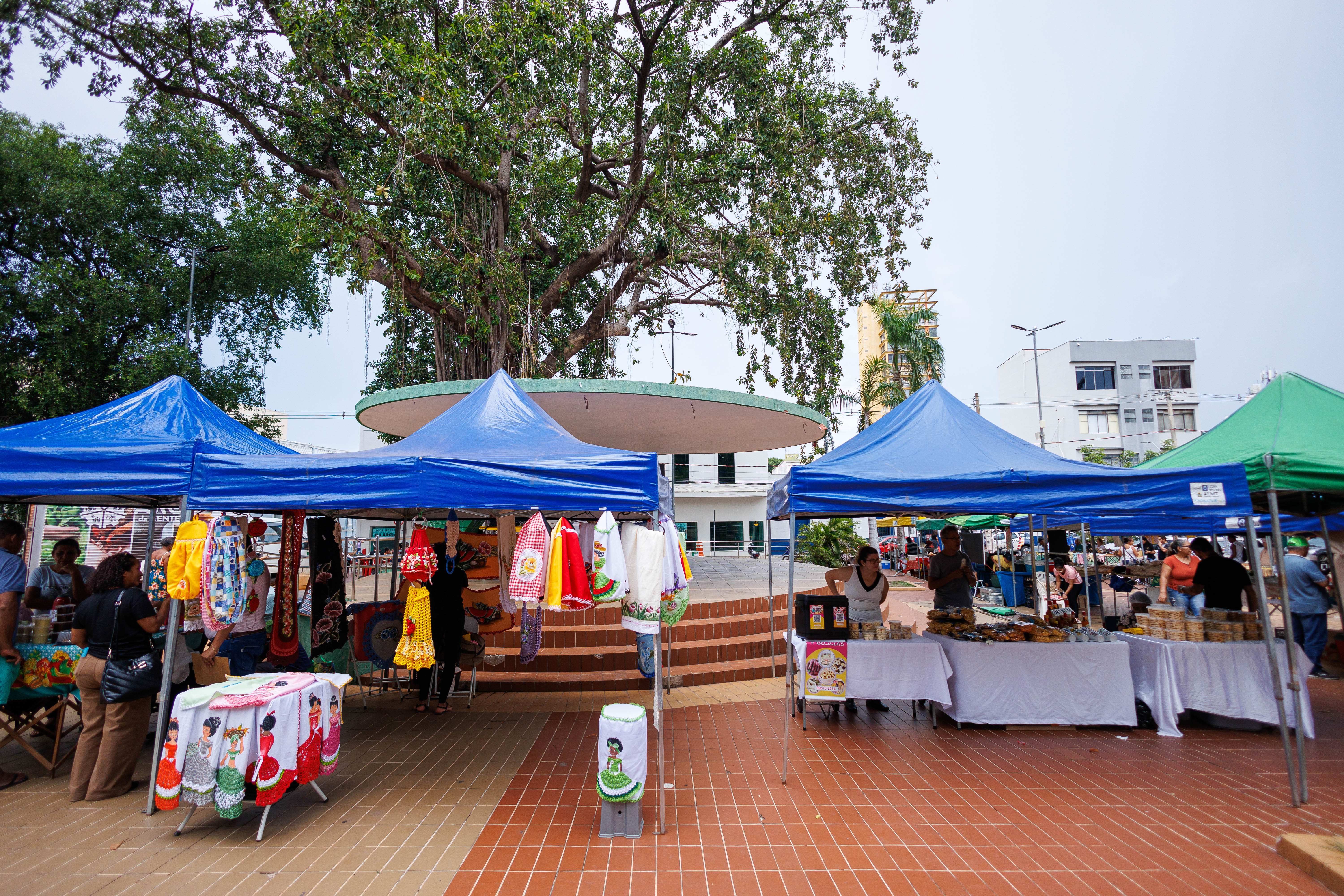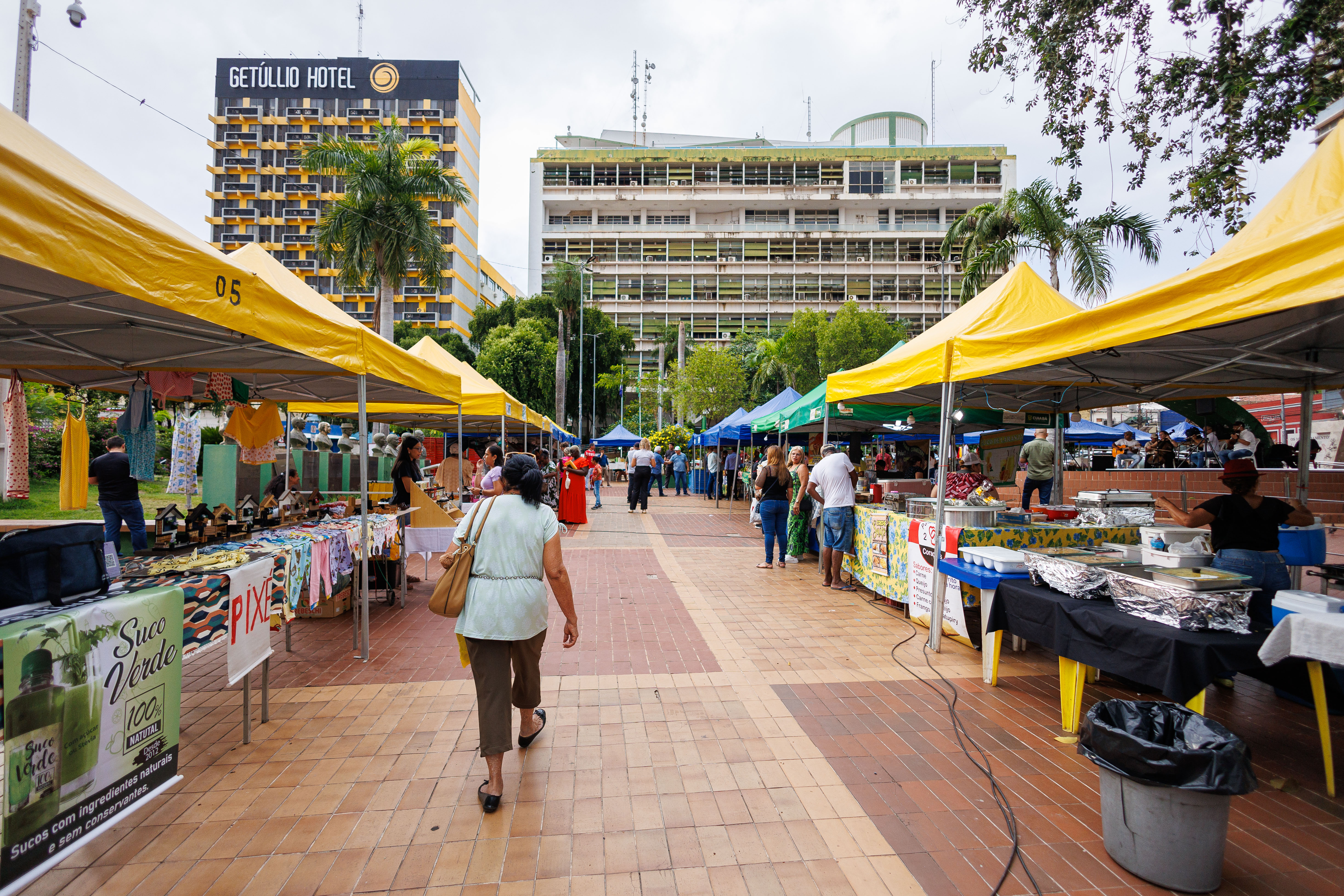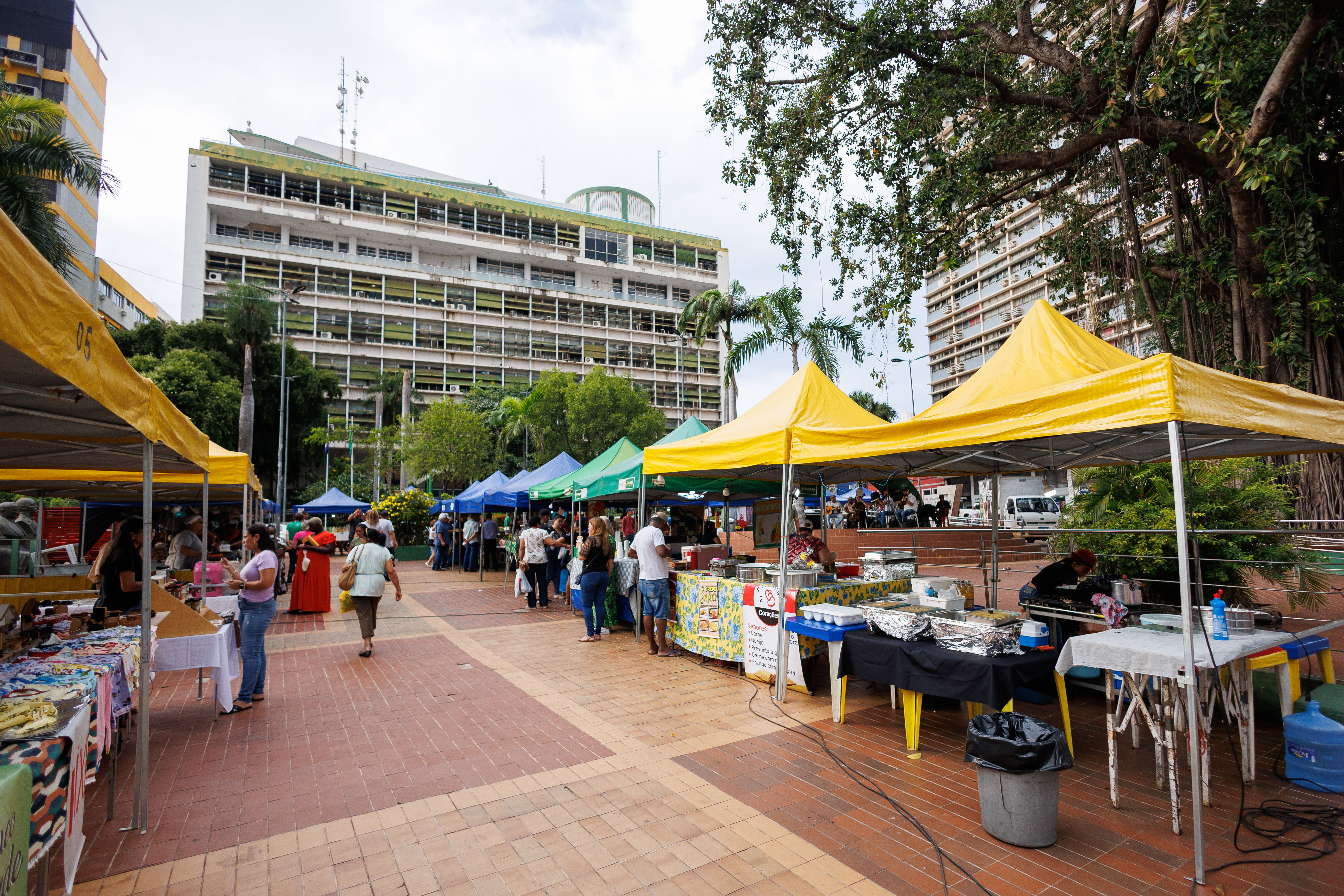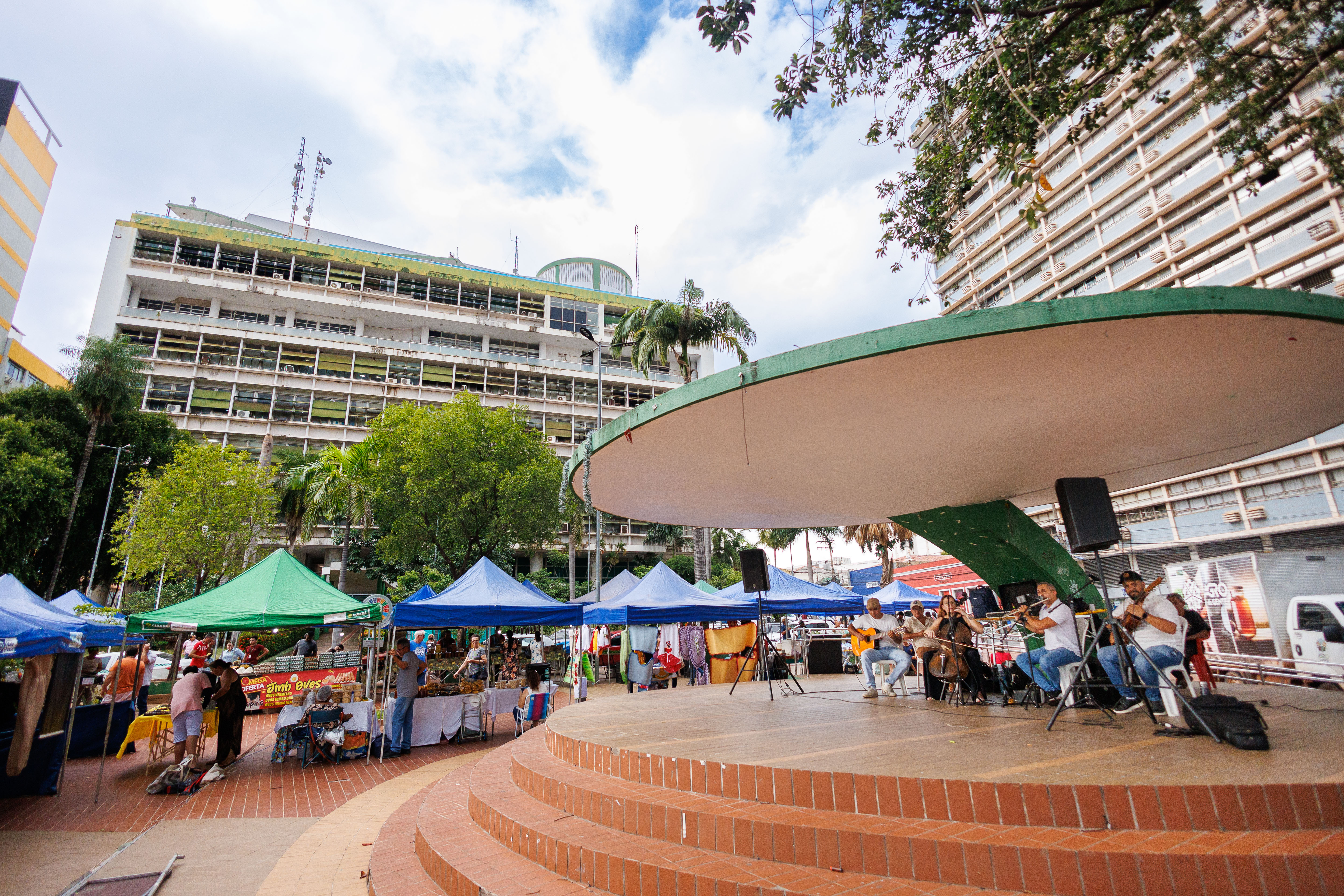 A imagem mostra um ambiente ao ar livre, com várias tendas dando a entender que se trata de uma feira para comercialização de produtos produzidos no campo. Há diversas pessoas visitando a feira. Ao fundo do cenário há um prédio alto, sendo o Palácio Alencastro, sede da Prefeitura de Cuiabá. Também tem um espaço para apresentações, denominado coreto. No coreto vários músicos com instrumentos musicais demonstram que estão em apresentação.