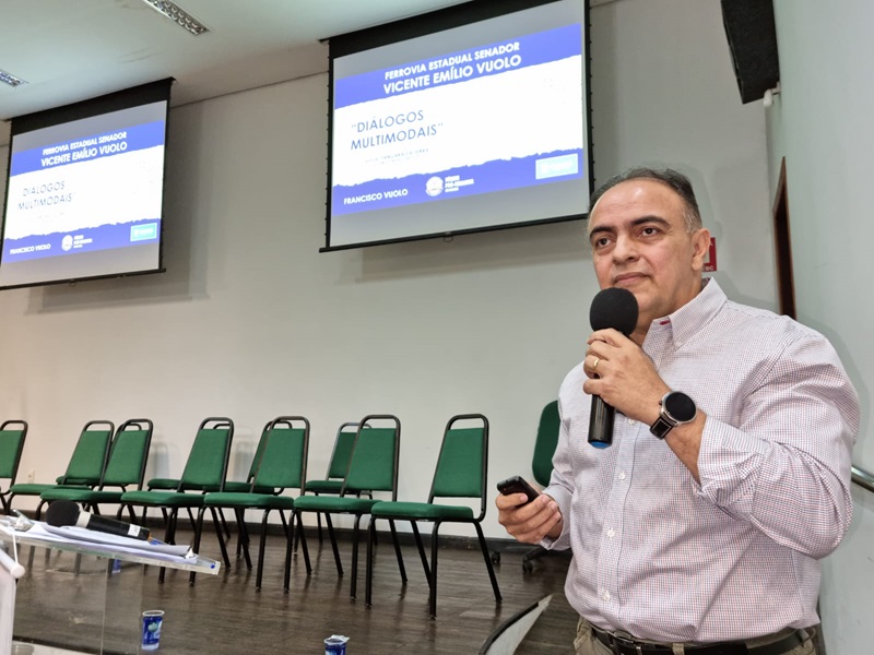 O secretário de Agricultura, Trabalho e Desenvolvimento Econômico de Cuiabá e presidente do Fórum Pró-Ferrovia, Francisco Vuolo, apresentou nesta segunda-feira (27), um panorama novo sobre a construção a Ferrovia Senador Vuolo em Mato Grosso durante o evento "Diálogos Multimodais" promovido pela Associação Comercial e Empresarial de Tangará da Serra (ACITS).