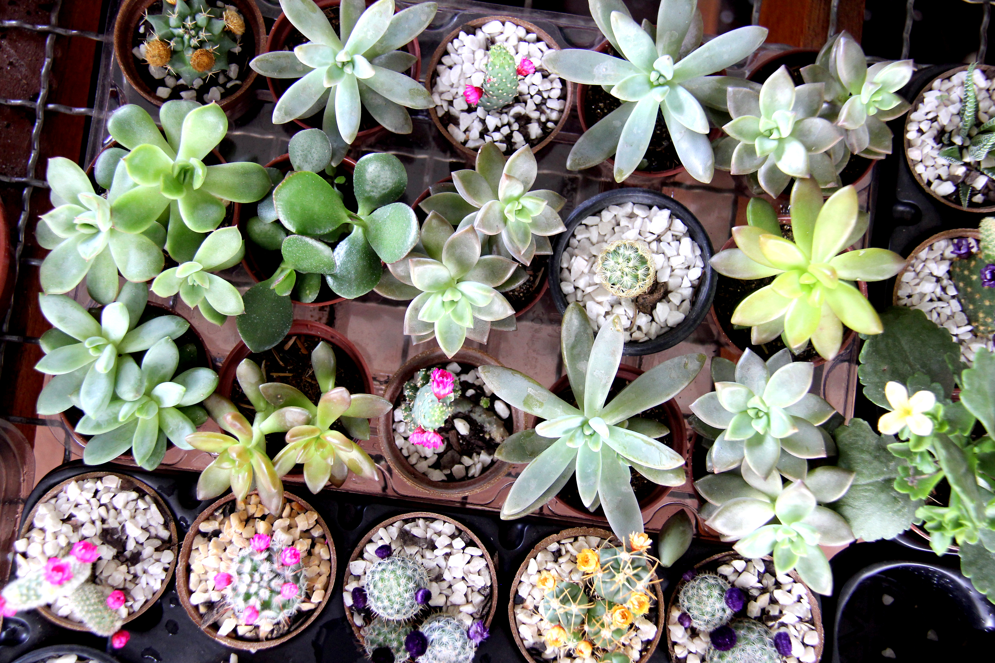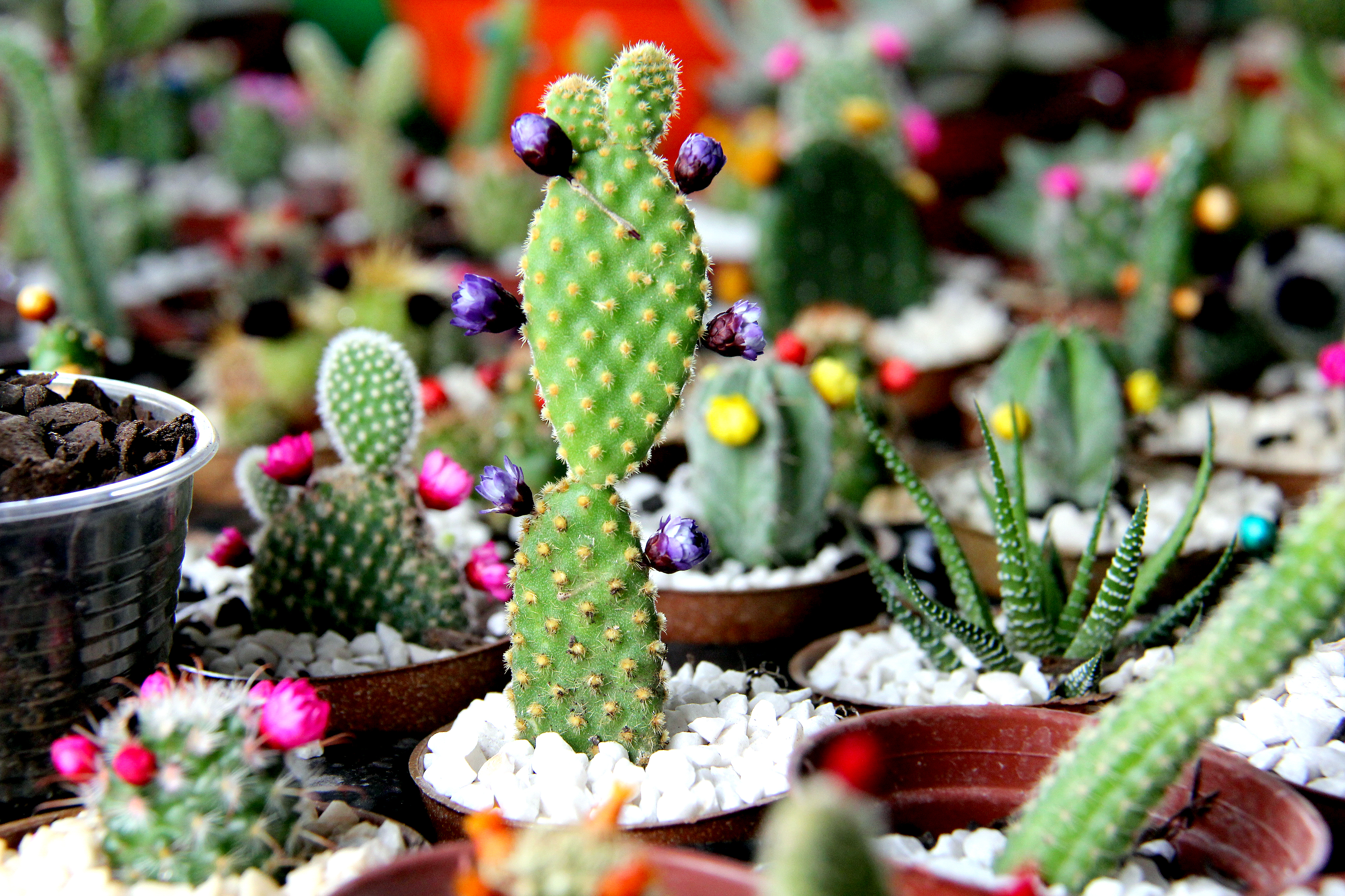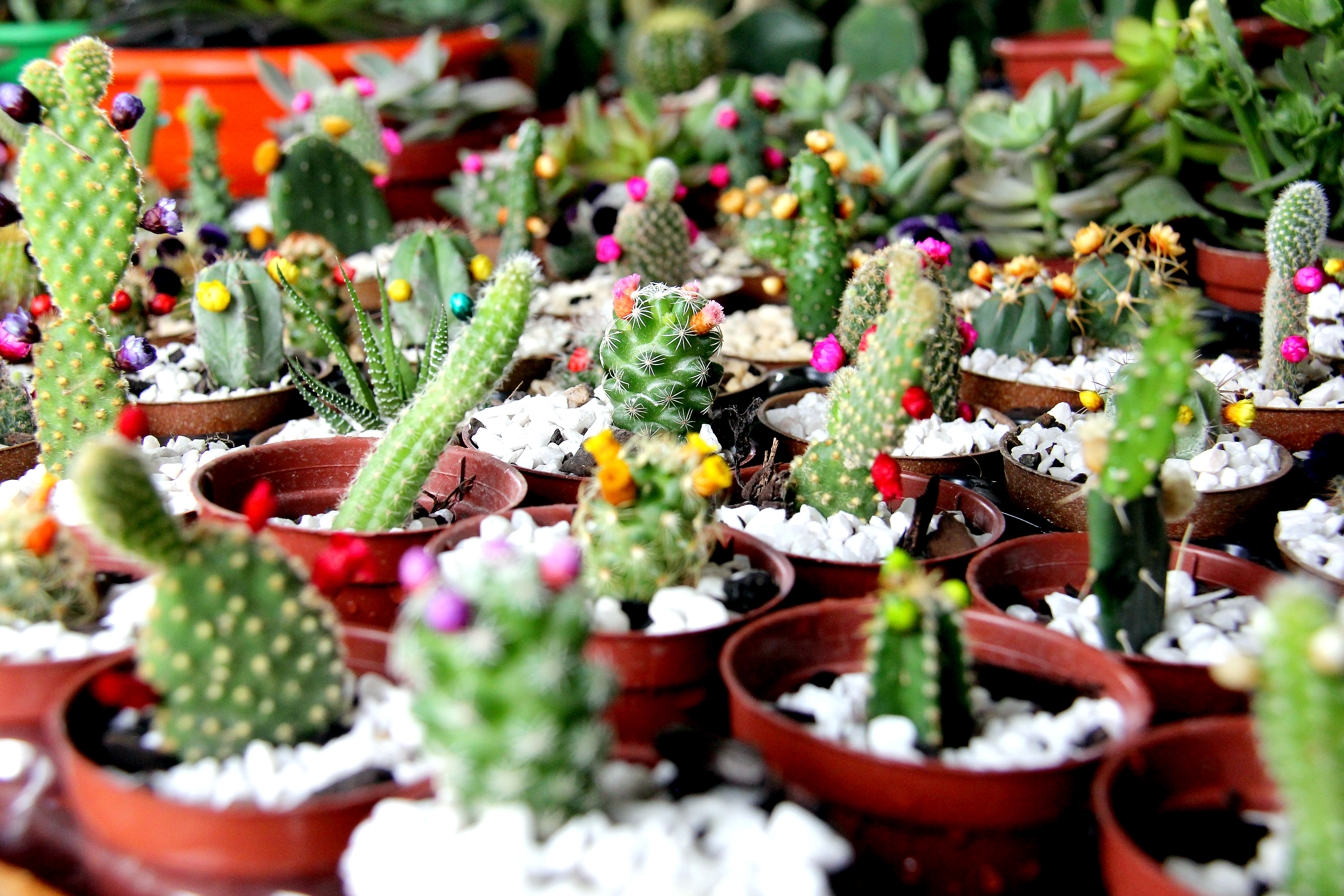 Os cactos são uma das espécies preferidas de quem gosta de cultivar versões miniatura para decorar ambientes. Não possuem folhas, e somente algumas dão flores quando adultos, geralmente uma vez por ano, na mesma época. A planta possui uma estrutura que permanece fechada sob sol forte, e sua pele é bem espessa e revestida, tudo para perder o mínimo de líquido possível. A grande maioria tem espinhos, alguns agudos e longos, outros são também cobertos de pelos. Os espinhos dos cactos servem de proteção contra animais, promovem sombra do sol intenso e impedem a circulação de ar pela epiderme da planta evitando a perda de água.