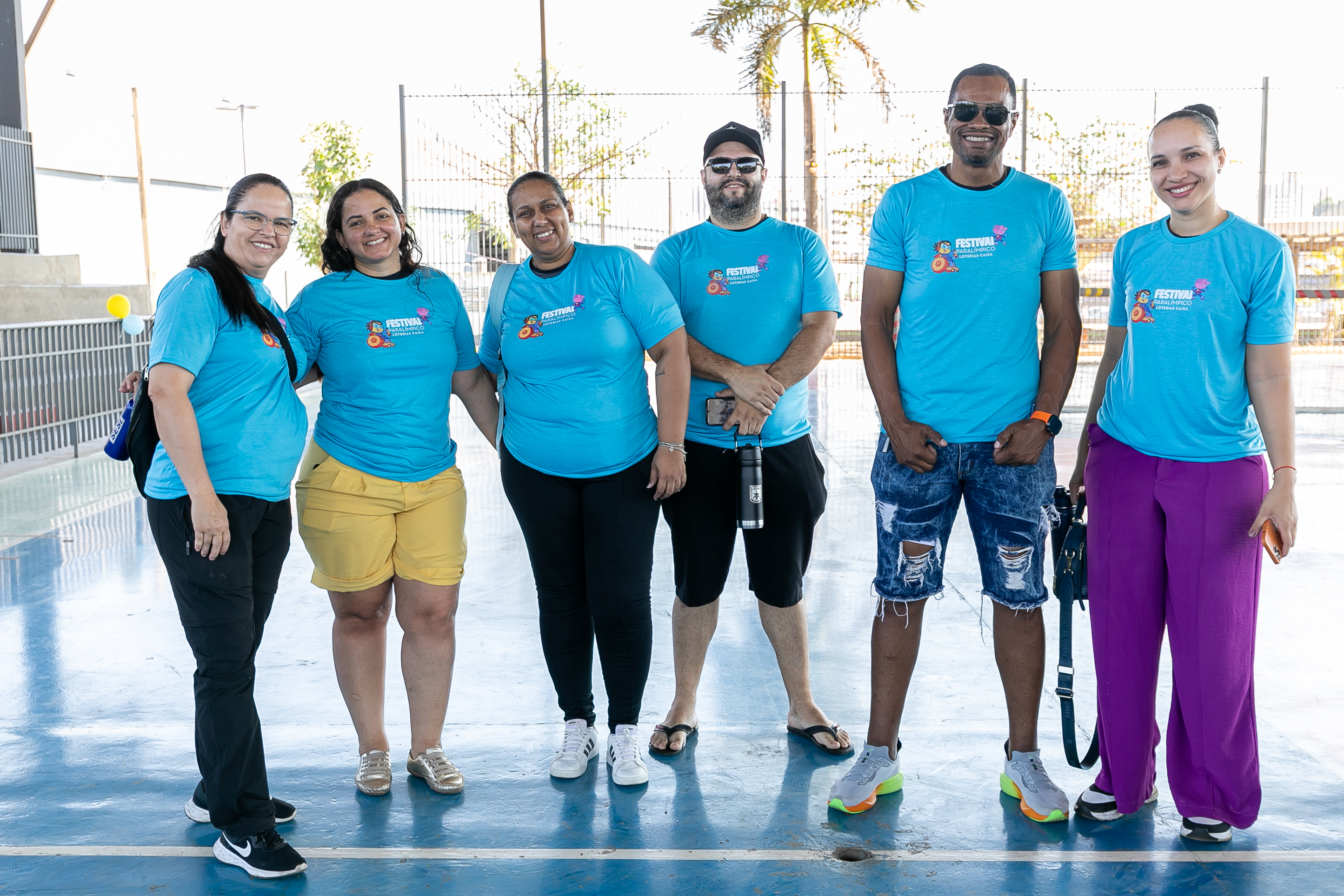 A imagem mostra participantes do 2º Festival Paralímpico reunidos para foto no Ginásio Dom Aquino.