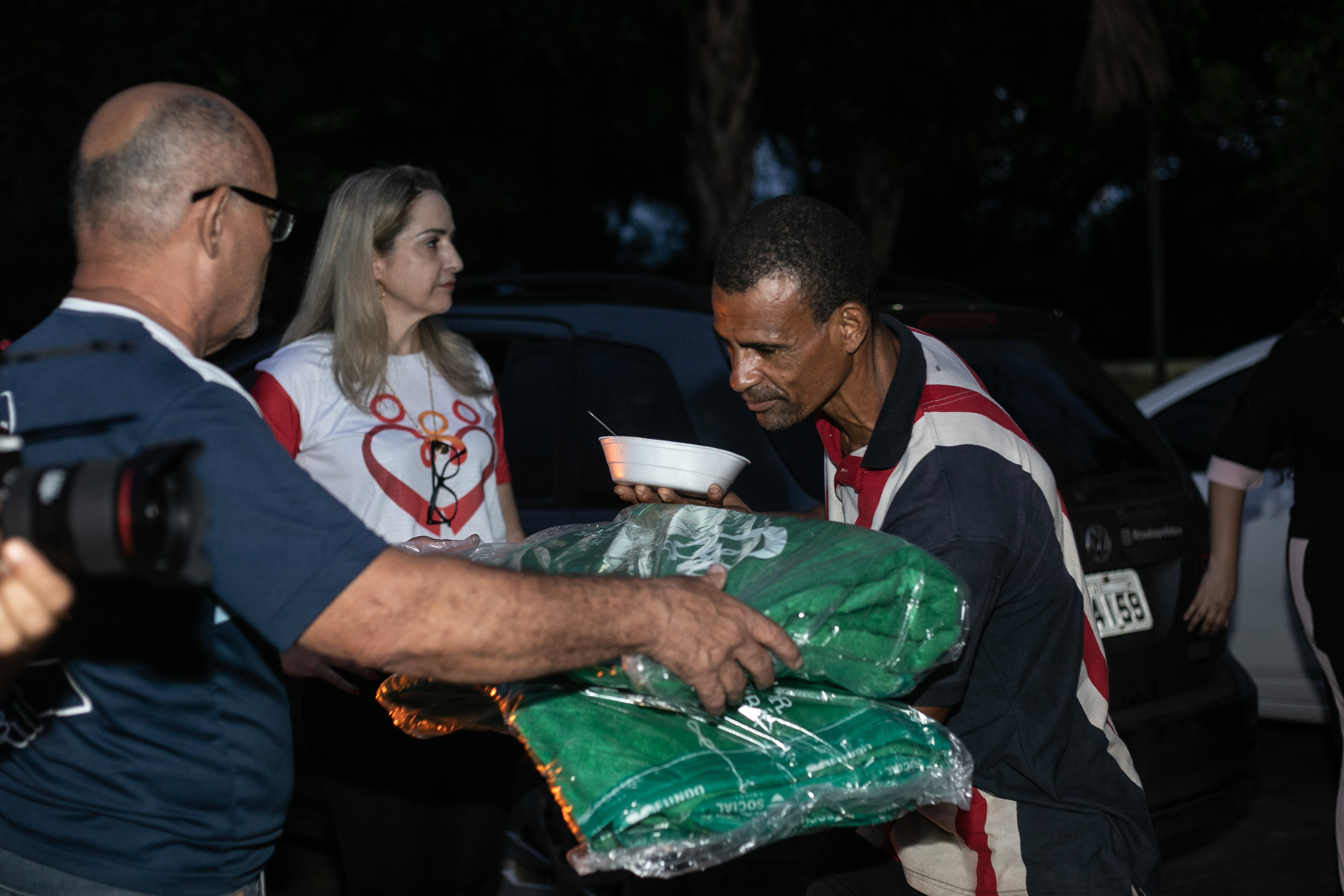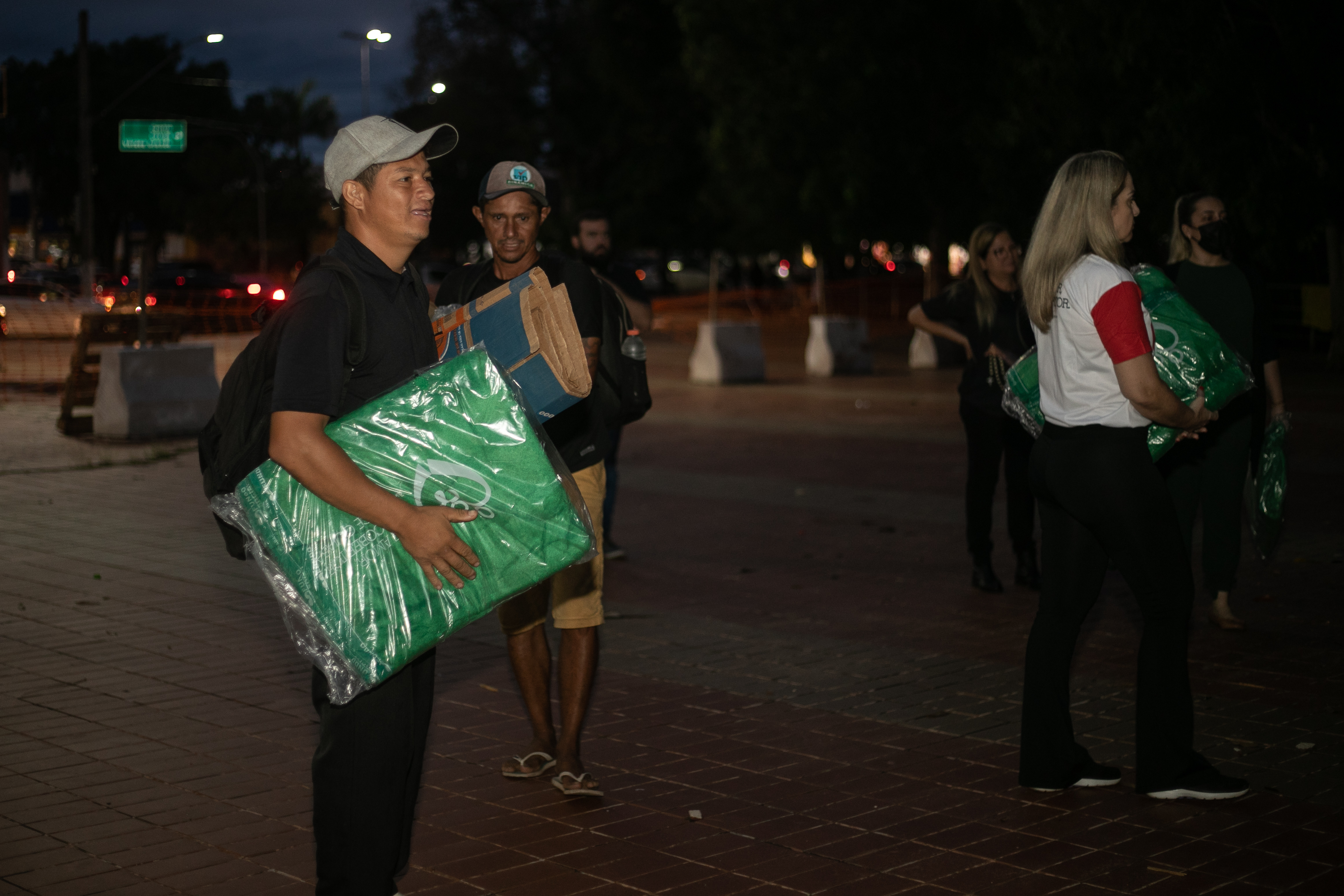 Nesta segunda-feira, foram distribuídos 250 cobertores da campanha Aquece Cuiabá, e quase 1 mil cobertores já foram destinados à população de rua este ano em duas previsões de frentes frias no mês passado.