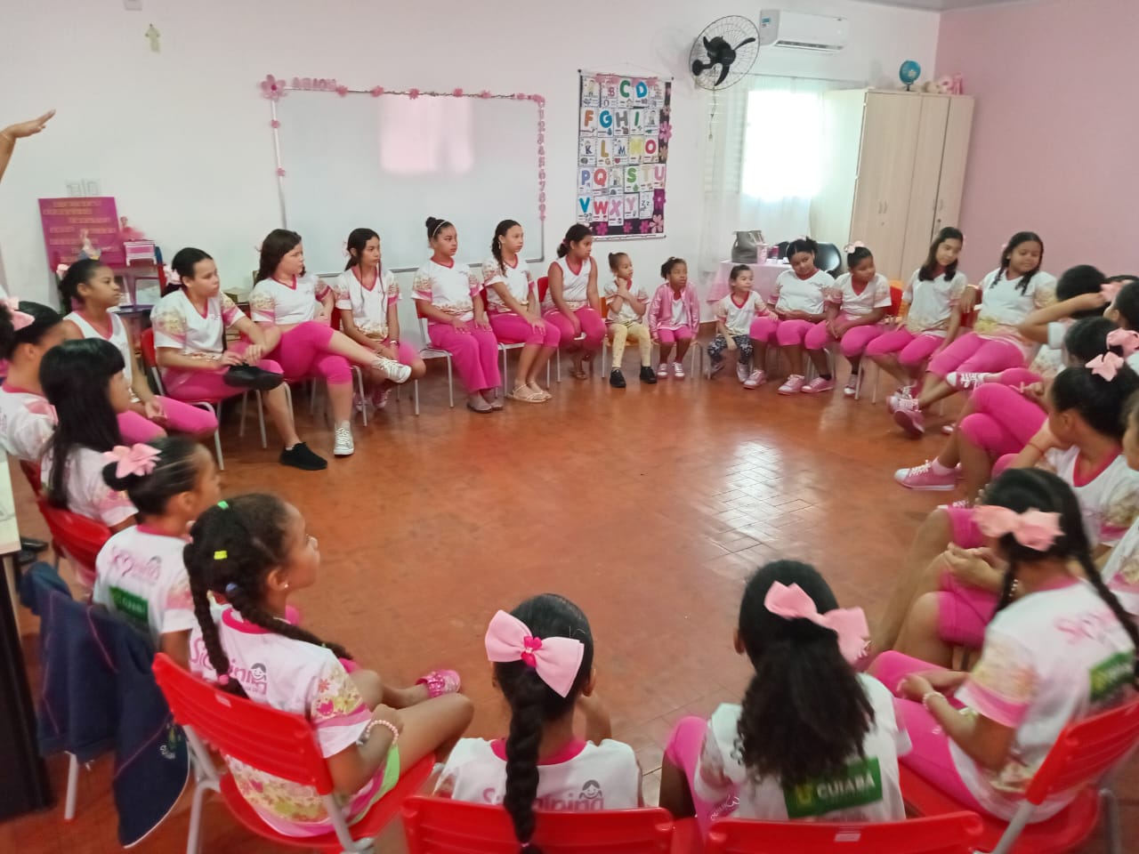 A imagem mostra as meninas do projeto Siminina reunidas em uma roda de conversa na unidade da Chácara dos Pinheiros.