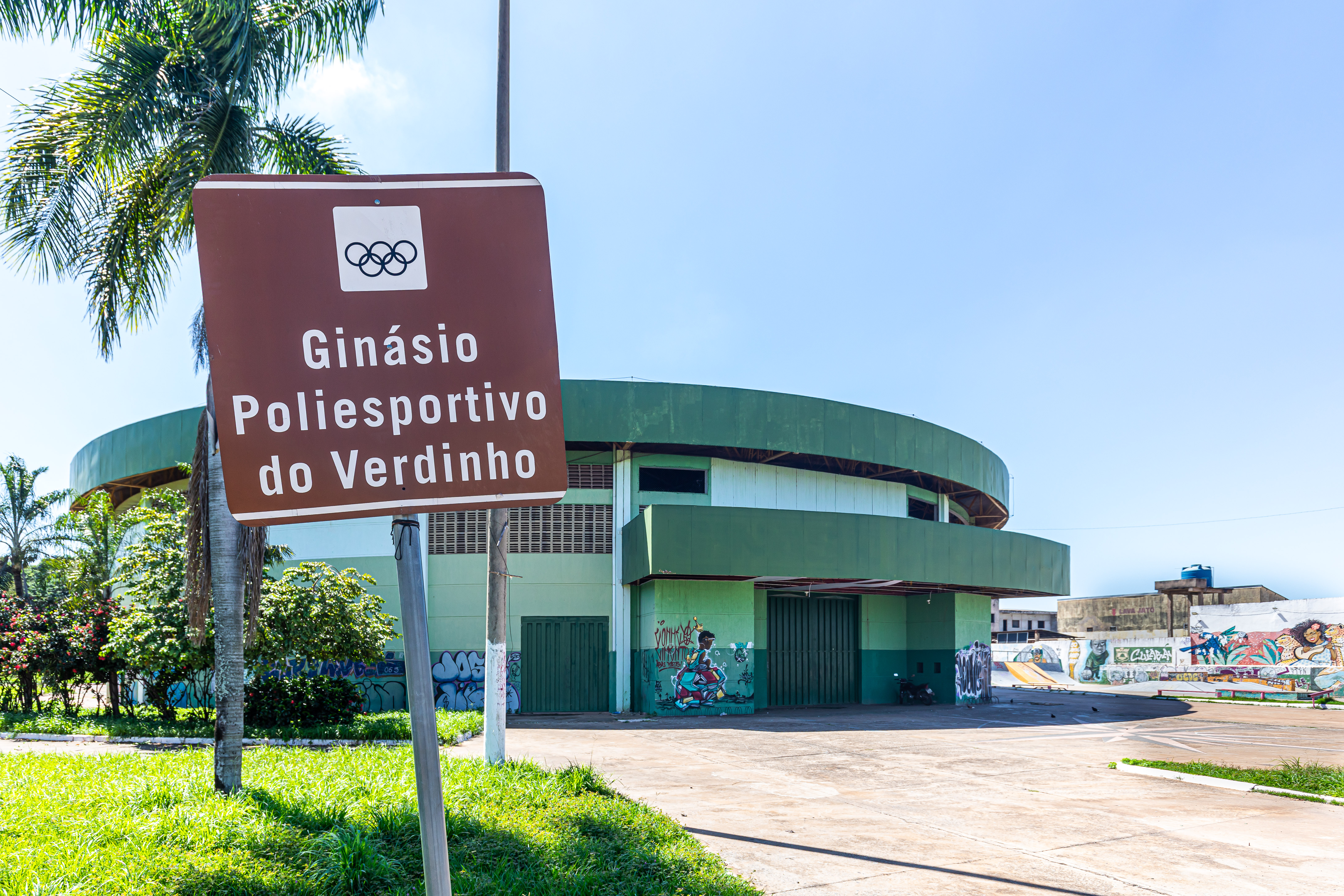 A imagem mostra a fachada do Ginásio Poliesportivo do Verdinho, no CPA I.