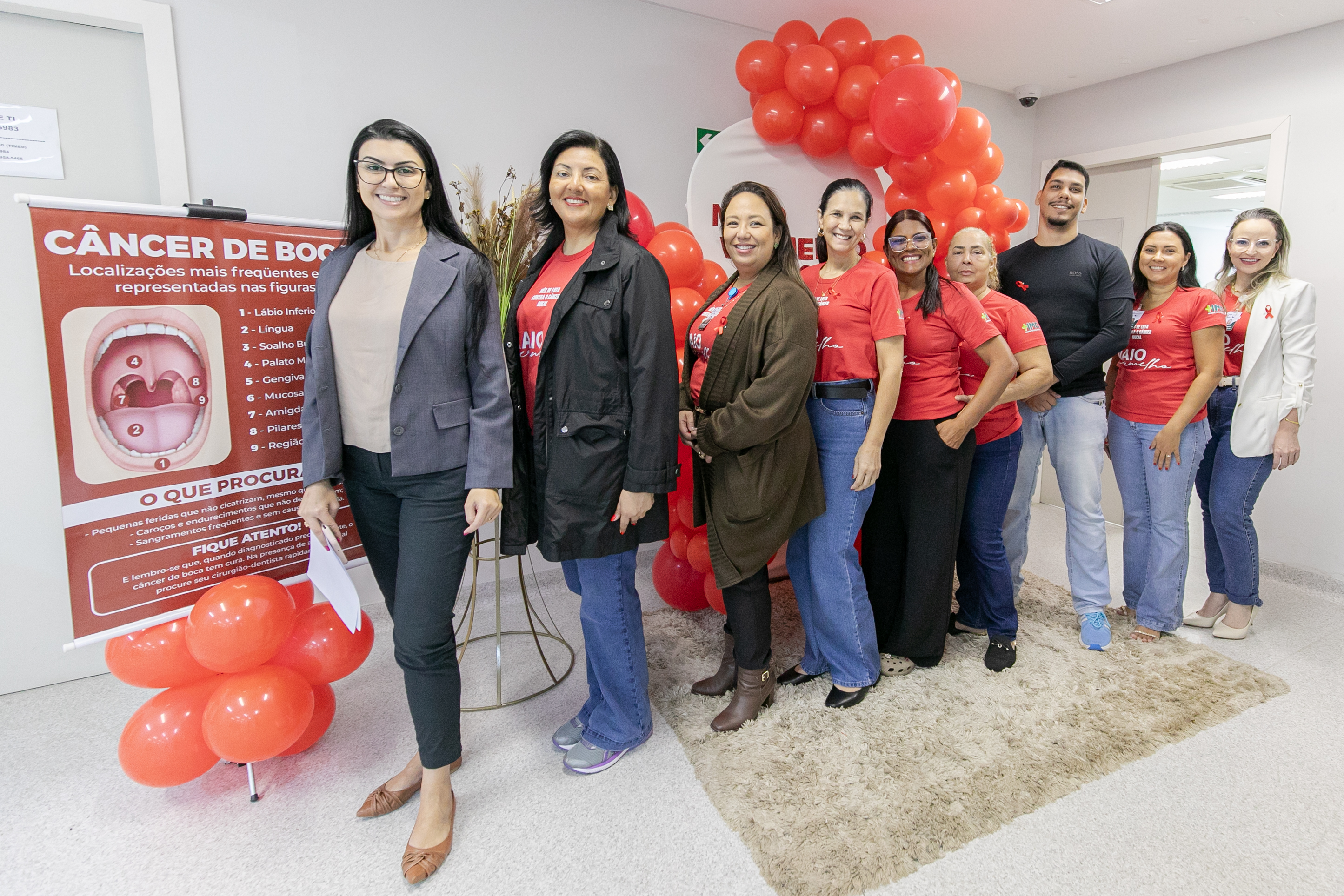 A imagem mostra um grupo de servidores que participou de uma ação de prevenção à saúde bucal. A maioria dos servidores usa roupas vermelhas, cor que simboliza a campanha.