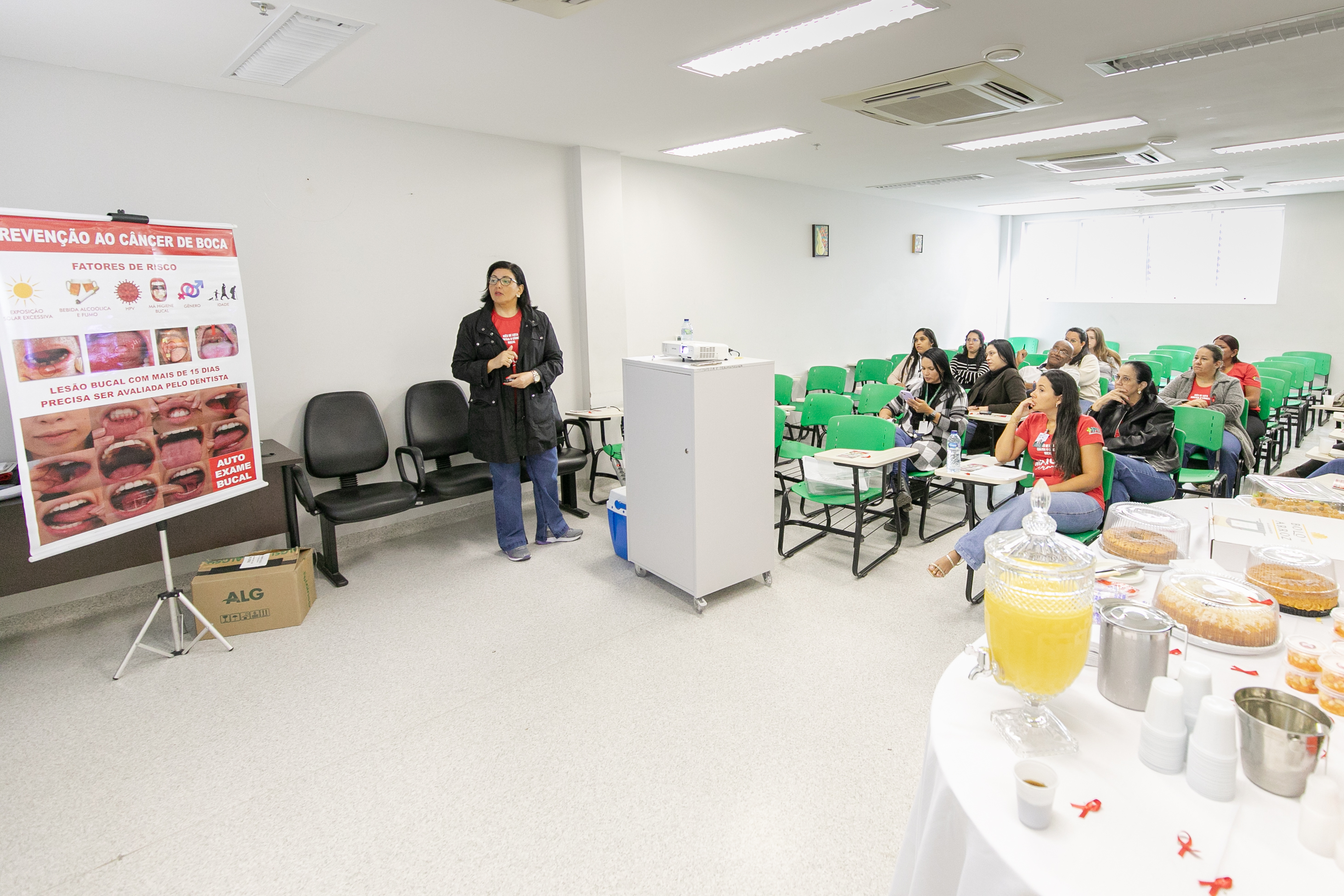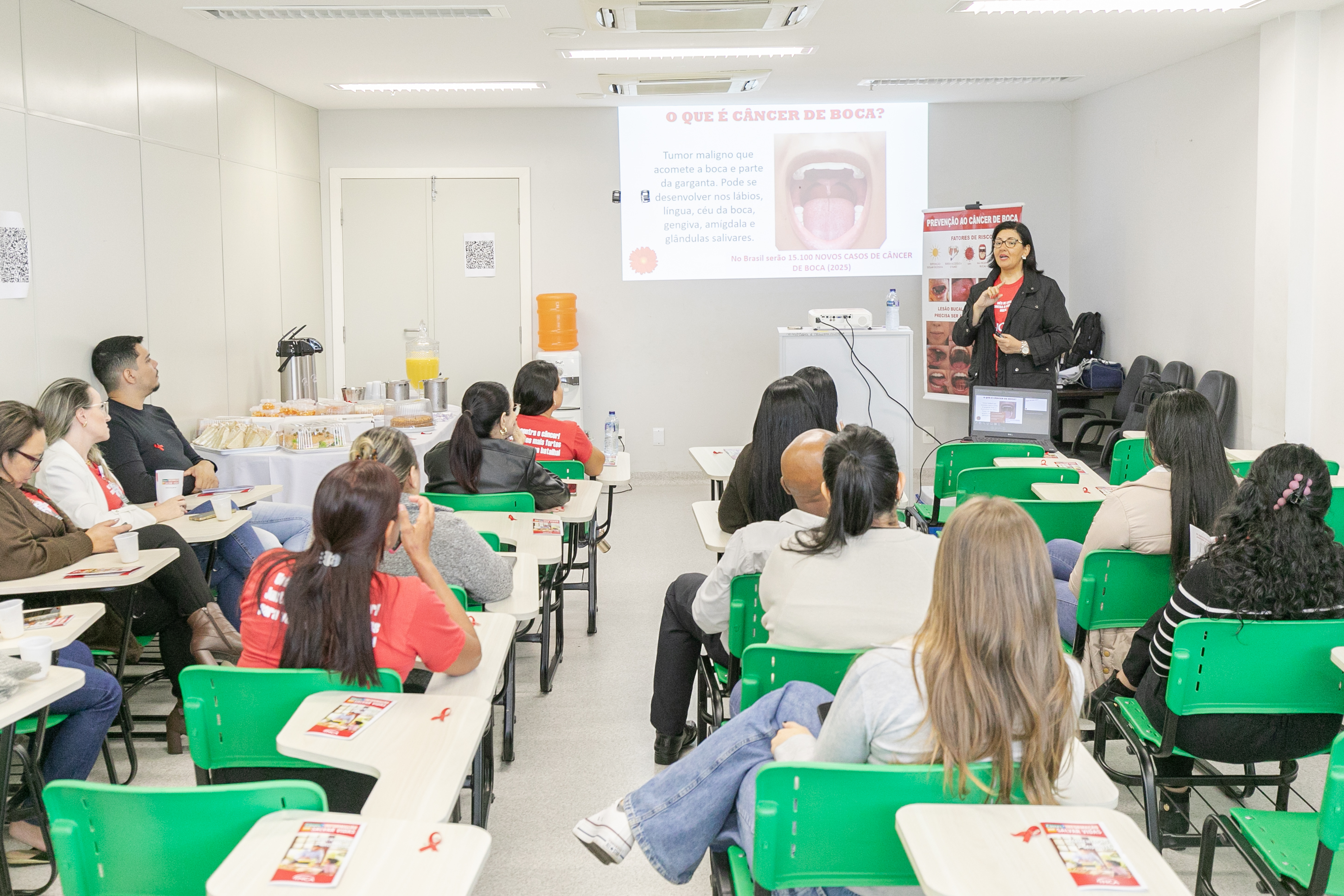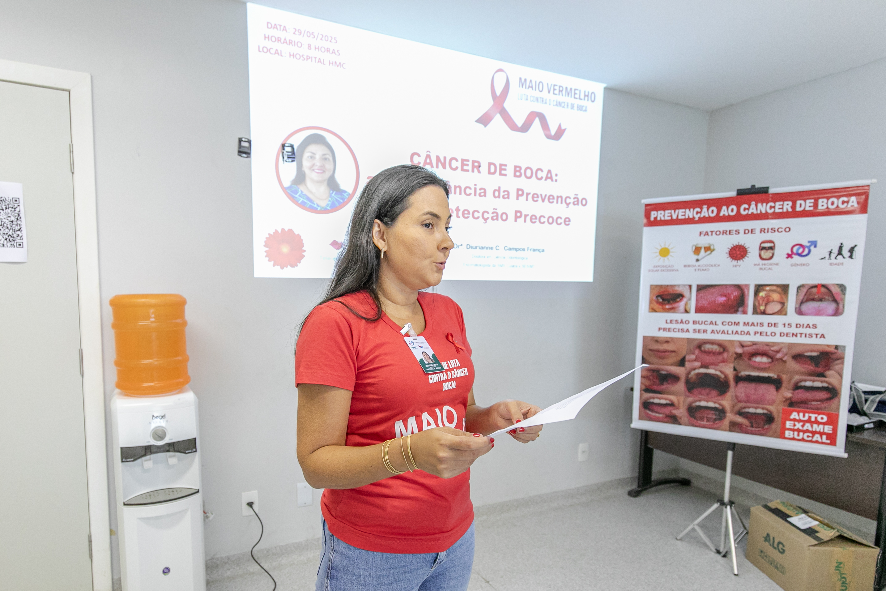 A ação contou com a presença da Dra. Diurianne França, doutora em Ciências Odontológicas e estomatologista da Secretaria Municipal de Saúde (SMS) de Cuiabá e da Secretaria de Estado de Saúde (SES-MT), que destacou a importância da iniciativa: “Hoje estamos seguindo a nossa programação do Maio Vermelho com diversas palestras ao longo do mês e viemos falar sobre o câncer de boca, a importância da prevenção e do diagnóstico precoce com os profissionais de saúde que atuam aqui. Estamos envolvendo o setor administrativo, técnicos de enfermagem, médicos, enfermeiros e, claro, toda a equipe de odontologia”, explicou a especialista.