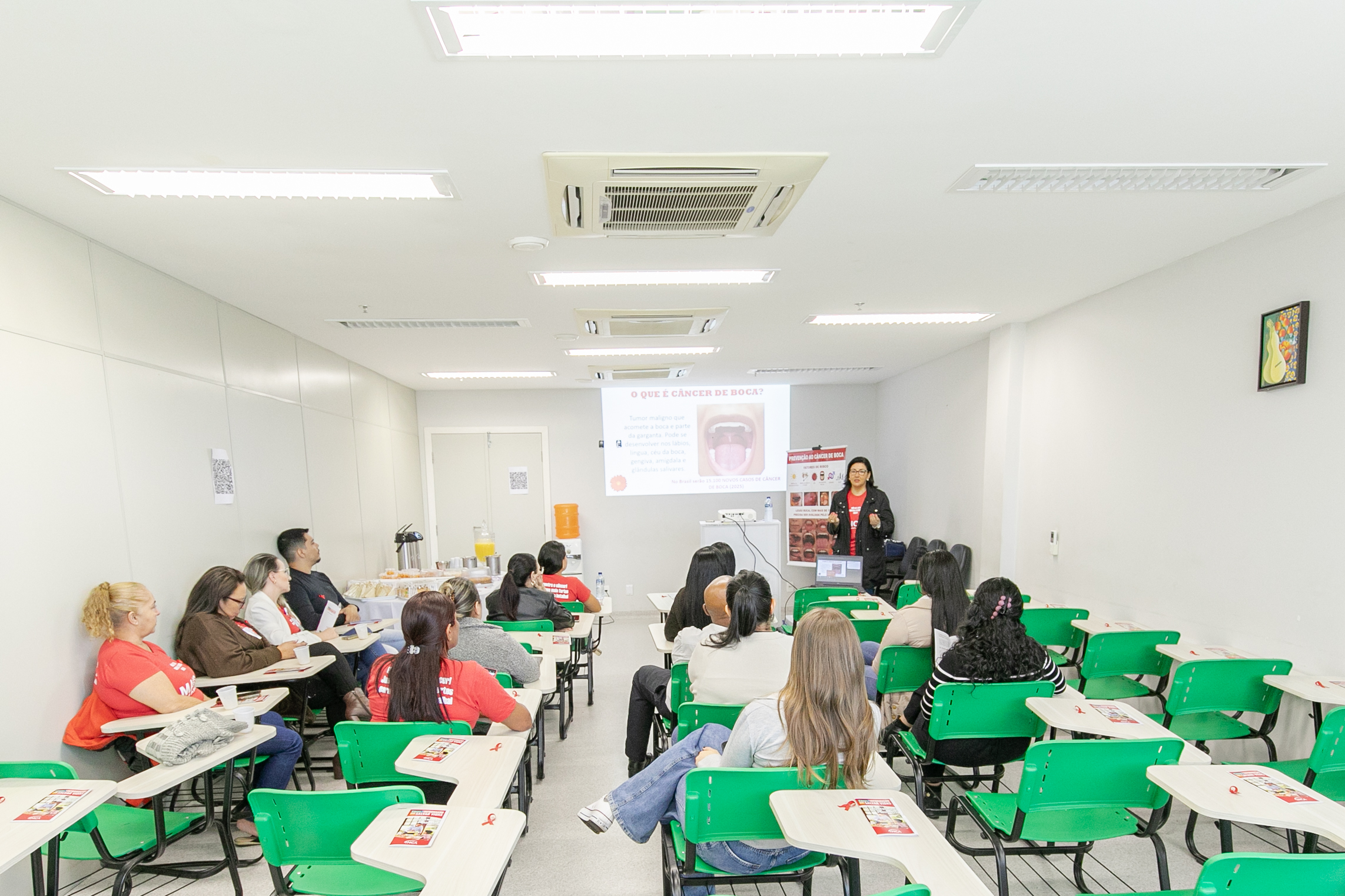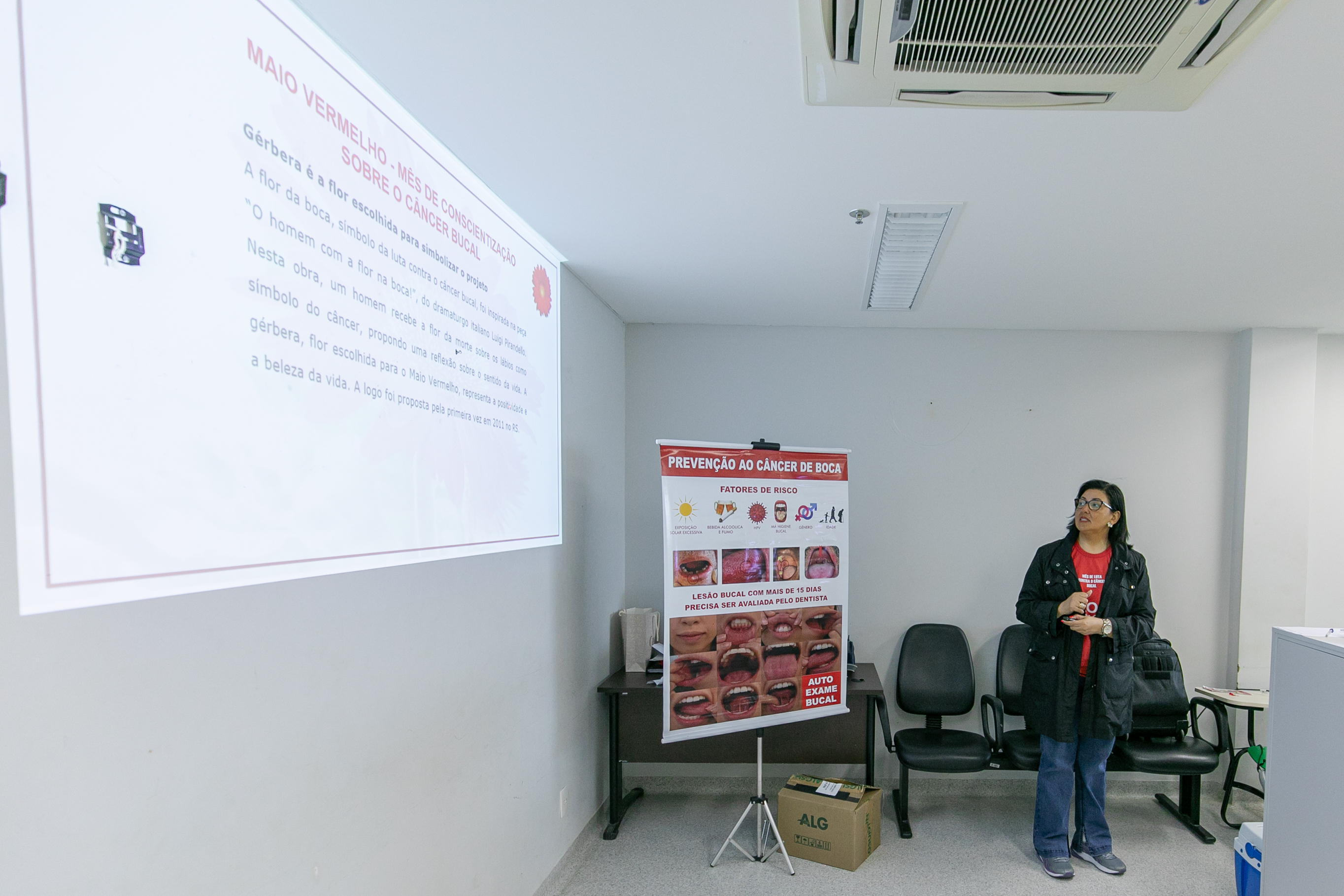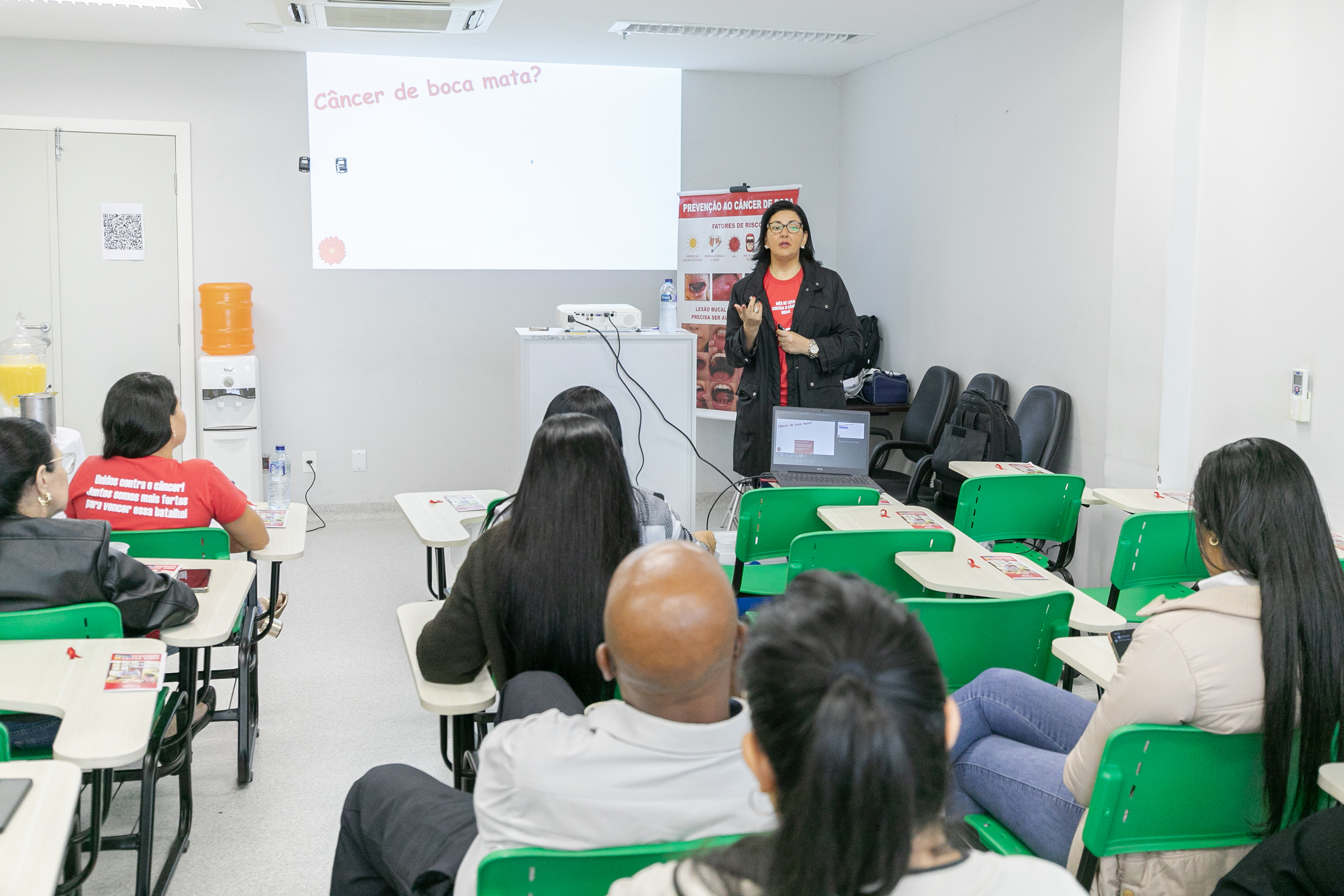 A ação contou com a presença da Dra. Diurianne França, doutora em Ciências Odontológicas e estomatologista da Secretaria Municipal de Saúde (SMS) de Cuiabá e da Secretaria de Estado de Saúde (SES-MT), que destacou a importância da iniciativa: “Hoje estamos seguindo a nossa programação do Maio Vermelho com diversas palestras ao longo do mês e viemos falar sobre o câncer de boca, a importância da prevenção e do diagnóstico precoce com os profissionais de saúde que atuam aqui. Estamos envolvendo o setor administrativo, técnicos de enfermagem, médicos, enfermeiros e, claro, toda a equipe de odontologia”, explicou a especialista.