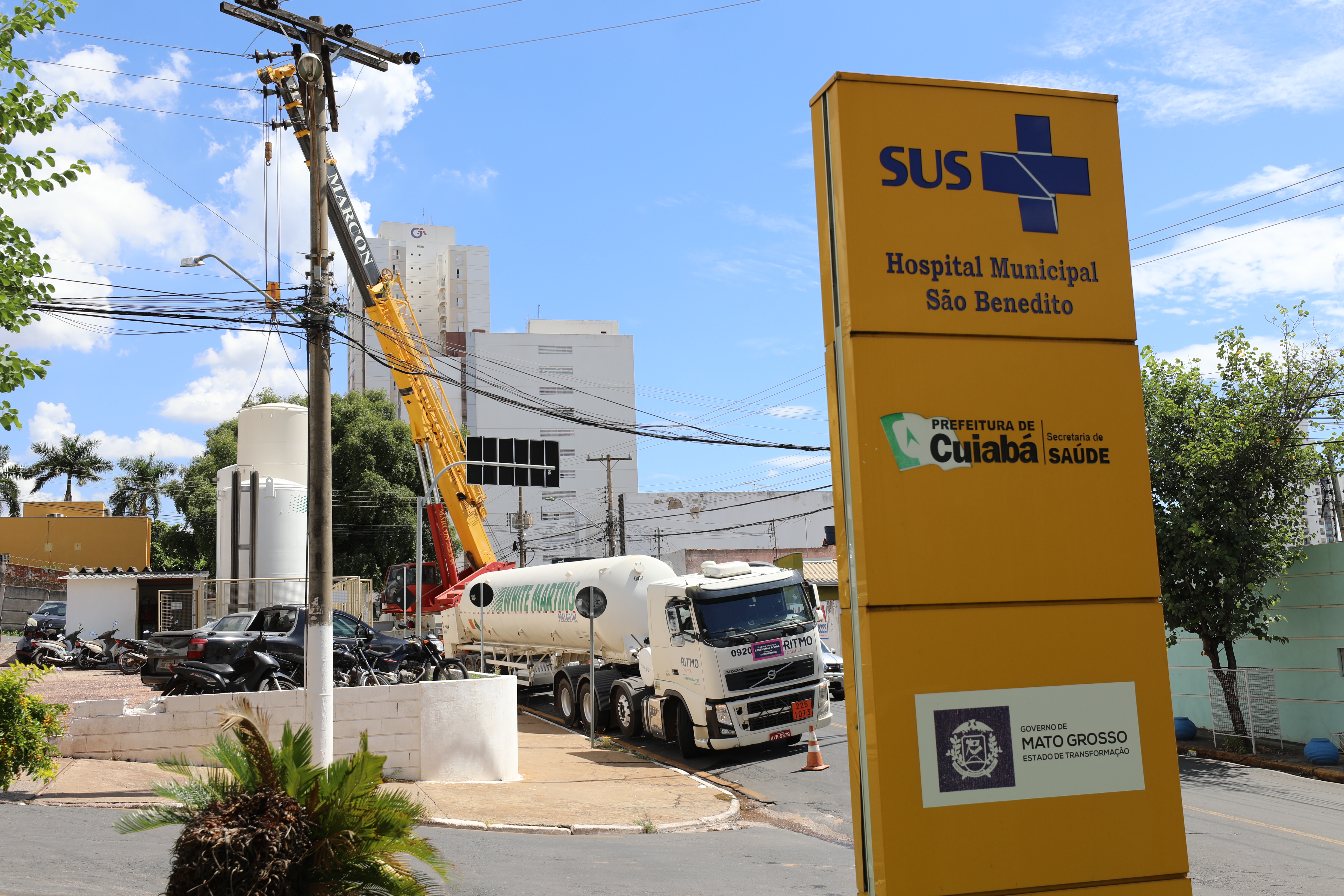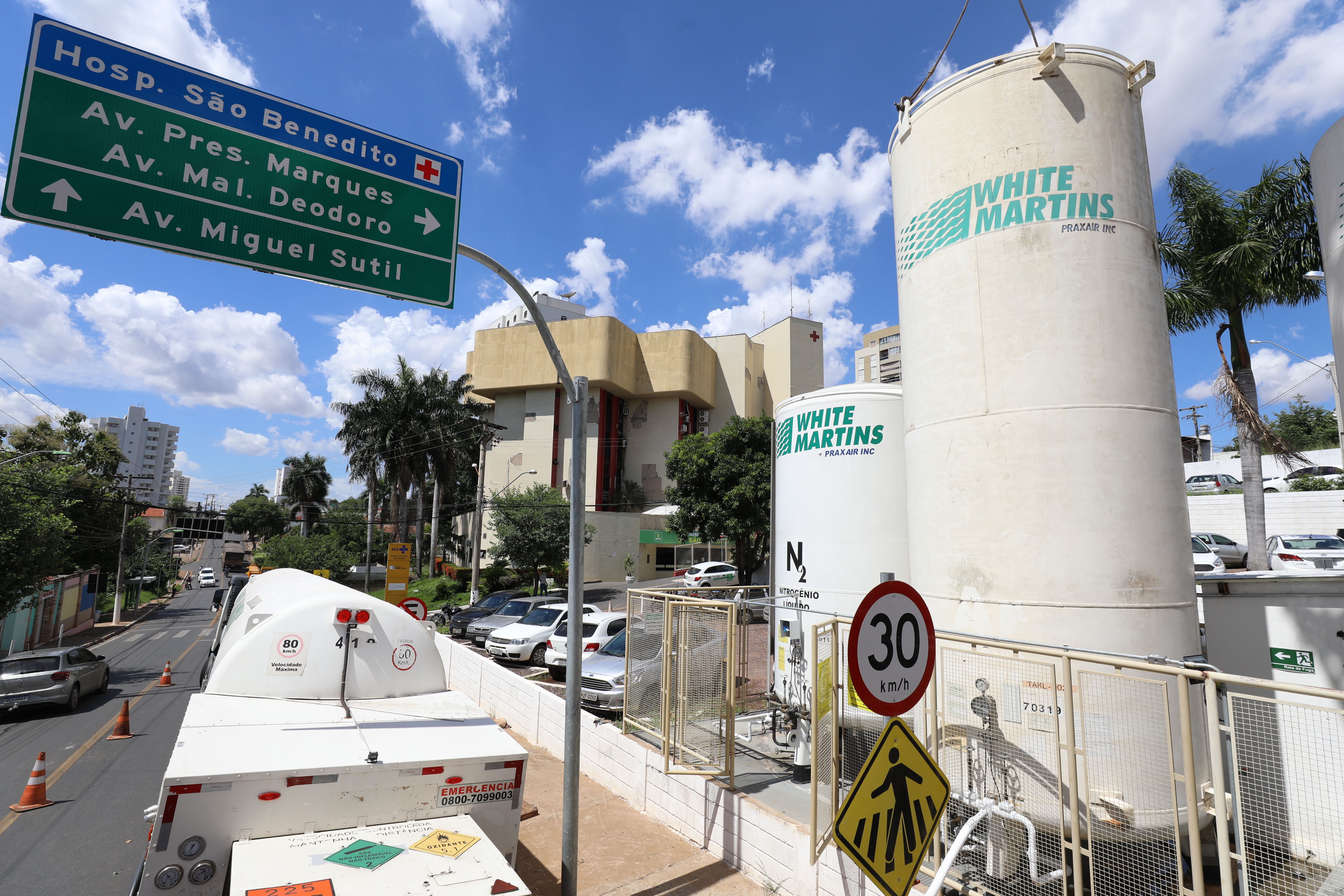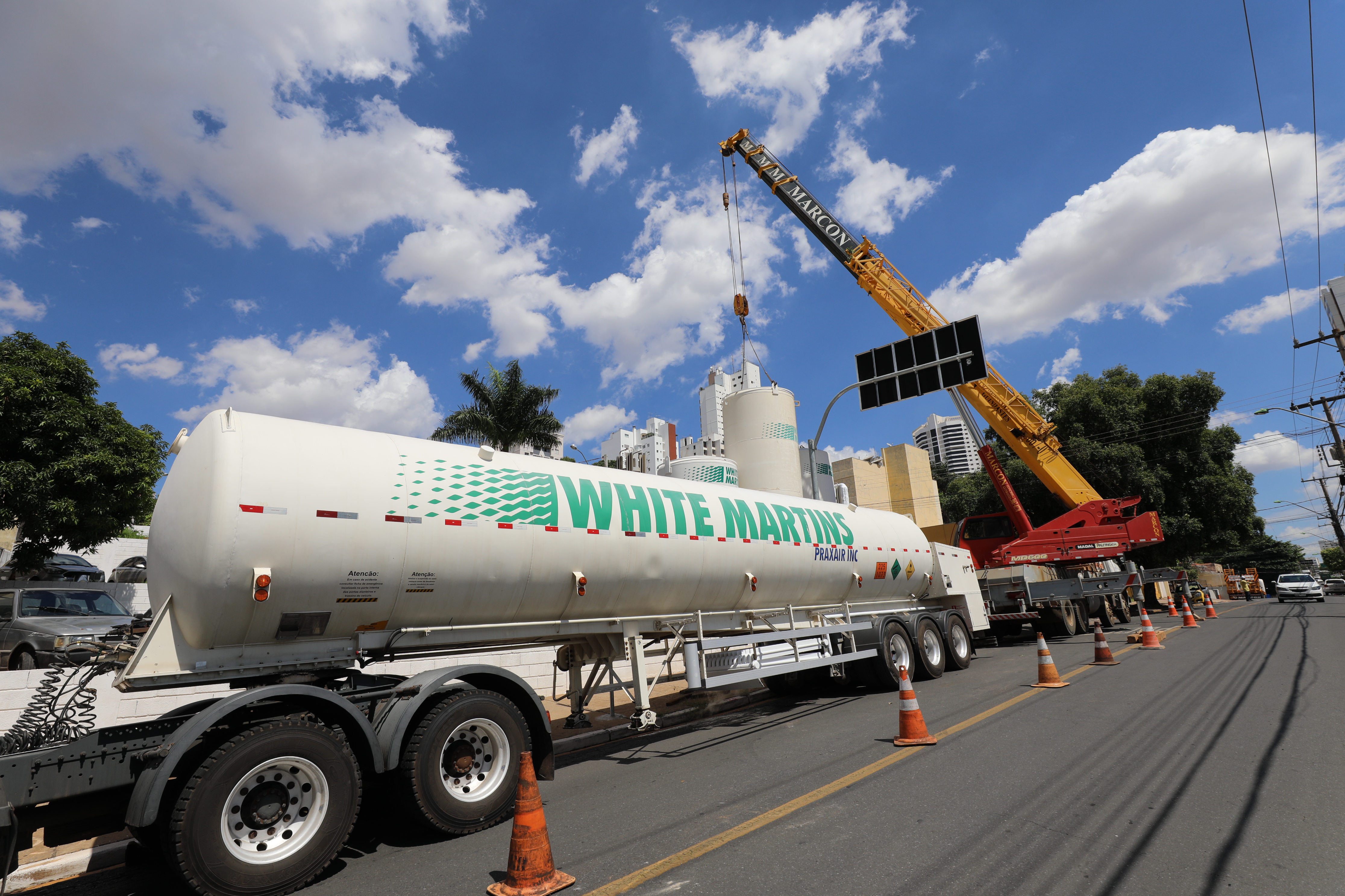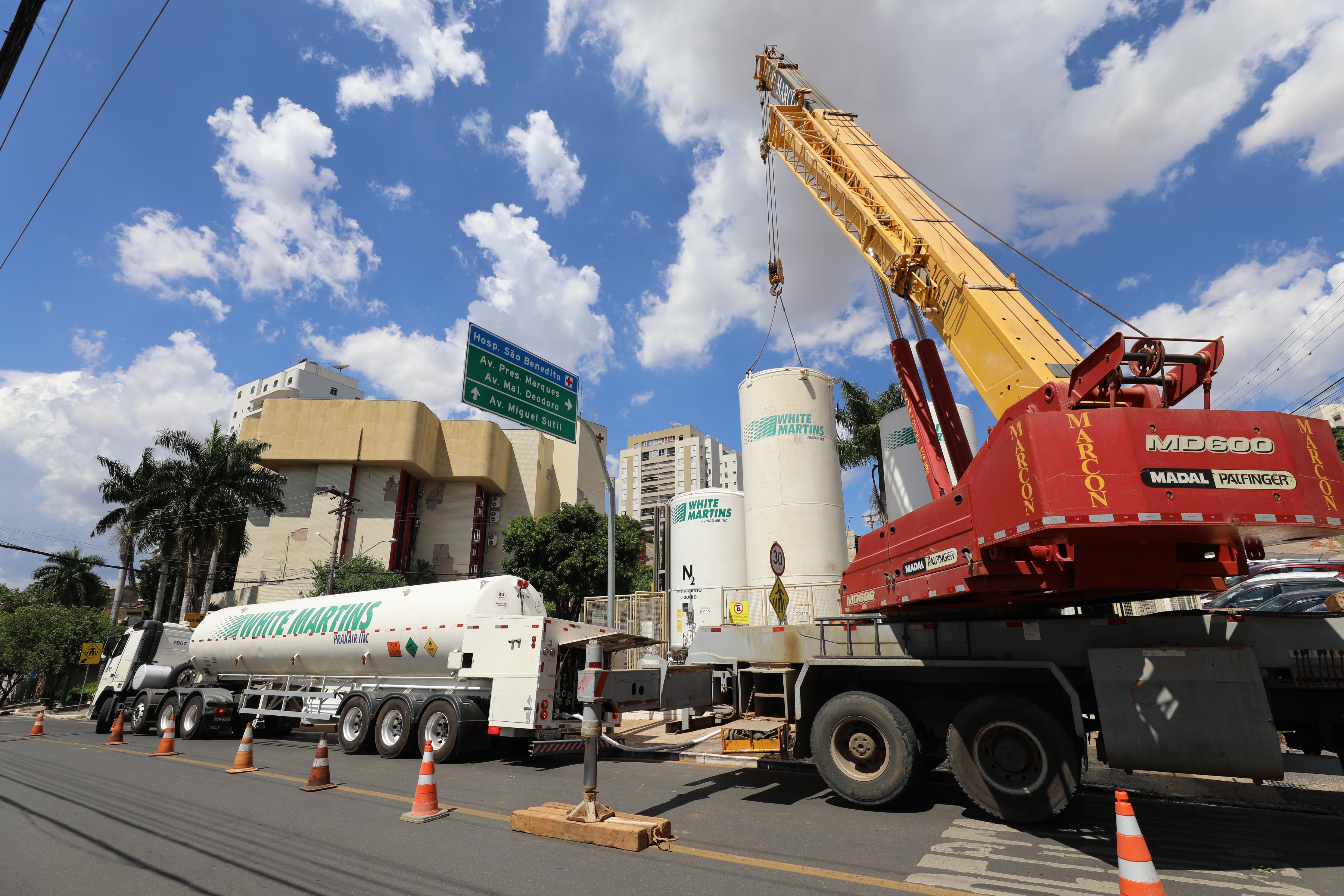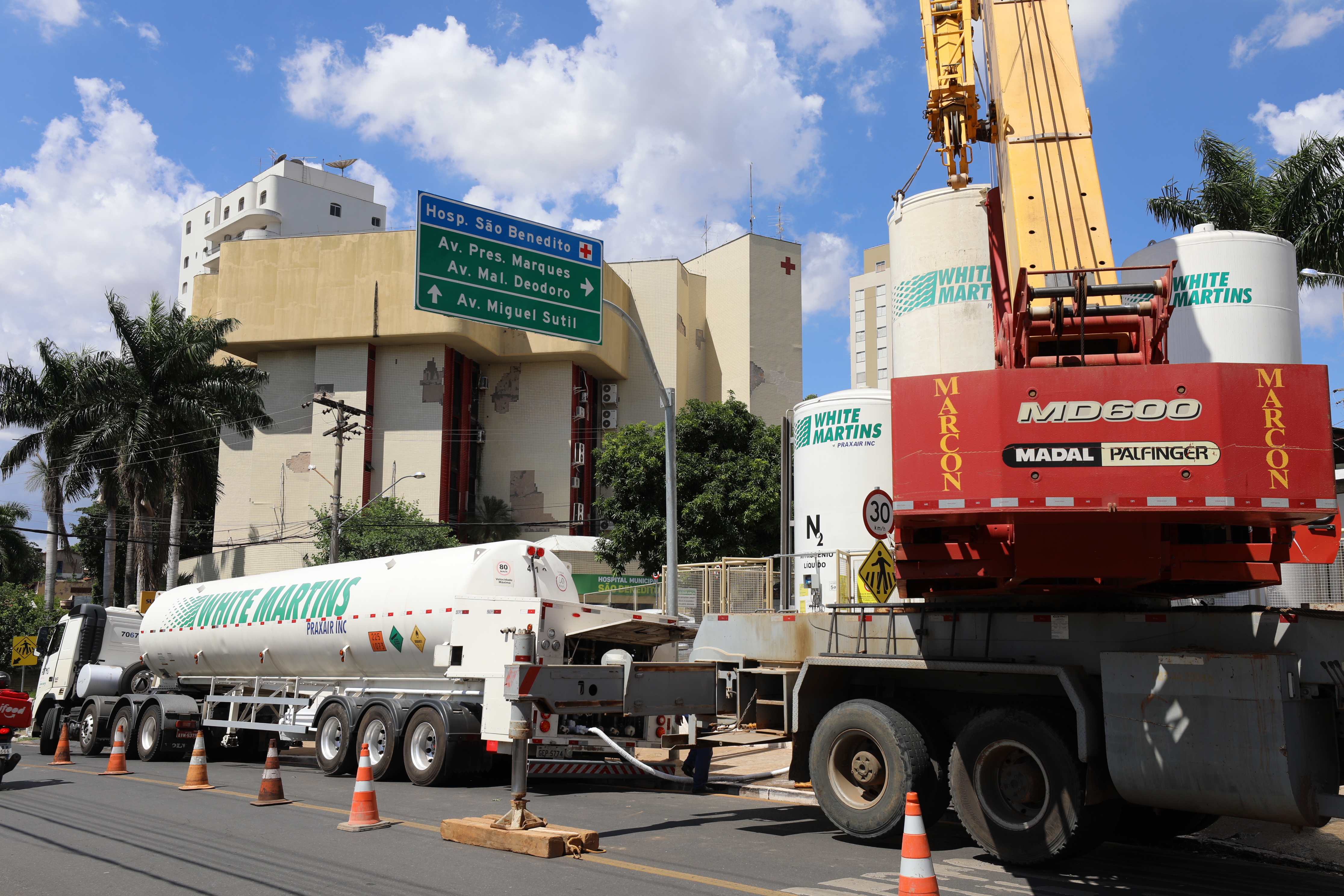 Durante toda esta quinta-feira (25), cerca de 15 pessoas estão trabalhando na troca do tanque de oxigênio líquido hospitalar do Hospital São Benedito, visando prevenir qualquer risco de desabastecimento. Com a ajuda de dois guindastes, o antigo reservatório de 8.530 metros cúbicos está sendo trocado por outro de 19.166 metros cúbicos. O trabalho começou por volta das 7h e tem previsão de terminar por volta das 19h. Agentes de trânsito da Secretaria Municipal de Mobilidade Urbana (Semob) fecharam o trecho da Rua São Sebastião e atuam no local para orientar os condutores. “O São Benedito mostrou hoje o que é gestão planejada, que organiza, que tem responsabilidade e que preza pela saúde e pela vida das pessoas. Oxigênio não é problema de Cuiabá”, comentou o prefeito Emanuel Pinheiro.