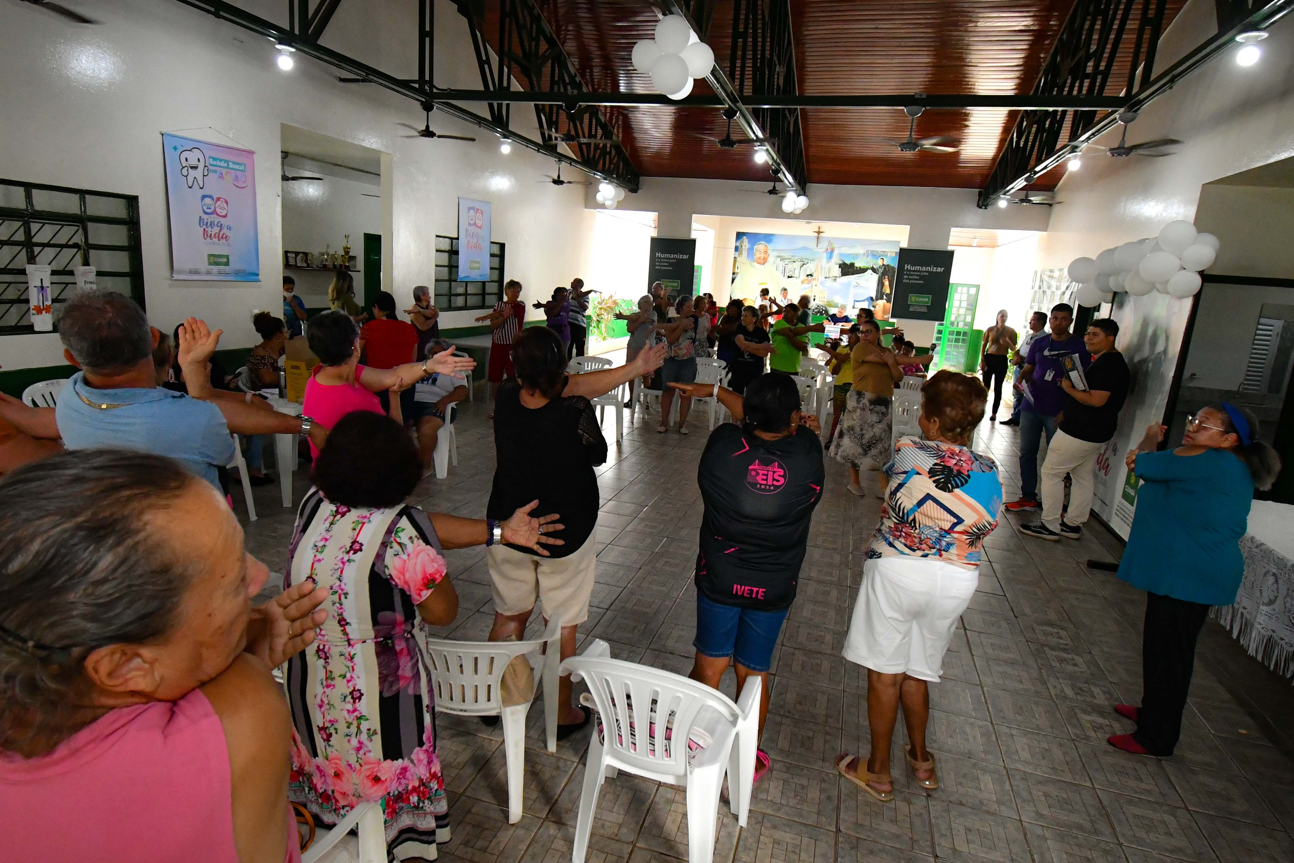 Durante o evento, foram ofertados atendimentos médicos em diversas especialidades, como clínica geral, geriatria e dermatologia, além de práticas integrativas. Enquanto aguardavam as consultas, os idosos participaram de atividades de alongamento, promovendo bem-estar físico.
