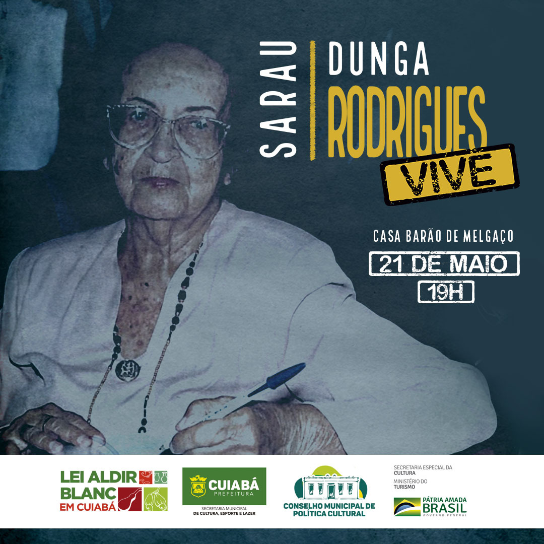 O Sarau Dunga Rodrigues Vive realizará, na próxima sexta-feira (21), às 19h, na Casa Barão de Melgaço um evento em homenagem a esta imortal da Academia Mato-grossense de Letras (AML), que deixou um legado inestimável, não somente na música, mas em todos os campos de sua atuação cultural. O sarau é fruto de projeto aprovado em edital da Lei Federal Aldir Blanc em Cuiabá, executado pela Secretaria de Cultura, Esporte e Lazer, com apoio do Conselho Municipal de Política Cultural de Cuiabá. Seguindo todos os protocolos sanitários, o sarau será gravado e disponibilizado posteriormente no Youtube para acesso do público a partir do dia 24 de maio