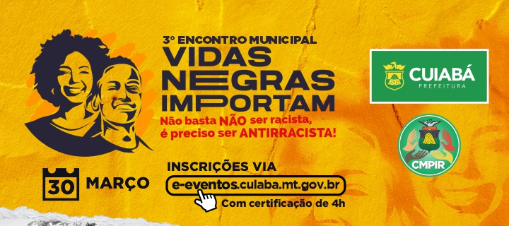 A Prefeitura Municipal de Cuiabá, por meio da Secretaria Municipal de Assistência Social, Direitos Humanos e da Pessoa com Deficiência, informa que as inscrições para o ‘3º Encontro Municipal Vidas Negras Importam’, já estão abertas. O evento será realizado no dia 30 de março e irá abarcar a temática ‘Não basta não ser racista, é preciso ser antirracista’. Os interessados devem acessar o site http://e-eventos.cuiaba.mt.gov.br/ e garantir a participação.