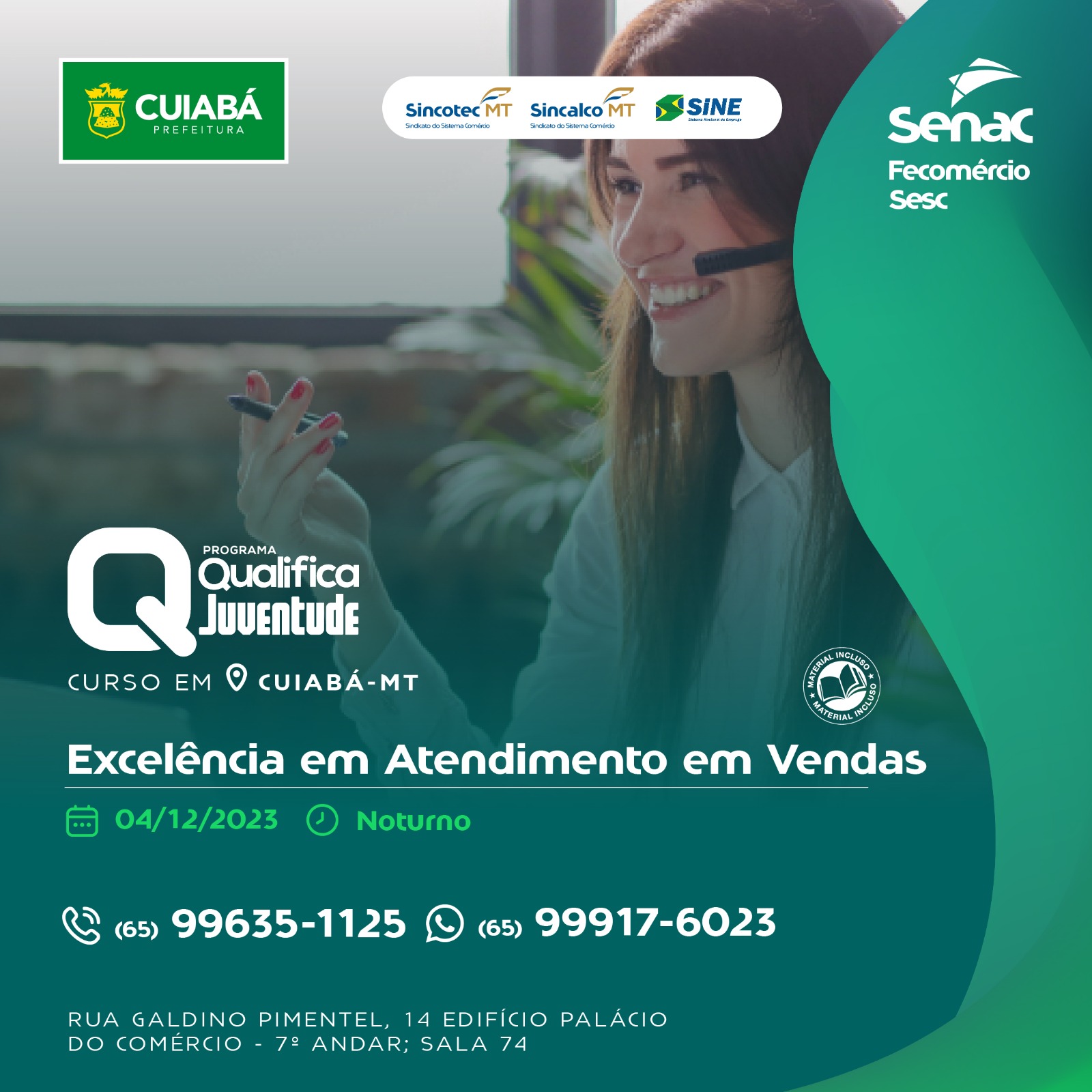 A Prefeitura de Cuiabá, por meio da Secretaria Municipal de Agricultura, Trabalho e Desenvolvimento Econômico (SMATDE), em parceria com o Serviço Nacional de Aprendizagem Comercial - Senac, Sine Municipal e SINCOTEC/SINCALCO, oferece uma grande oportunidade para os jovens se qualificarem e já ingressarem no mercado de trabalho, através do curso Excelência em Atendimento de Vendas.
