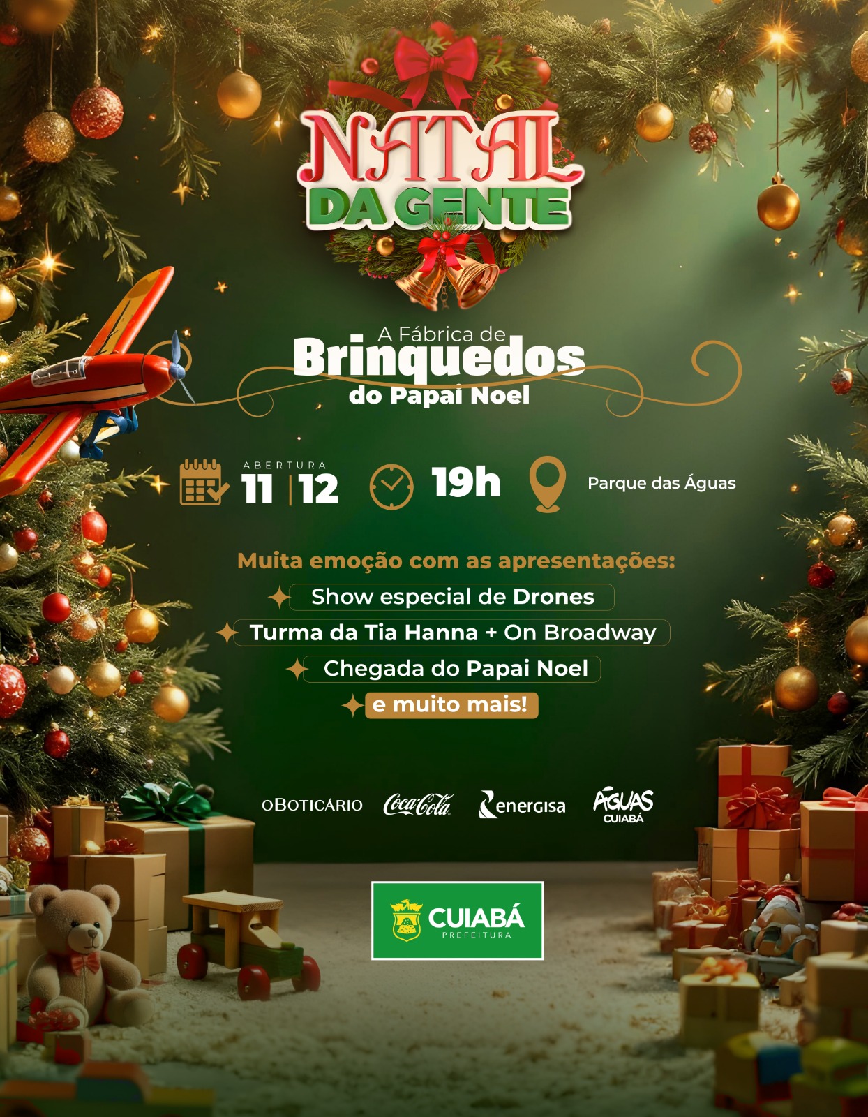 Com os mesmos equipamentos utilizados nos shows da Disney, o espetáculo exibirá imagens memoráveis: uma árvore de Natal gigante que se transforma em uma garrafa clássica da Coca-Cola, um Papai Noel de 100 metros de altura, o icônico caminhão de Natal e uma homenagem especial à cidade de Cuiabá. Será uma experiência única, capaz de emocionar e criar lembranças inesquecíveis.