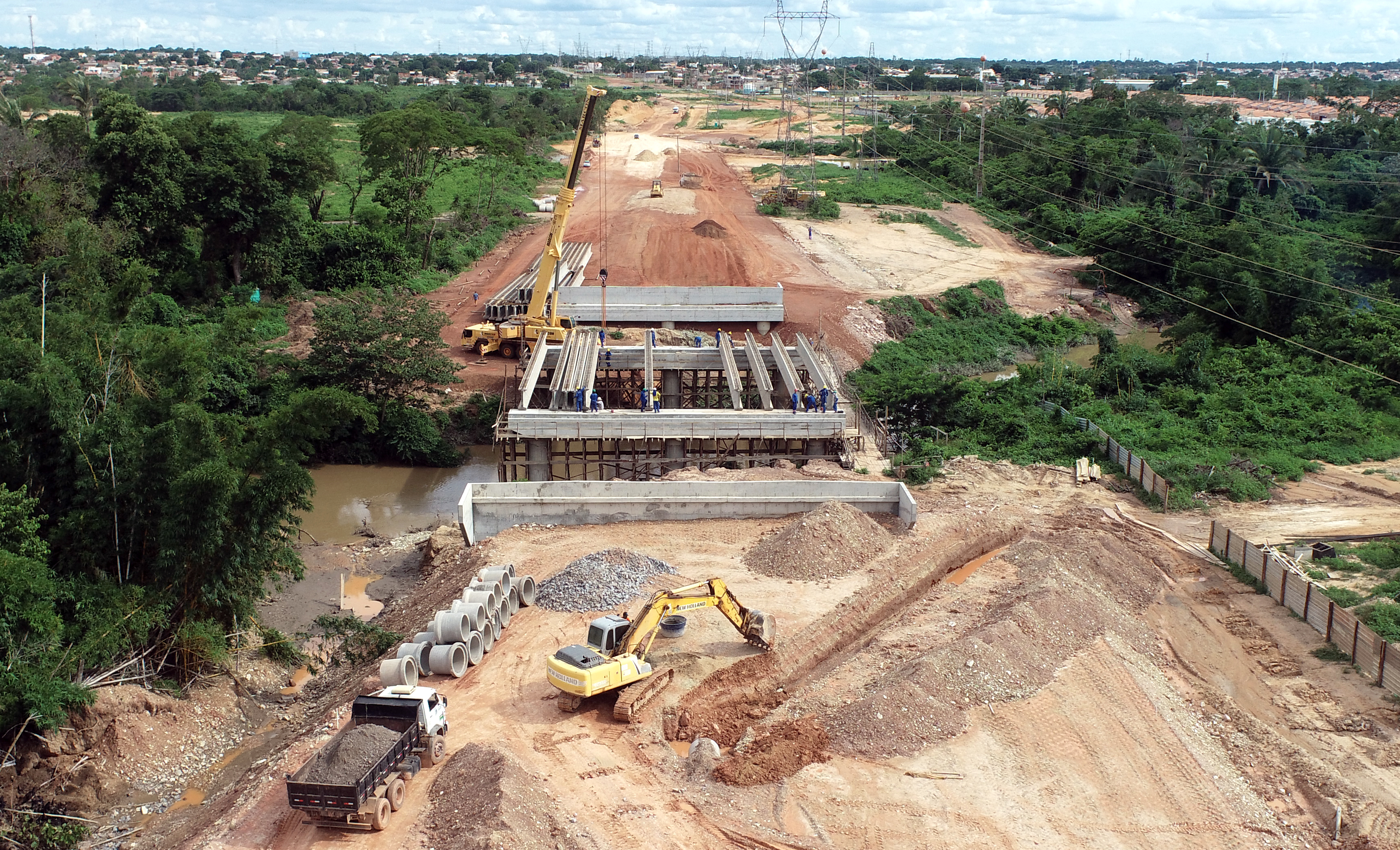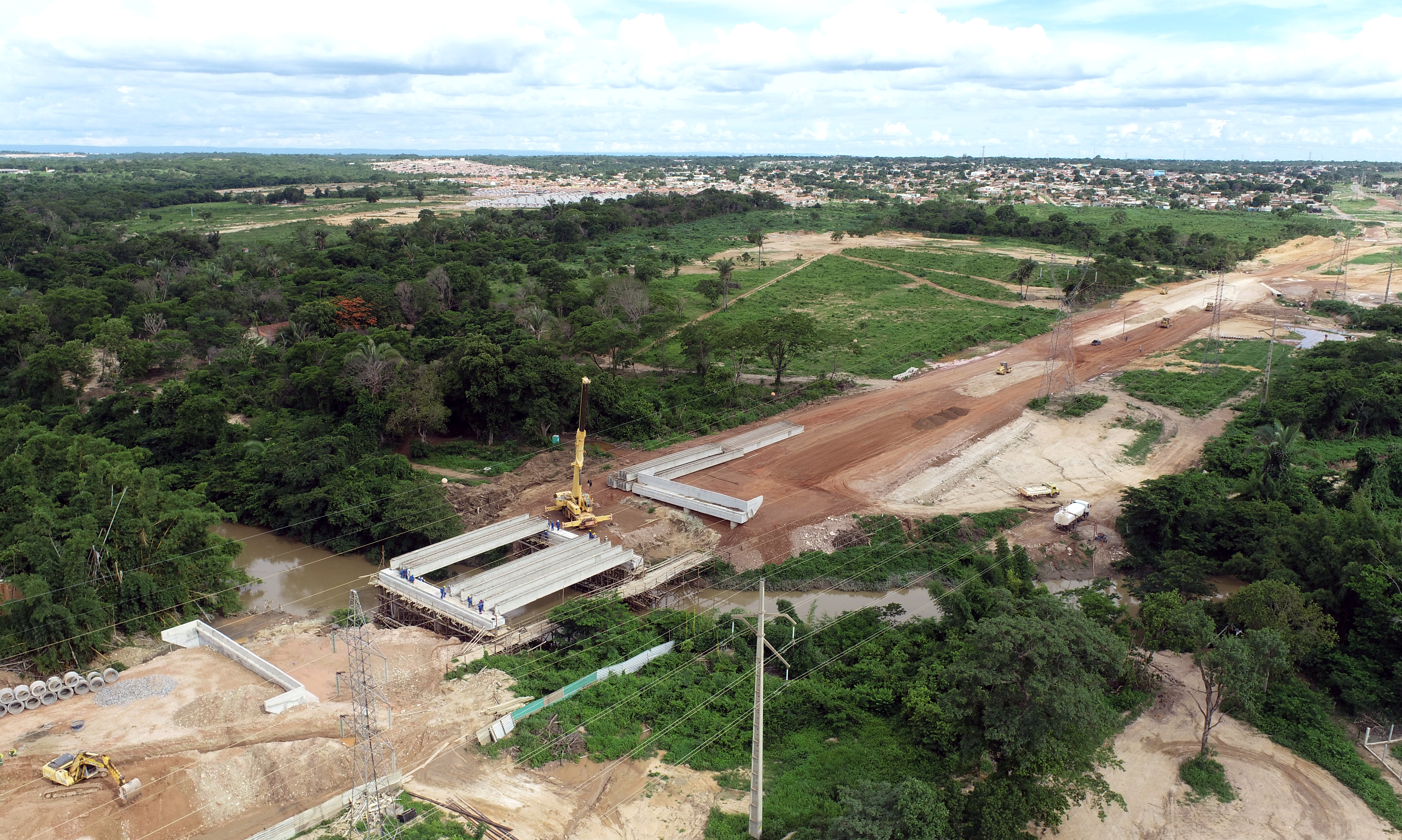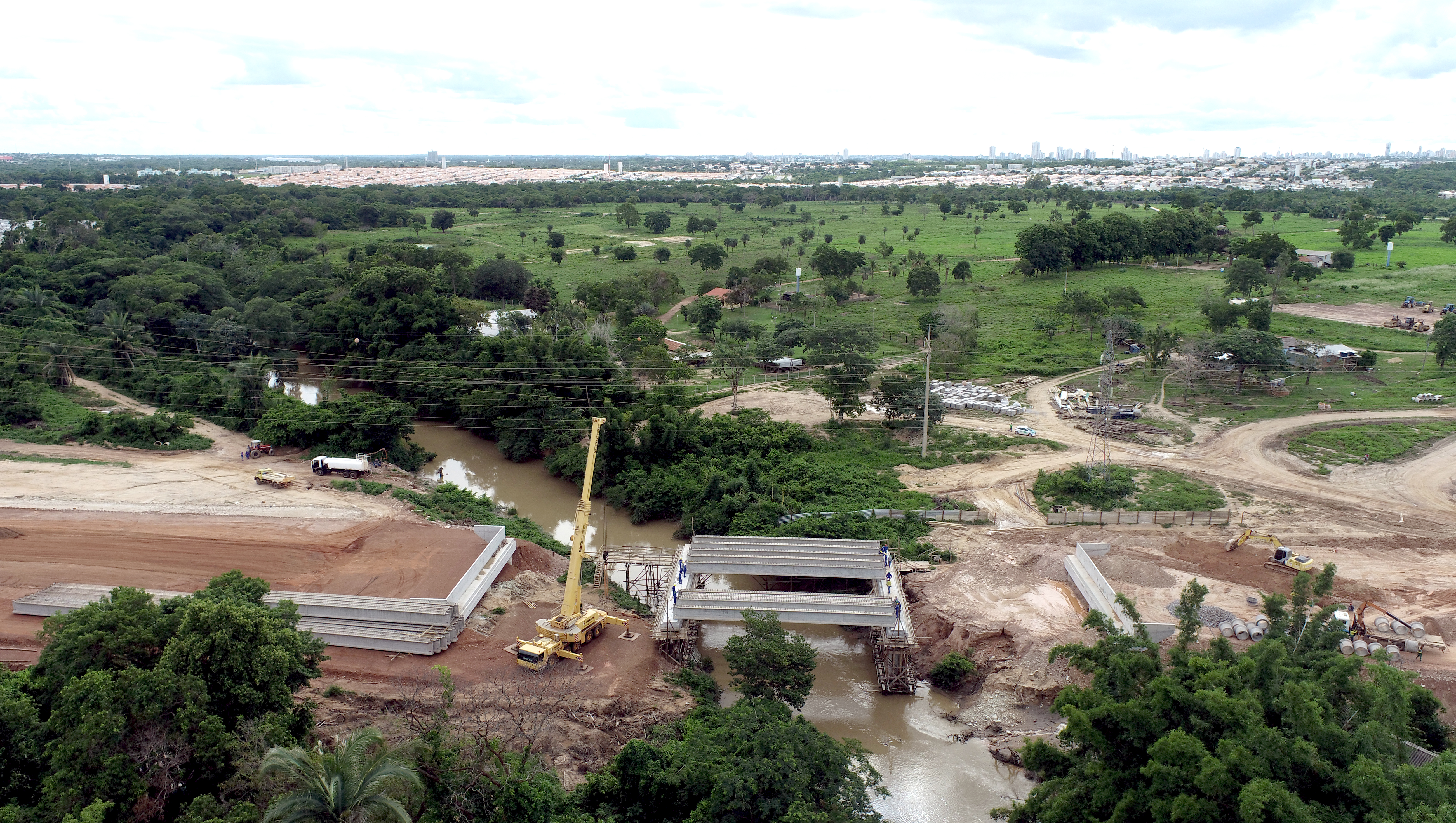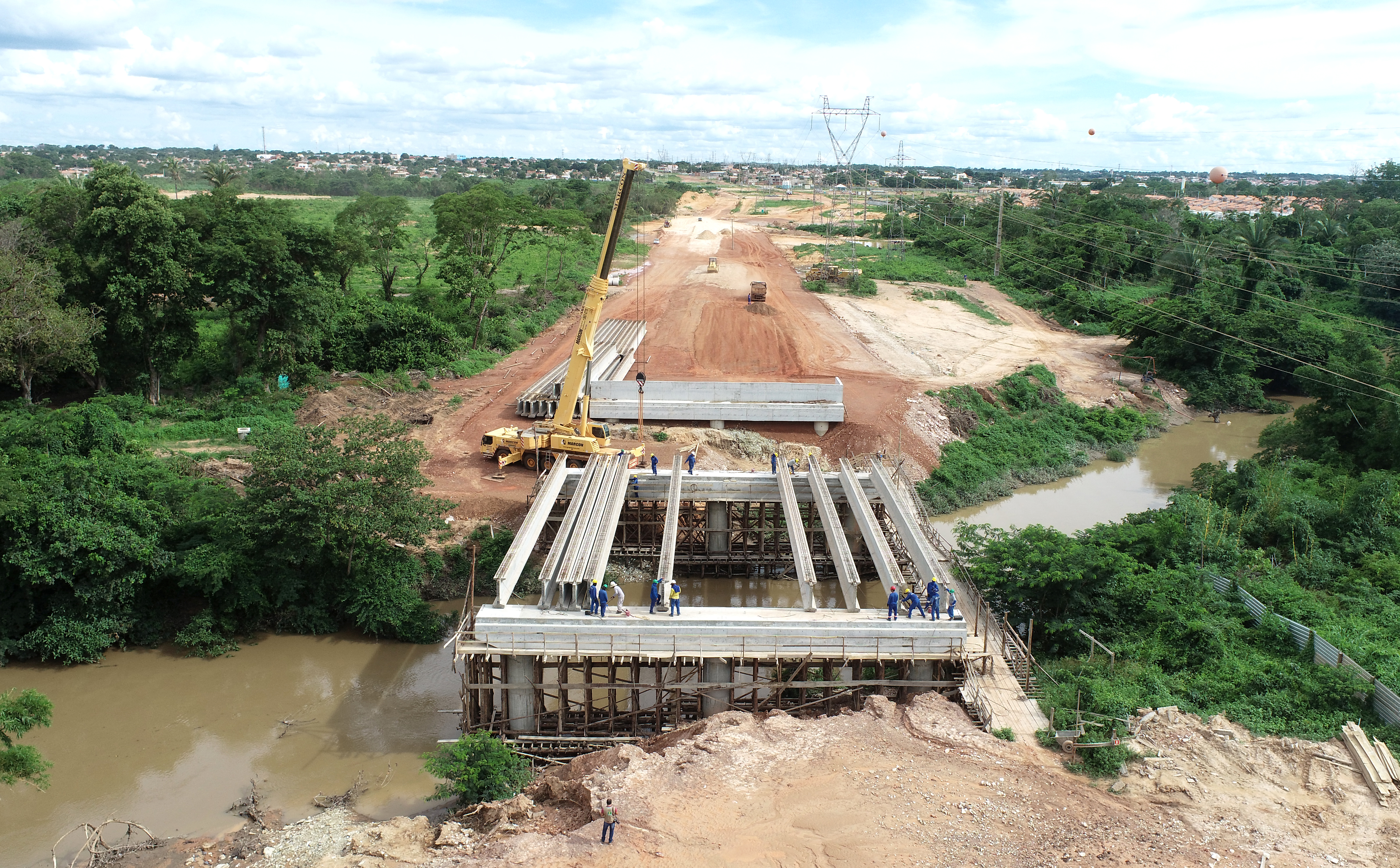 O levantamento da ponte de concreto sobre o Rio Coxipó, uma das etapas de construção da Avenida Contorno Leste, avança de forma célere. A obra foi iniciada em julho deste ano e recebe um investimento da Prefeitura de Cuiabá no valor de R$ 7,7 milhões. A atividade já superou as fases iniciais de fundação e edificação dos pórticos e, na última semana, também passou pelo processo de instalação das mais de 30 vigas de concreto.