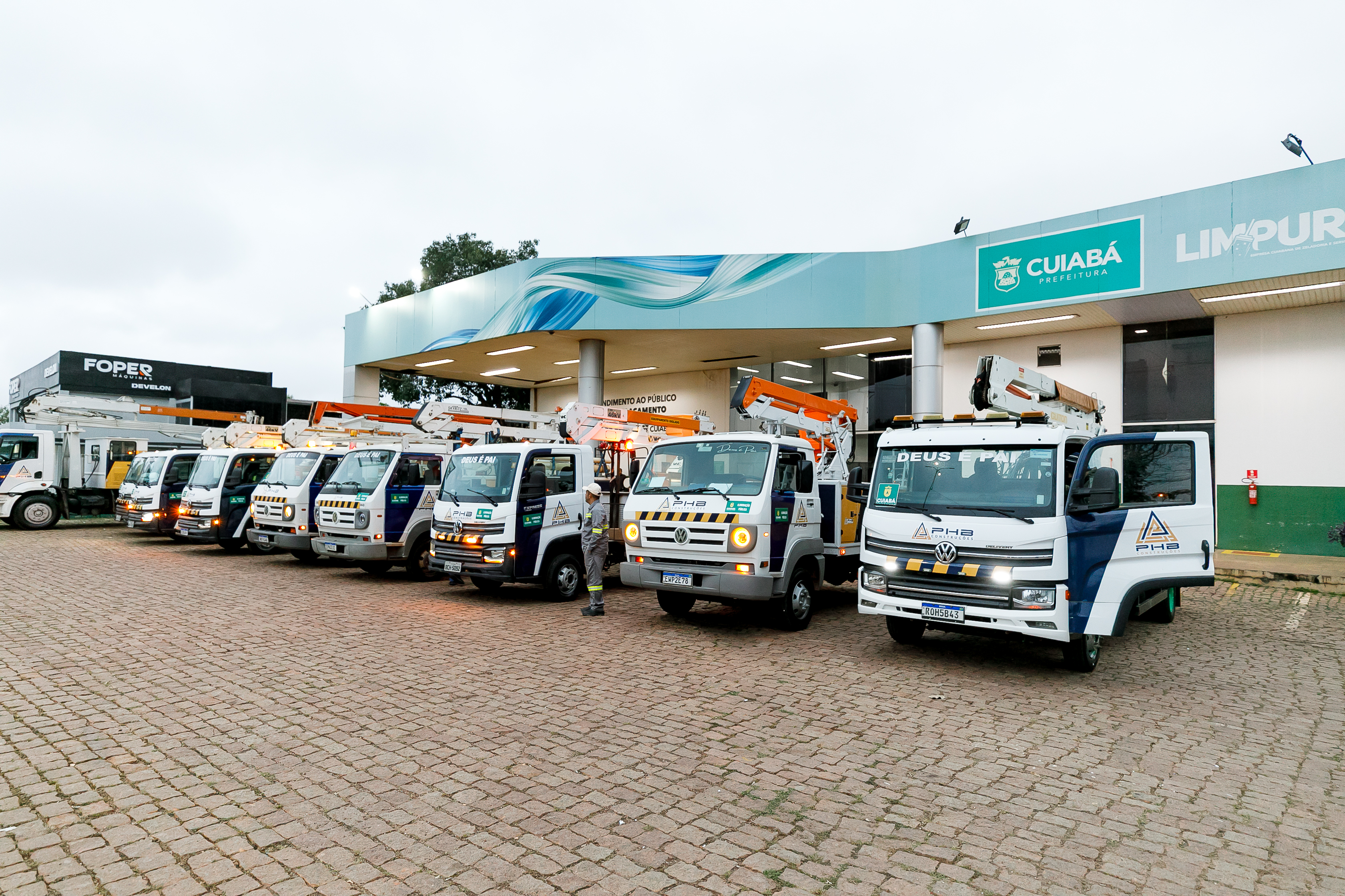 A imagem mostra os caminhões de reparos luminotécnicos estacionados em frente a Empresa Cuiabana de Zeladoria e Serviços Urbanos - Limpurb.