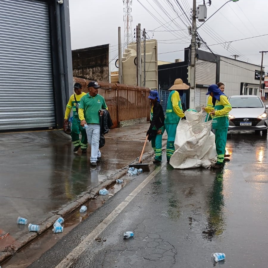 A imagem mostra colaboradores da Limpurb em força-tarefa de limpeza no trecho da 36ª Corrida Bom Jesus de Cuiabá. Os funcionários usam uniforme na cor verde, e está munido de Equipamento de Proteção Individual (EPIs).