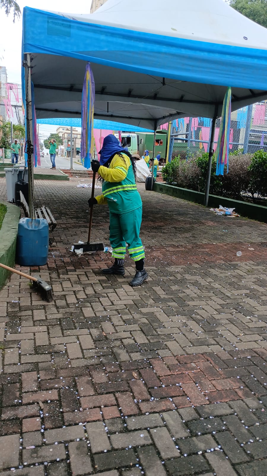 A imagem mostra uma colaboradora da Limpurb realizando a limpeza num ponto da praça Oito de Abril, conhecida popularmente como Praça do Choppão. Ao fundo, há algumas decorações carnavalescas.