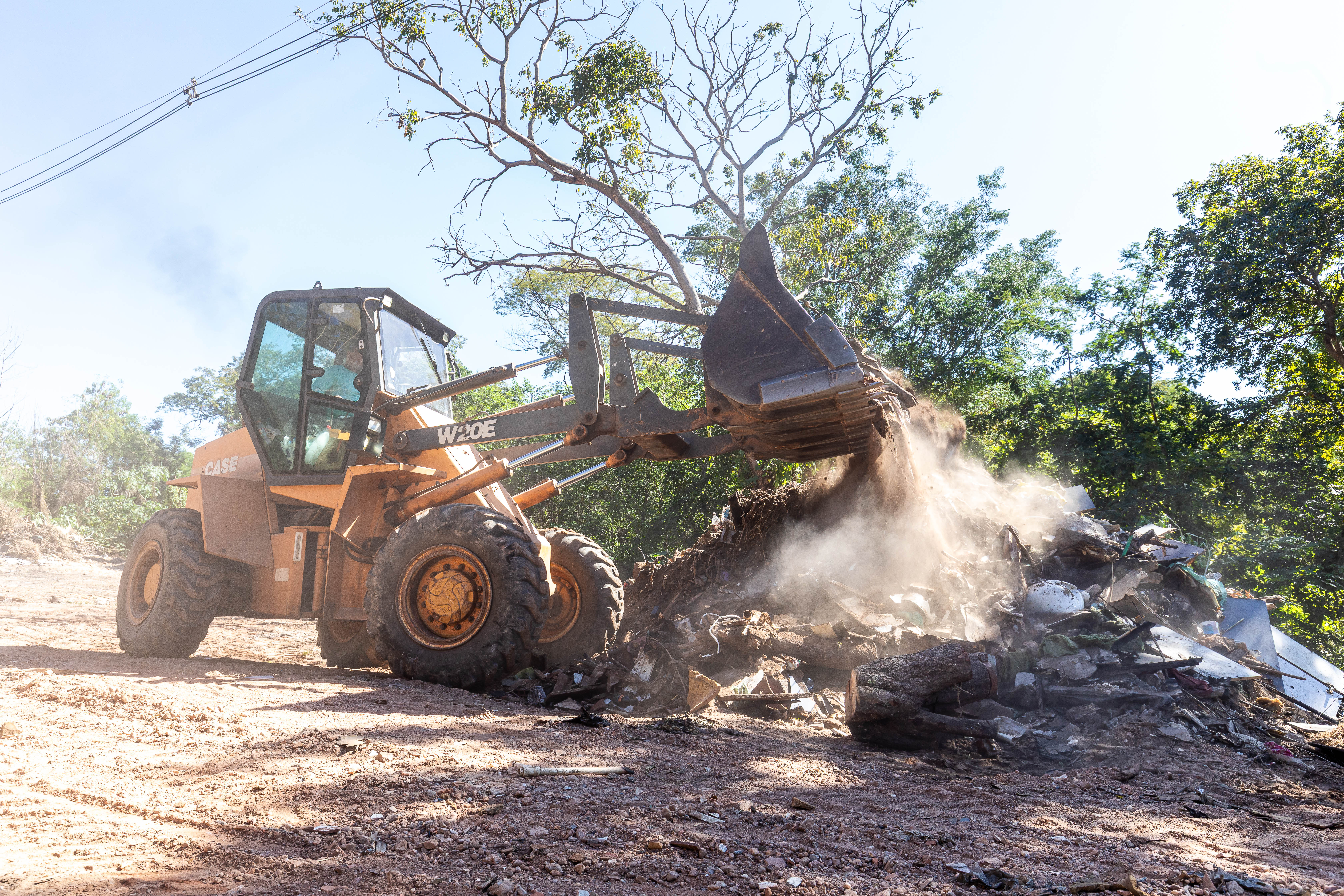 A imagem mostra um bolsão de lixo no bairro Morada do Ouro II. Ao fundo, uma pá carregadeira juntamente com um caminhão-caçamba, executam os serviços de recolhimento do material irregular.