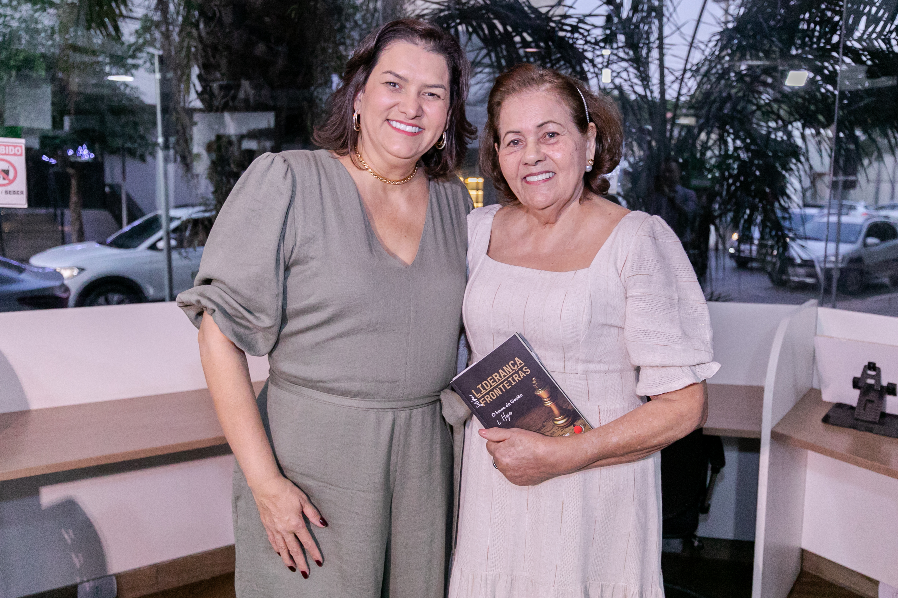 A foto ilustra a autora do livro, Sônia Regina Guimarães da Fonseca, vestida com roupa cinza. Ao lado, está a professora aposentada Creuza Guimarães, que usa vestido branco. Ambas estão sorrindo e exibindo o livro "Liderança sem Fronteiras – O futuro da Gestão é Hoje"