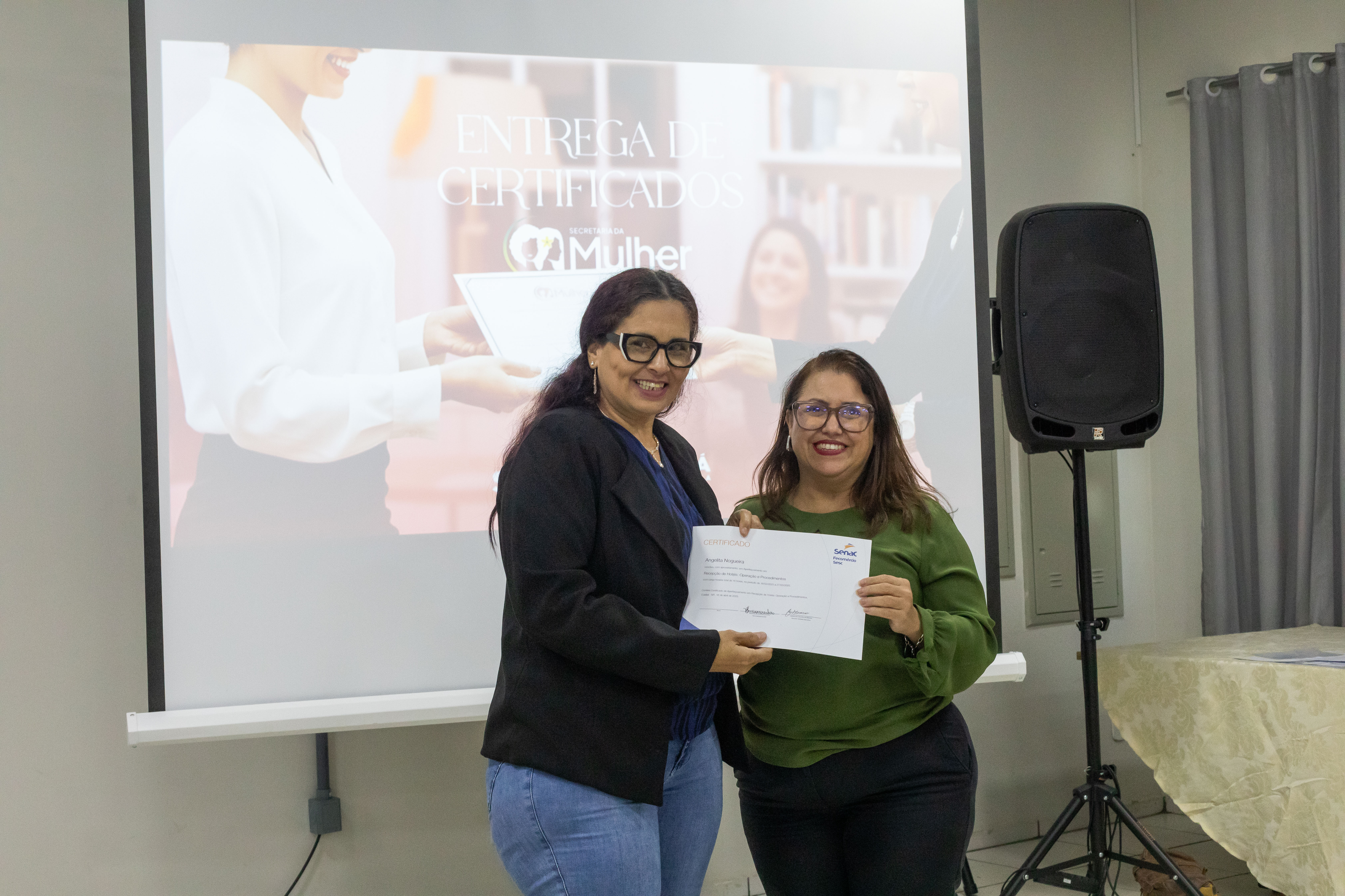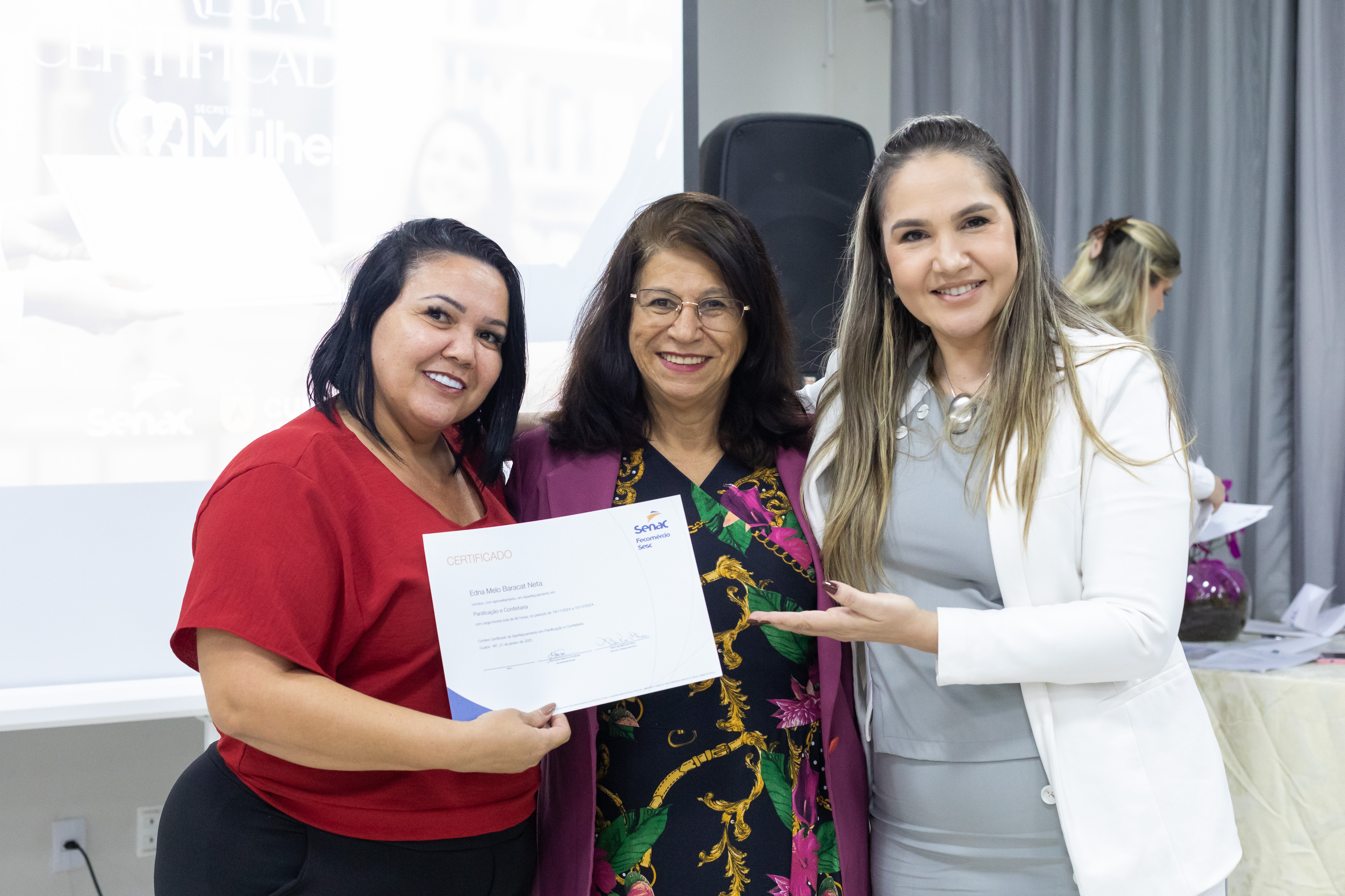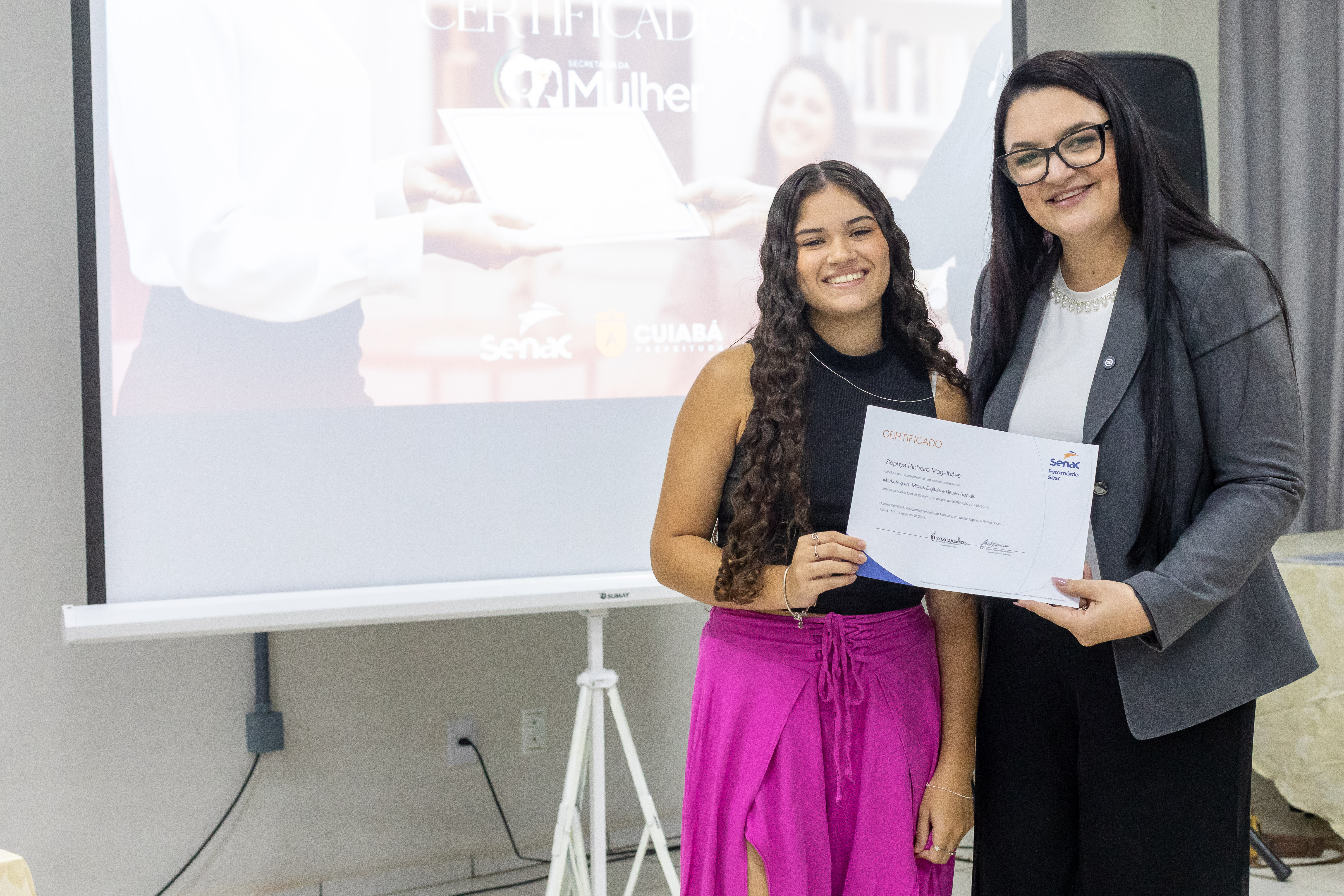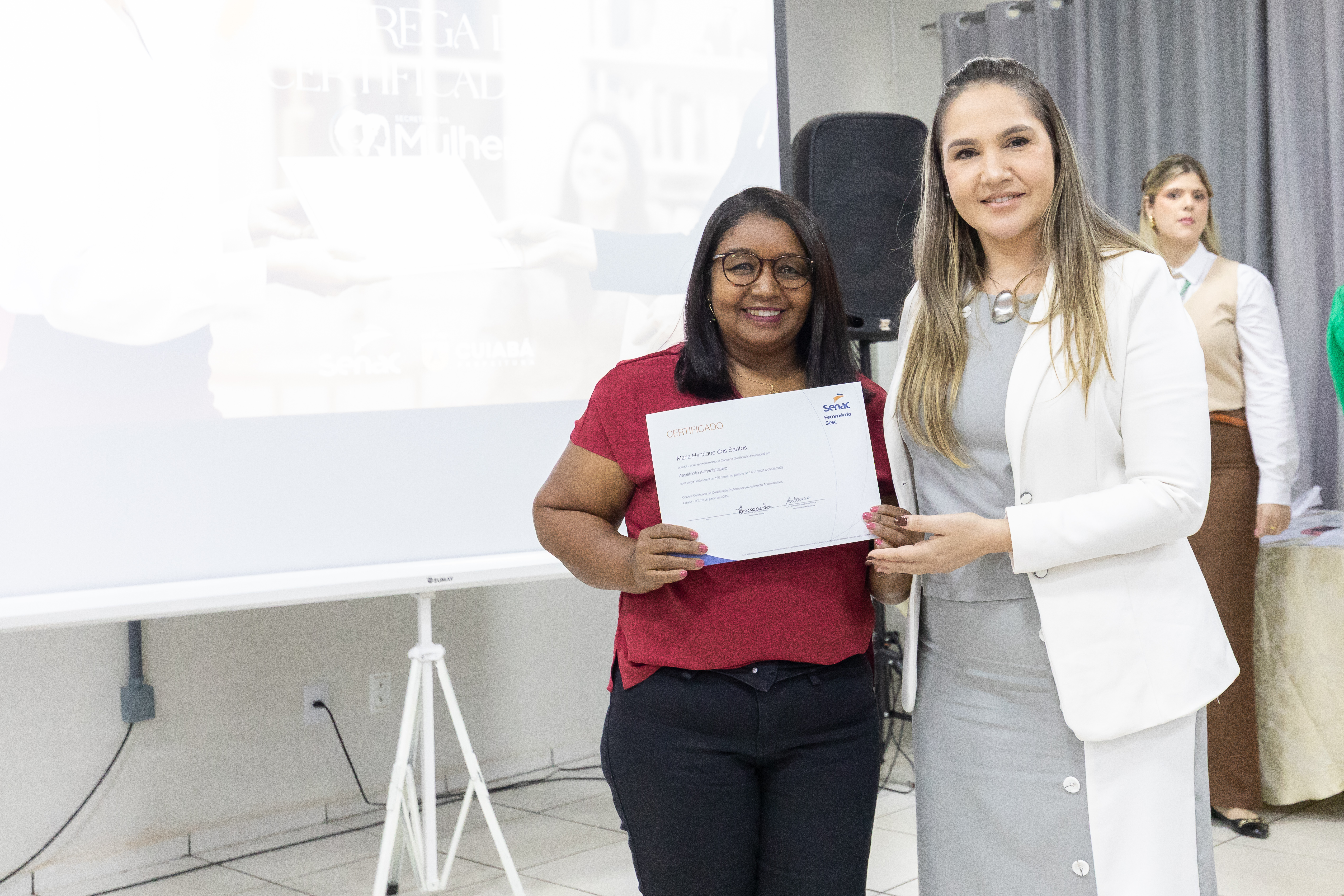 A Prefeitura de Cuiabá, por meio da Secretaria Municipal da Mulher, entregou 108 certificados de mulheres que concluíram cursos profissionalizantes, em parceria com o Serviço Nacional de Aprendizagem Comercial (Senac). A cerimônia foi realizada nesta quarta-feira (25), no Centro de Formação da Escola Cuiabana, com a presença de lideranças municipais, instrutores e alunas.