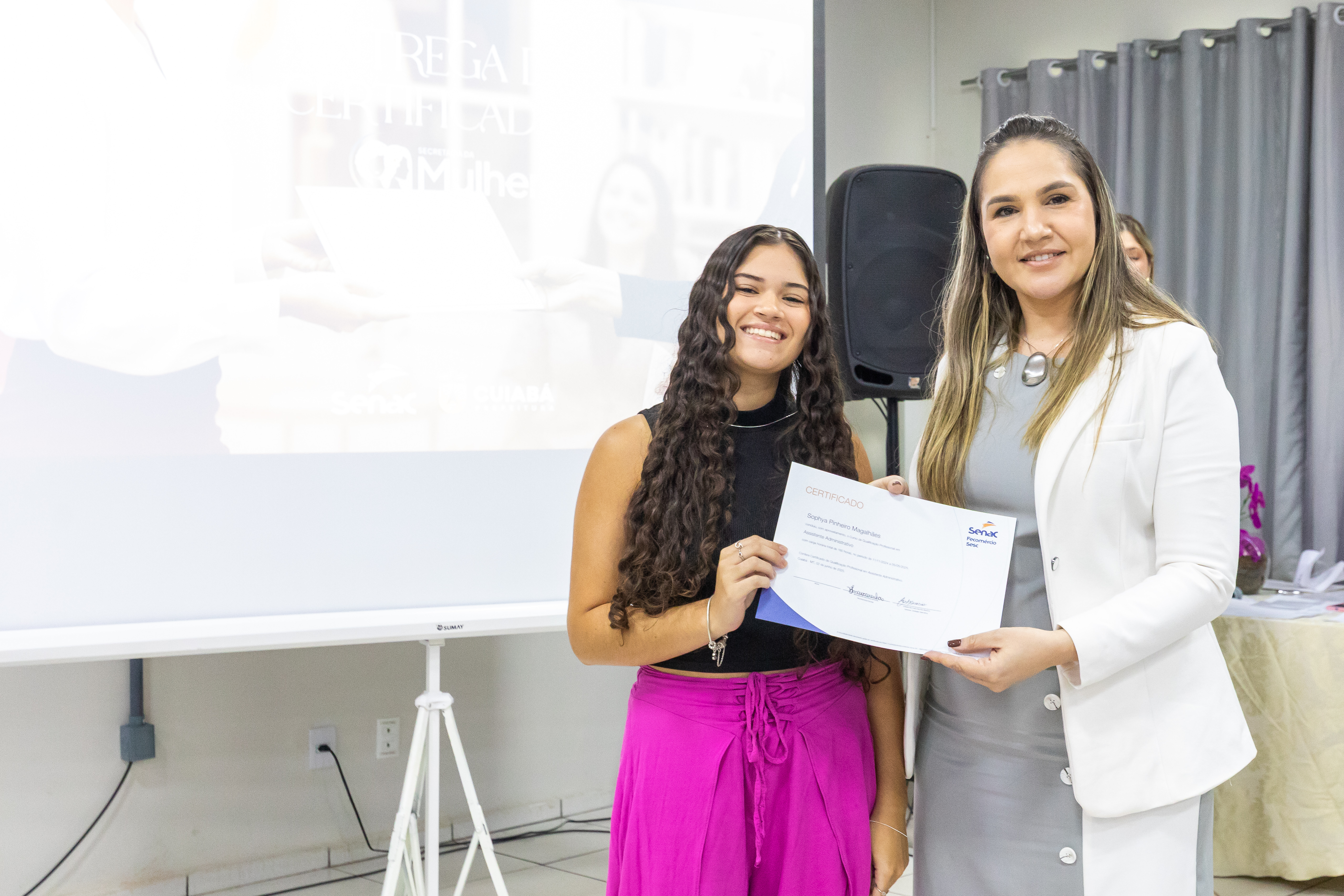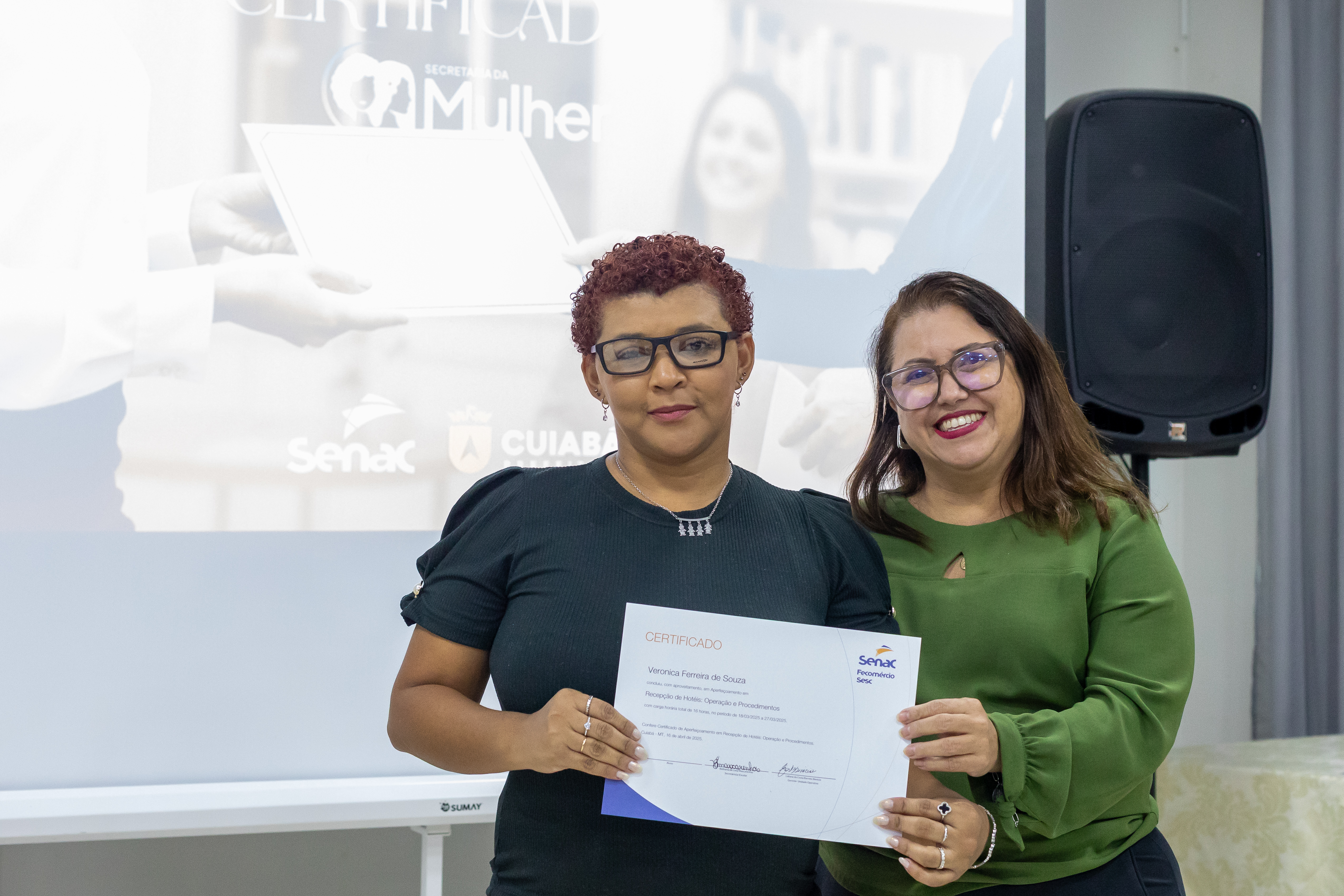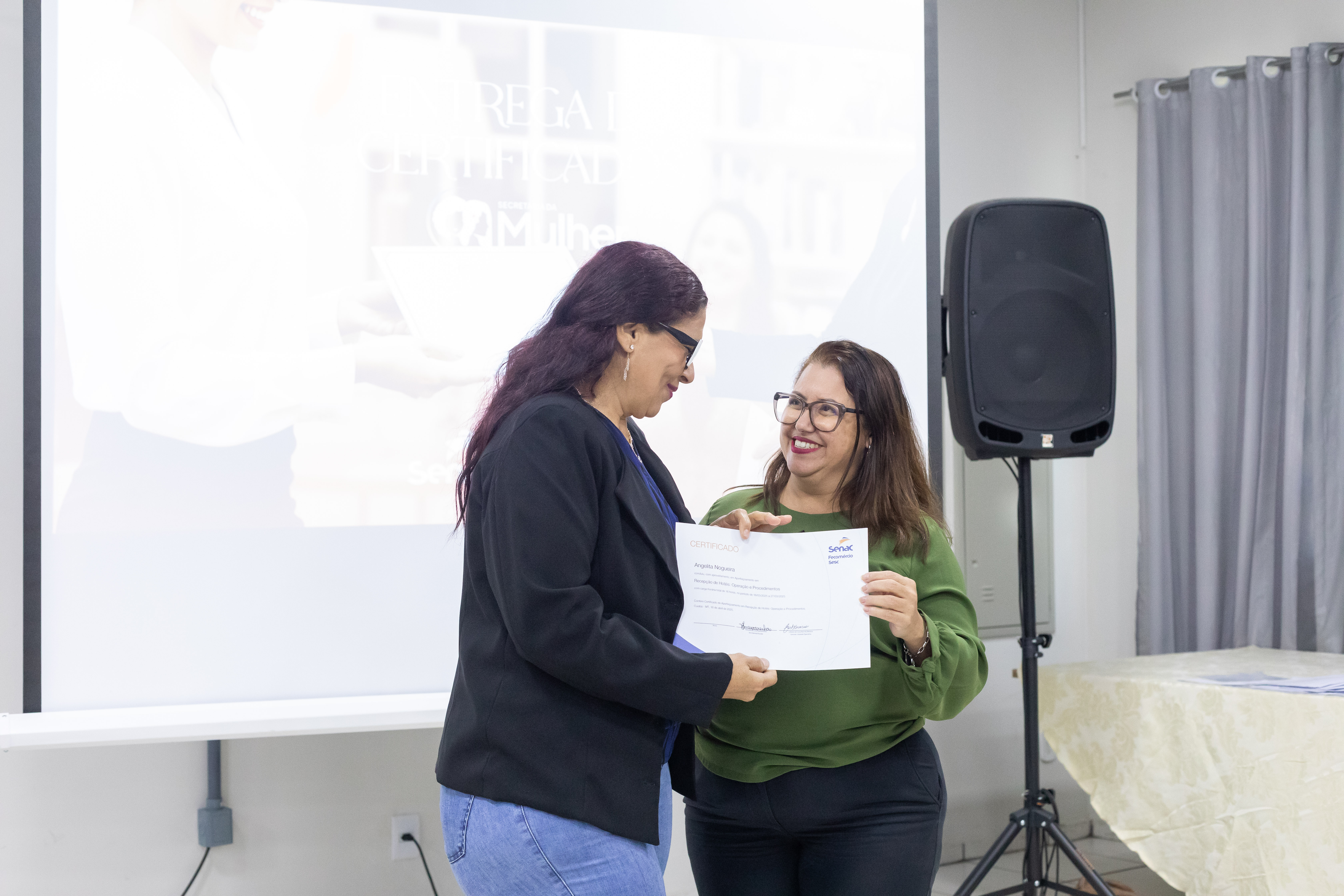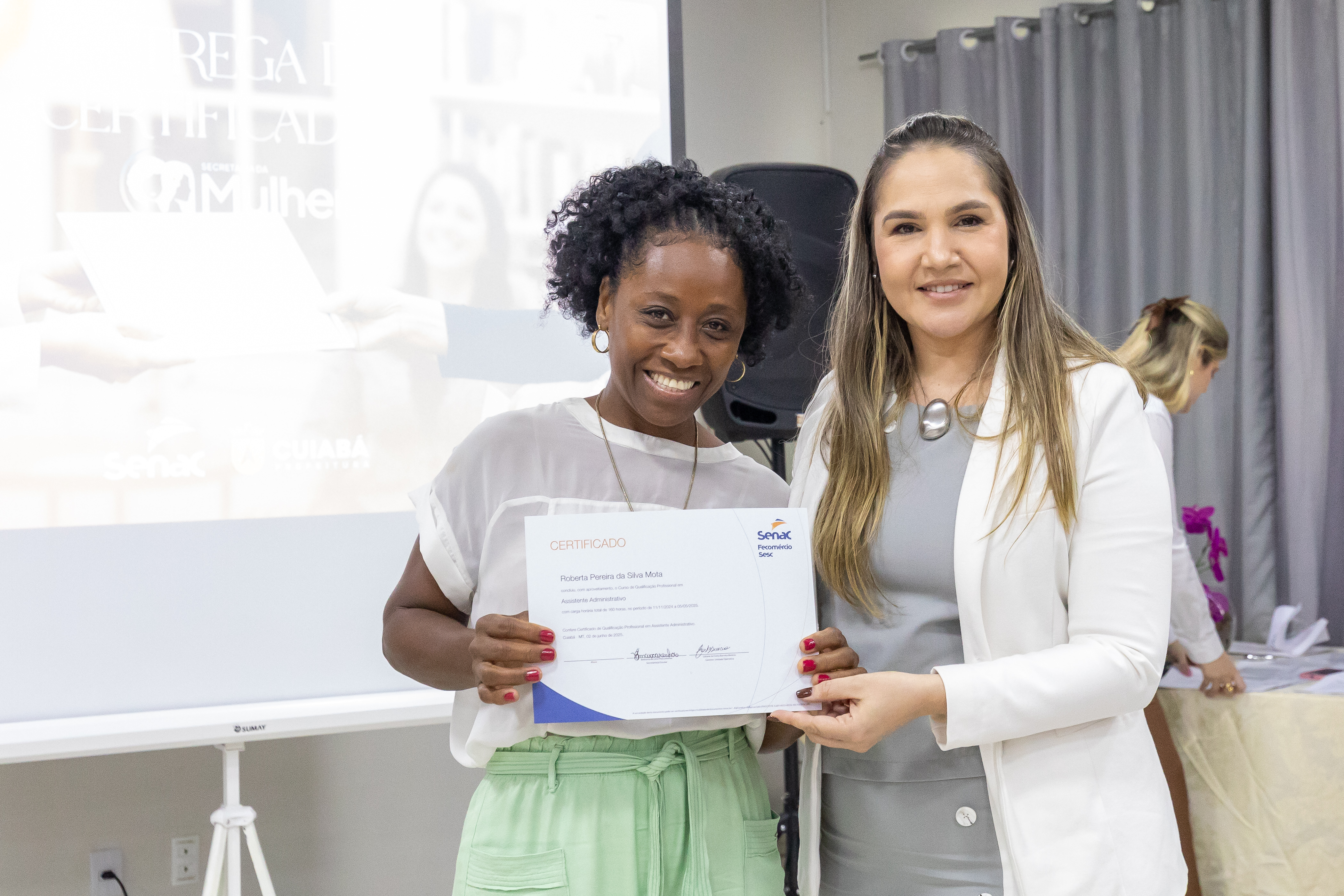 A Prefeitura de Cuiabá, por meio da Secretaria Municipal da Mulher, entregou 108 certificados de mulheres que concluíram cursos profissionalizantes, em parceria com o Serviço Nacional de Aprendizagem Comercial (Senac). A cerimônia foi realizada nesta quarta-feira (25), no Centro de Formação da Escola Cuiabana, com a presença de lideranças municipais, instrutores e alunas.