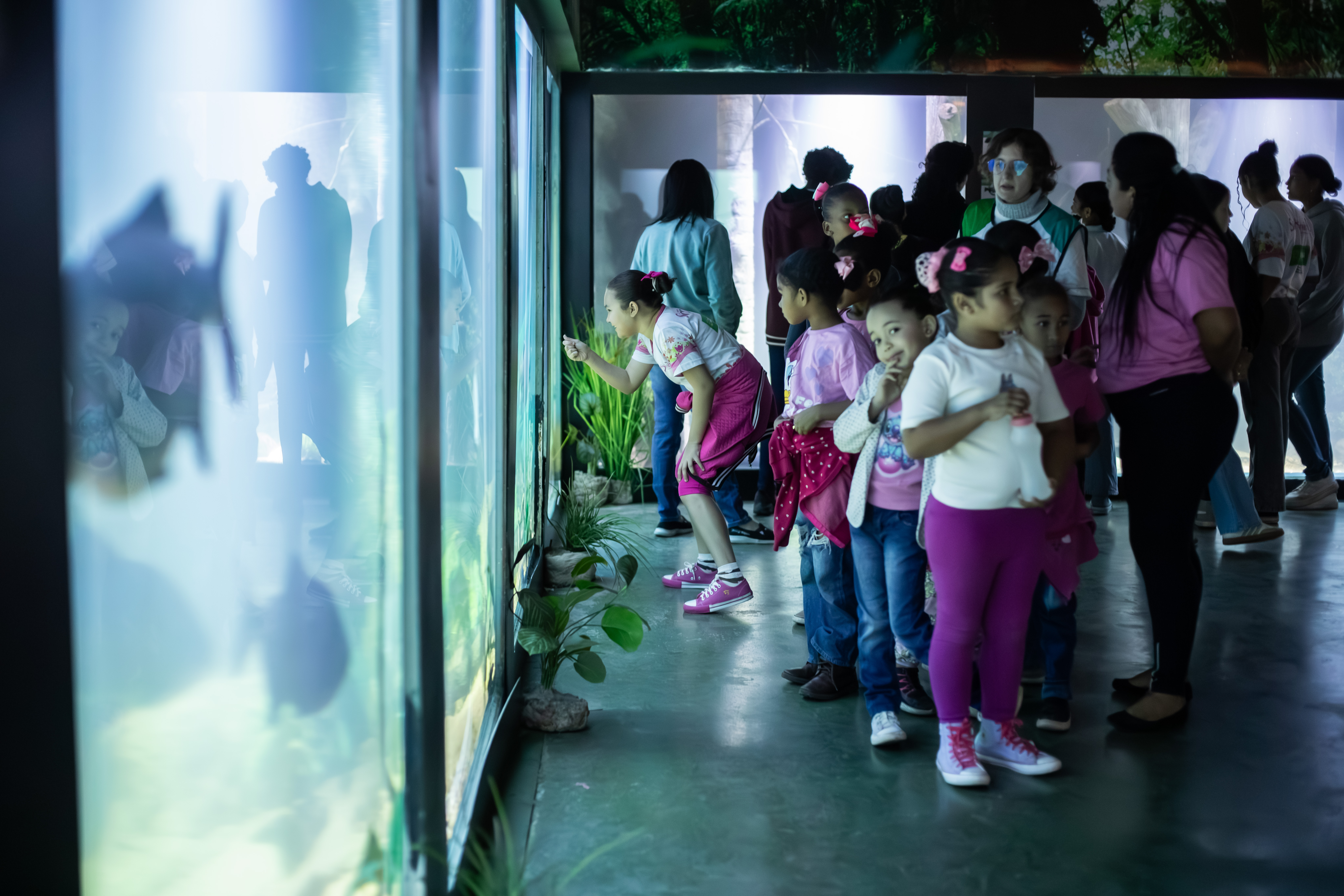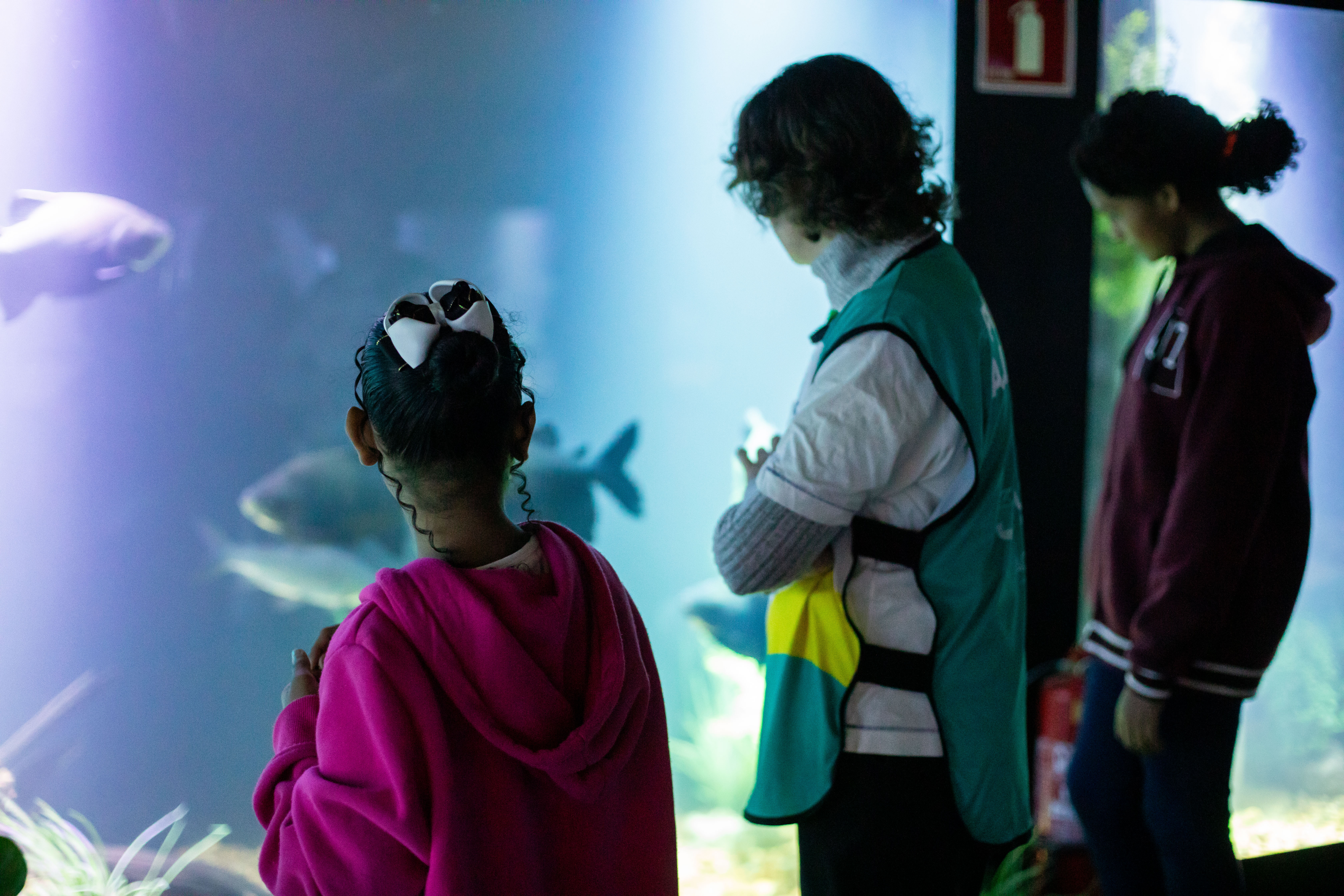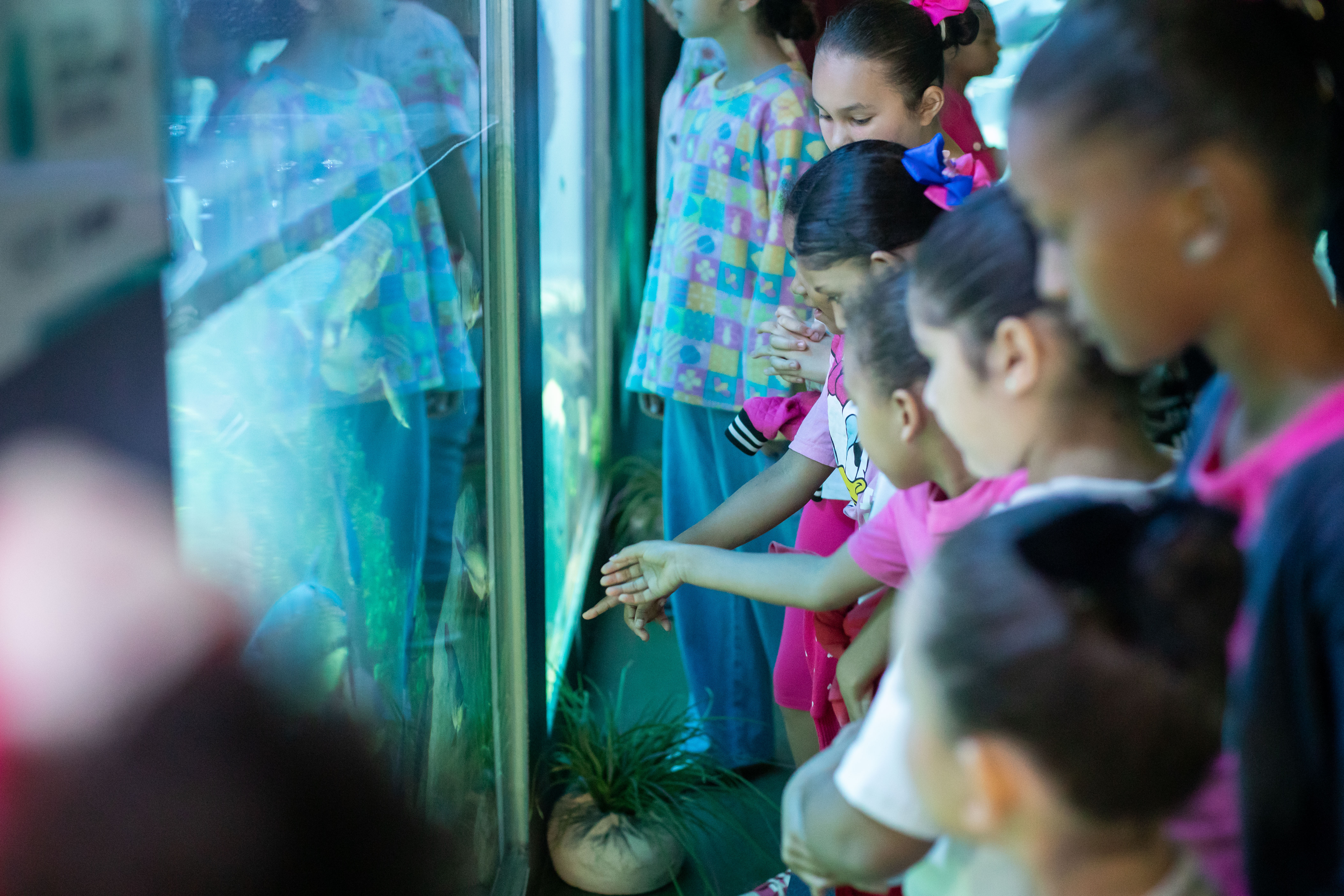 As crianças puderam conhecer de perto espécies como pirarucu, tambaqui, pirarara, dourado, cachara, jaú, jundiá, entre outras. Para muitas delas, foi a primeira vez visitando o local.