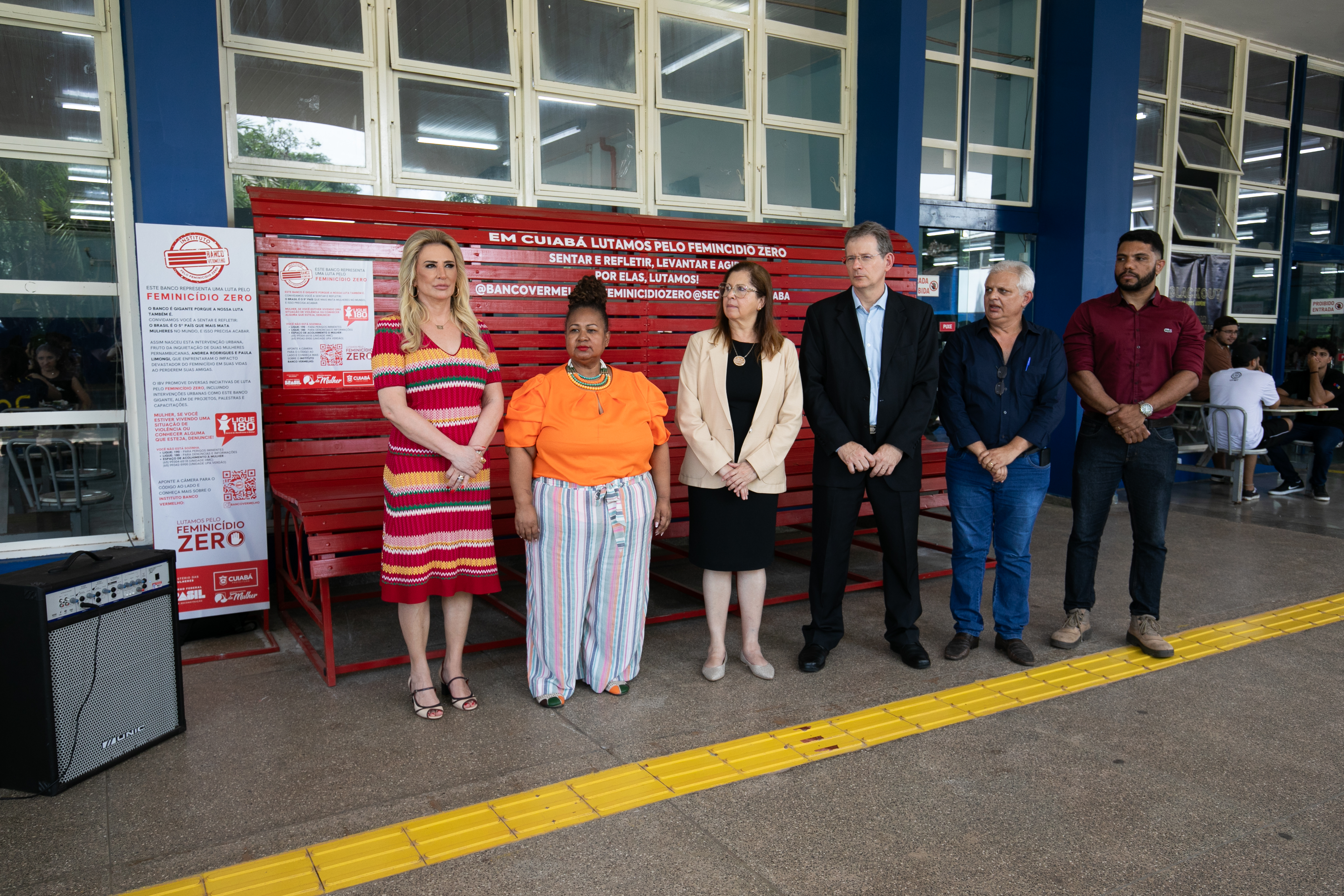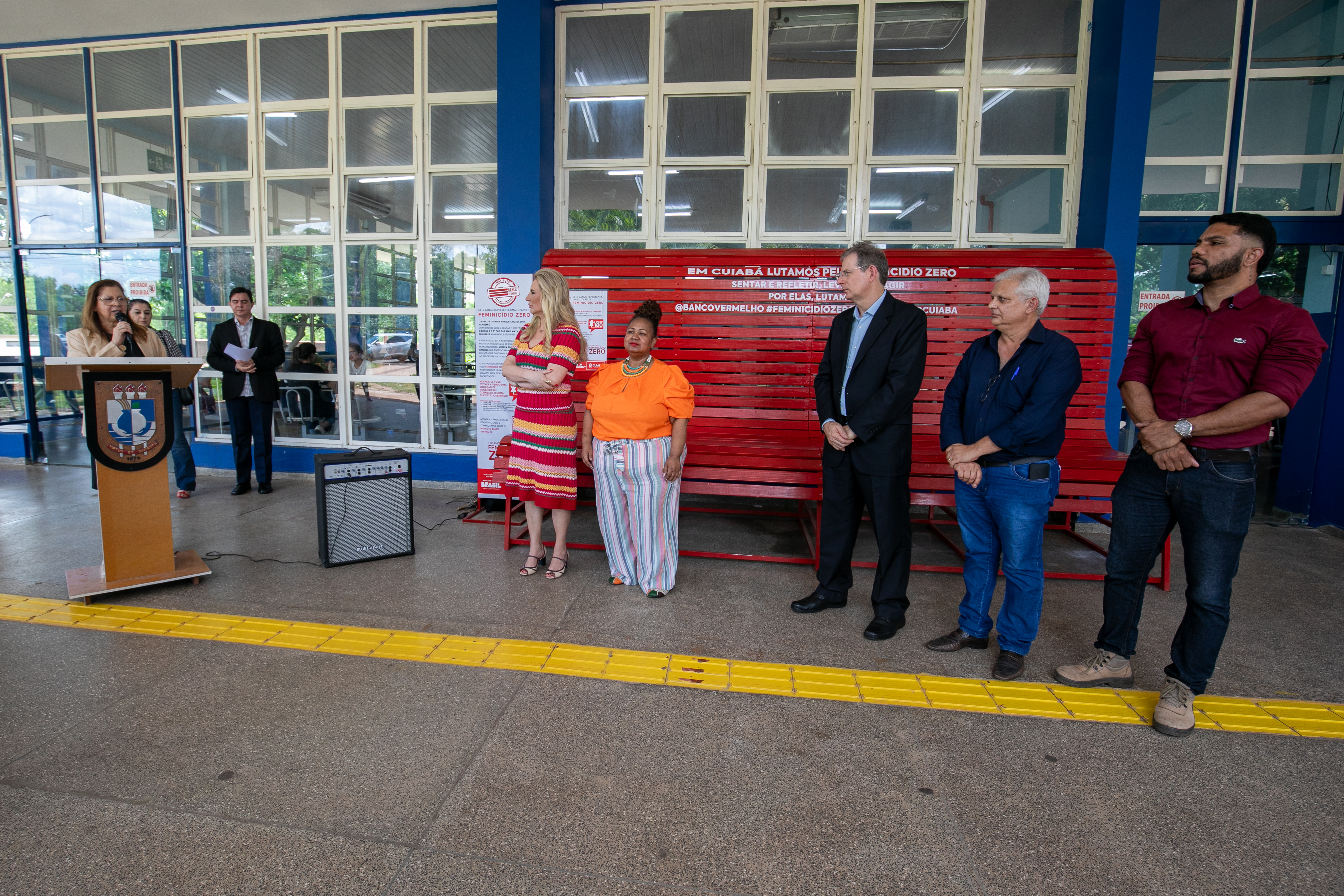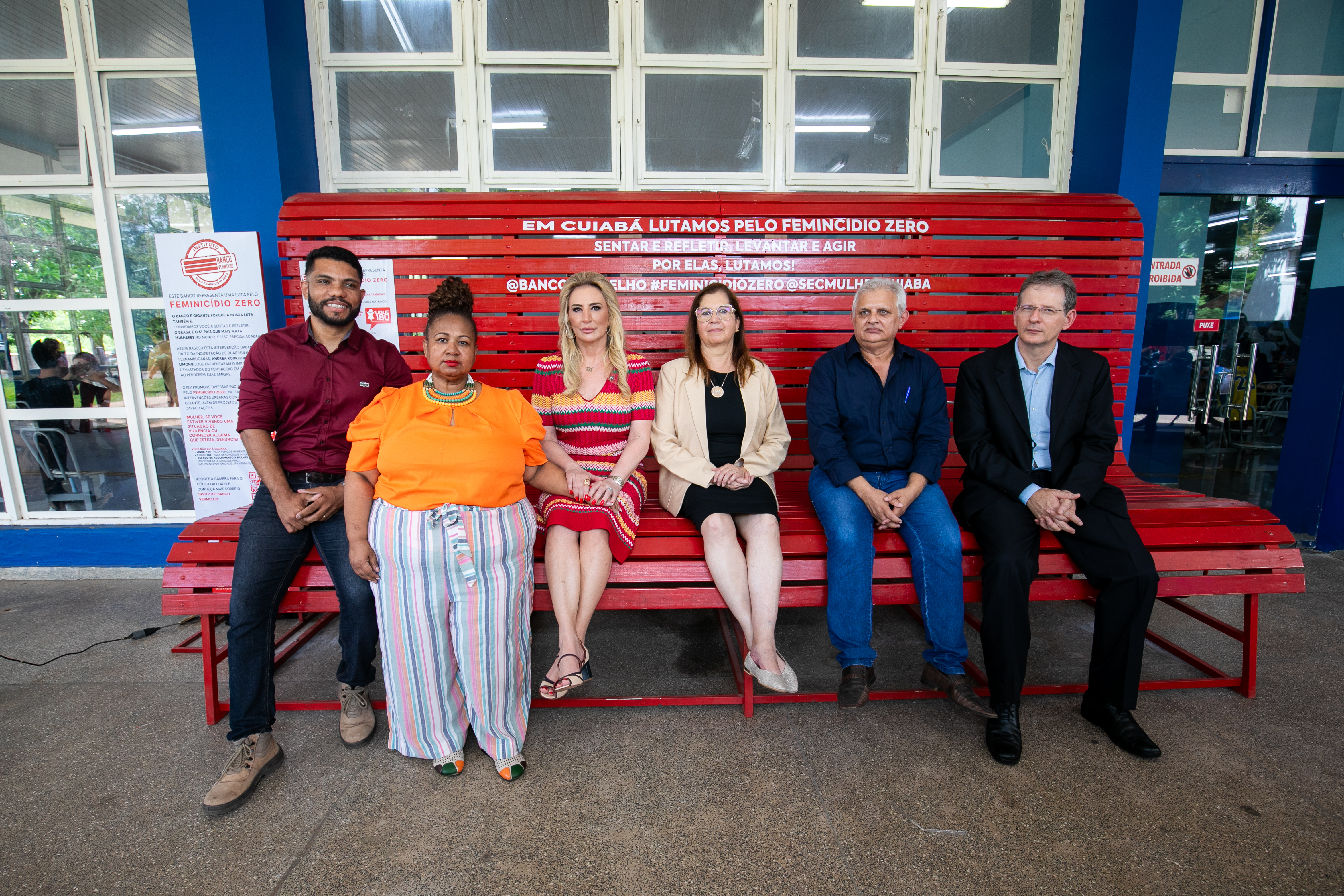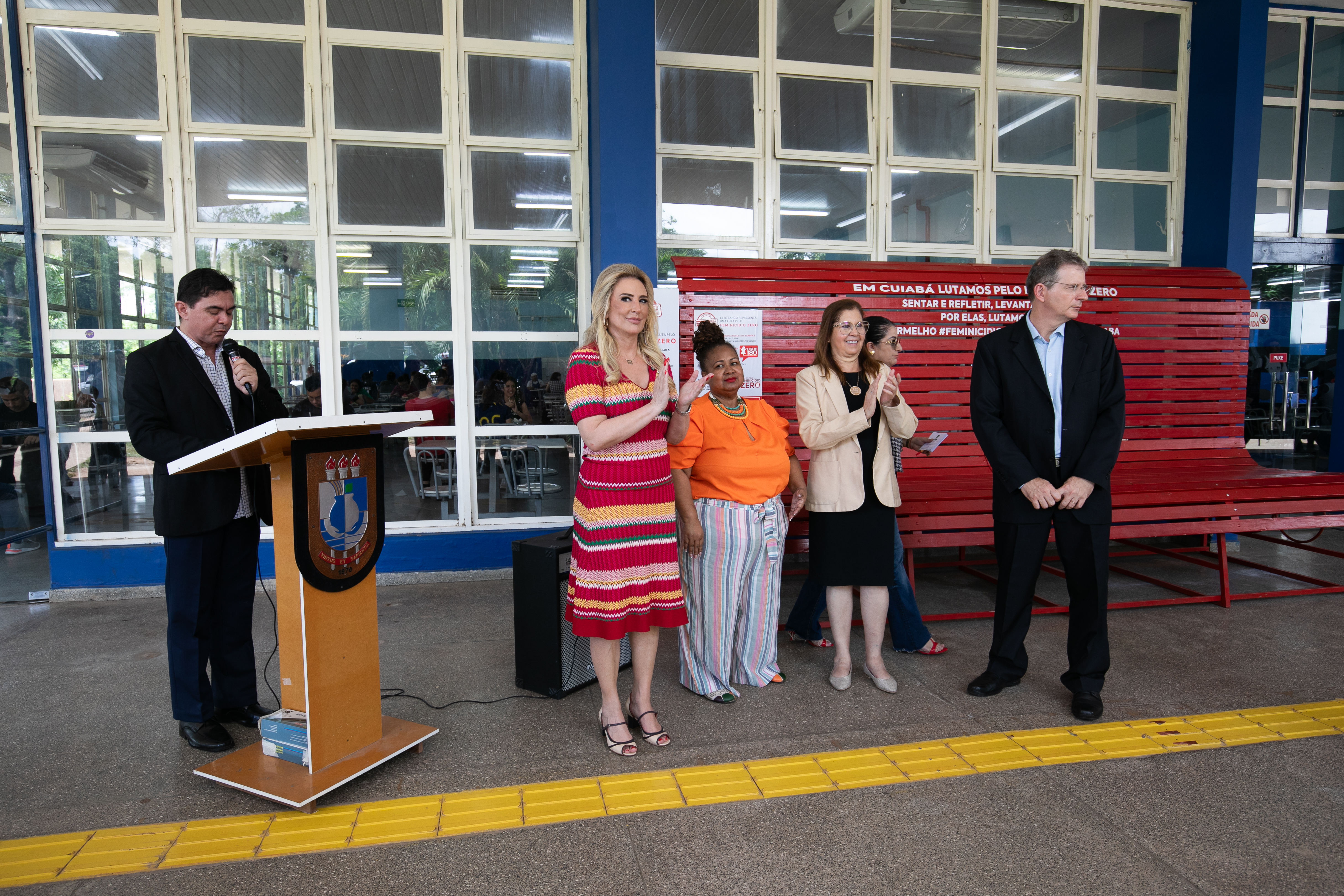 Diariamente, mais de quatro mil alunos da Universidade Federal de Mato Grosso (UFMT) serão impactados diariamente pela ação Banco Vermelho, voltada à conscientização contra a violência de gênero e o feminicídio. O lançamento do oitavo de dez bancos aconteceu nesta terça-feira (10), no Restaurante Universitário (RU) do campus da universidade. A iniciativa contou com a participação da primeira-dama de Cuiabá, Márcia Pinheiro.