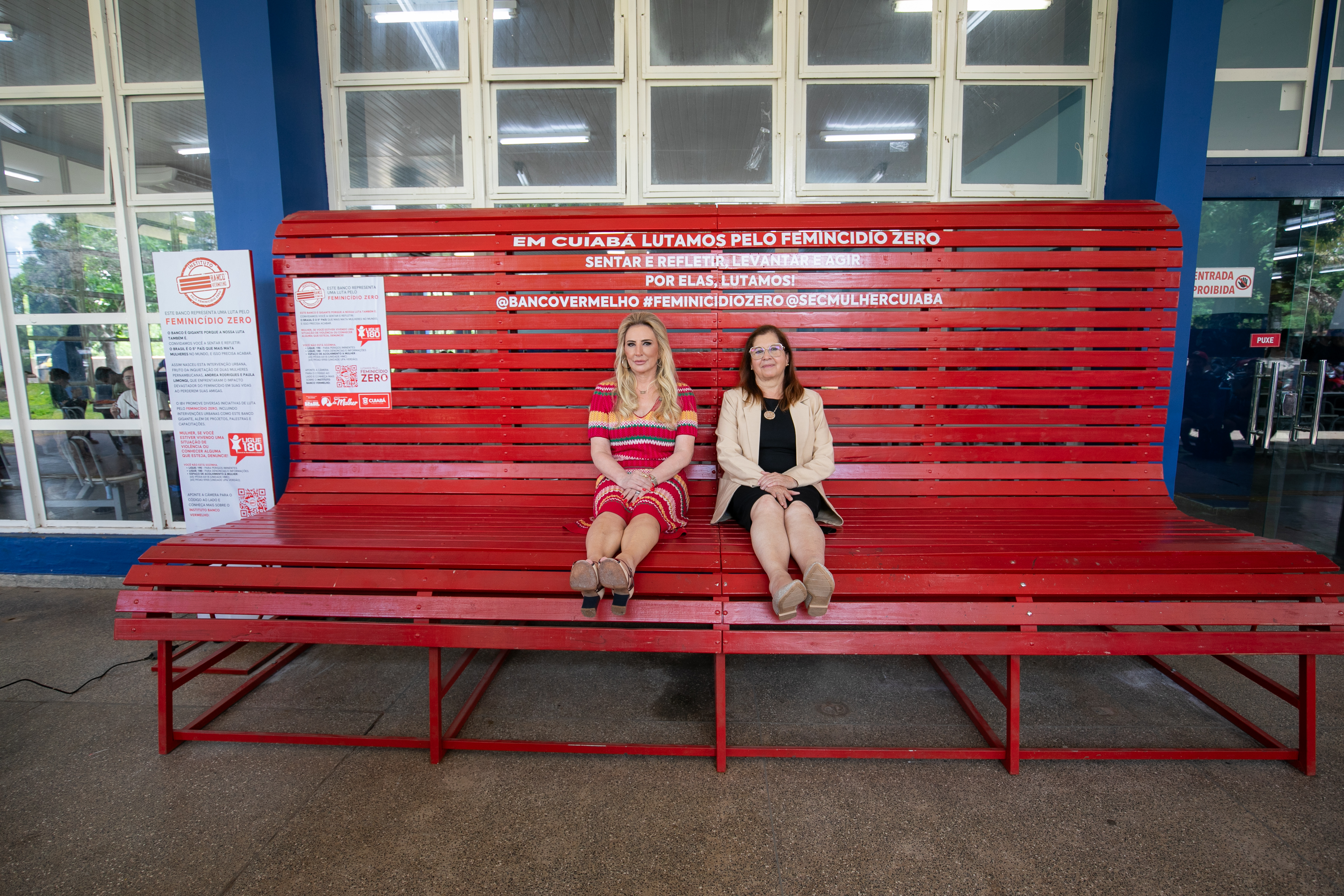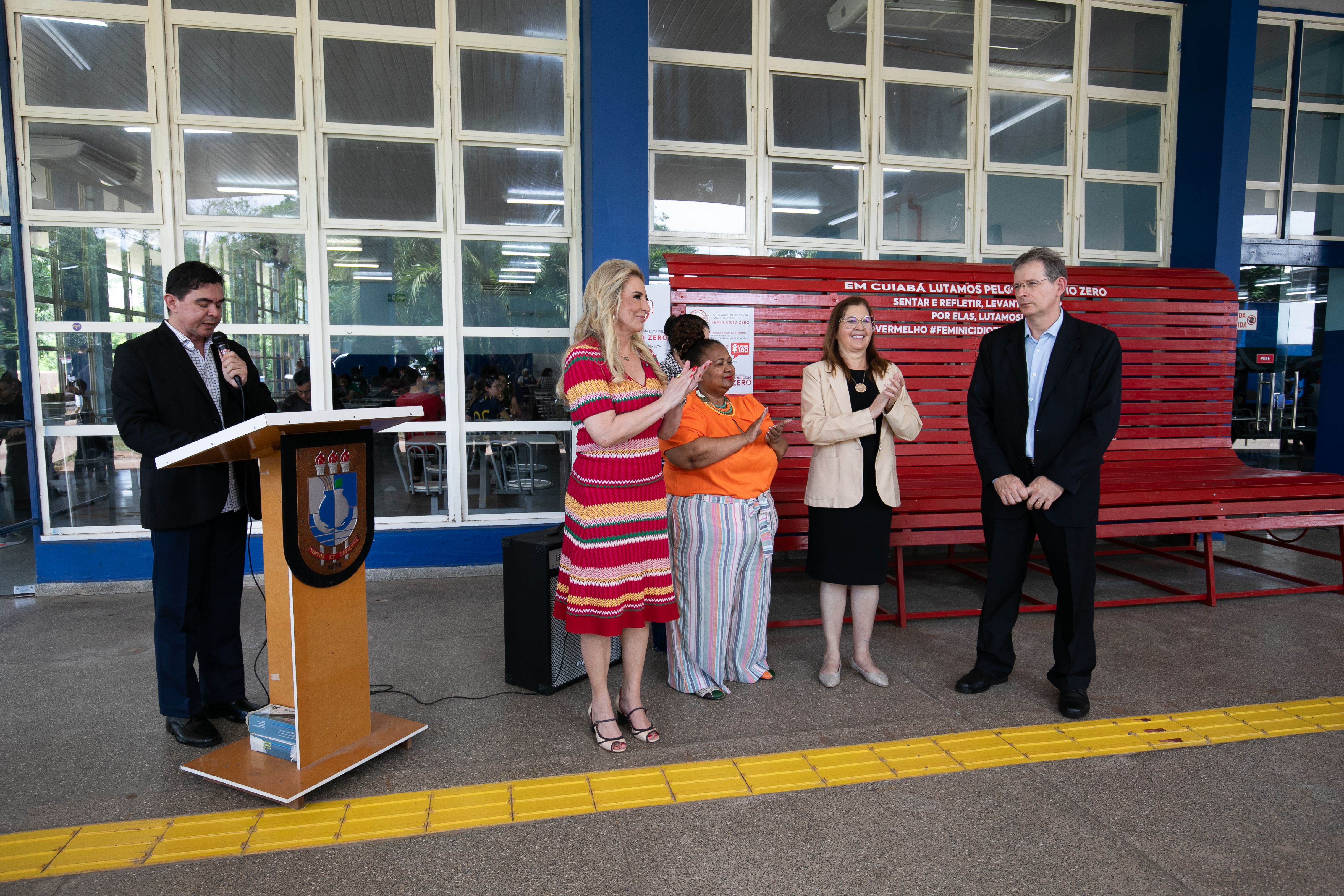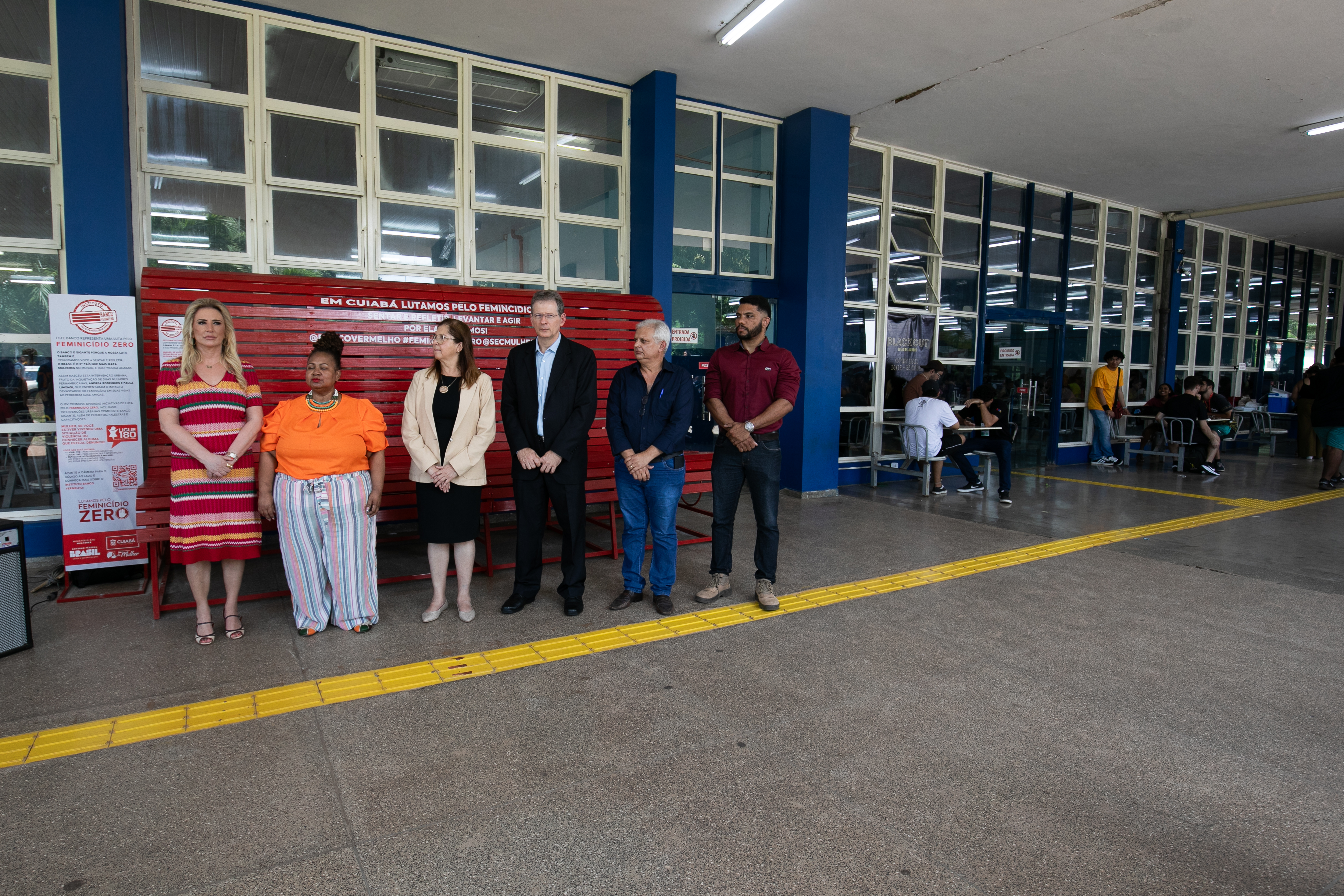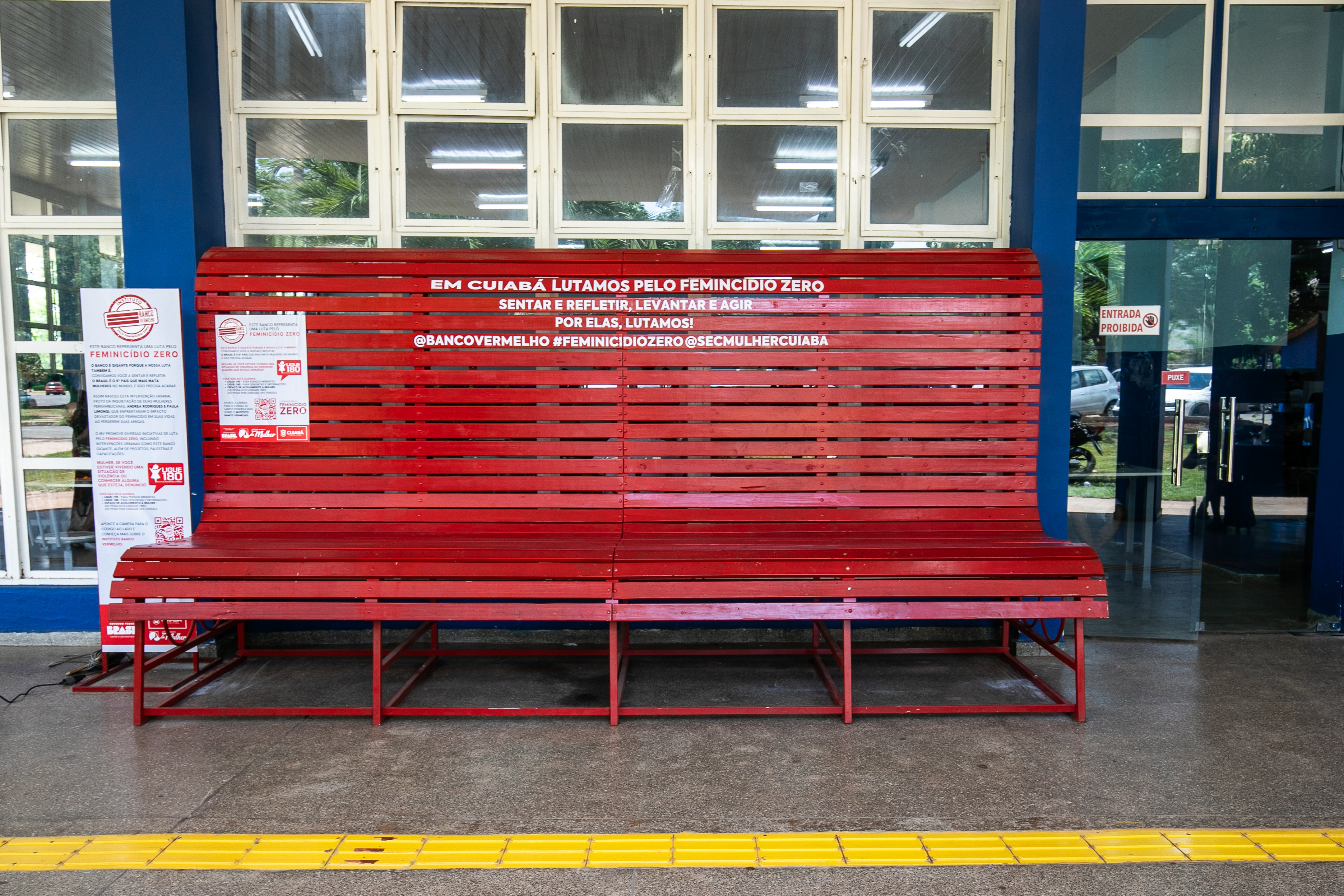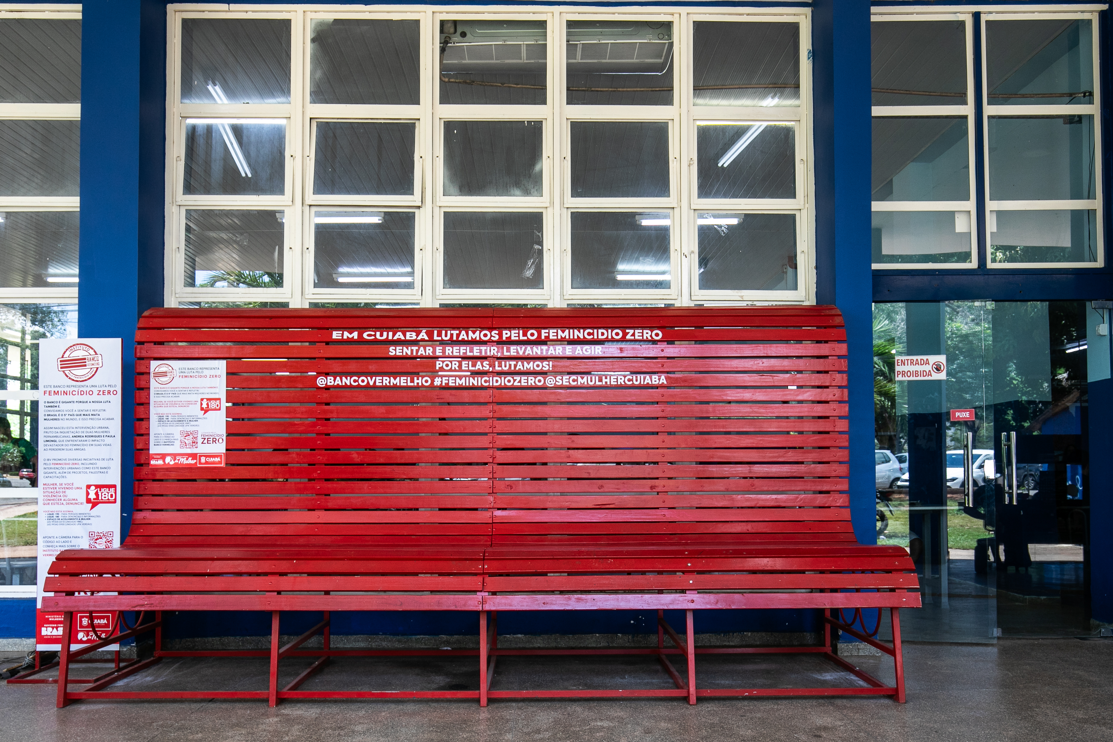 Diariamente, mais de quatro mil alunos da Universidade Federal de Mato Grosso (UFMT) serão impactados diariamente pela ação Banco Vermelho, voltada à conscientização contra a violência de gênero e o feminicídio. O lançamento do oitavo de dez bancos aconteceu nesta terça-feira (10), no Restaurante Universitário (RU) do campus da universidade. A iniciativa contou com a participação da primeira-dama de Cuiabá, Márcia Pinheiro.