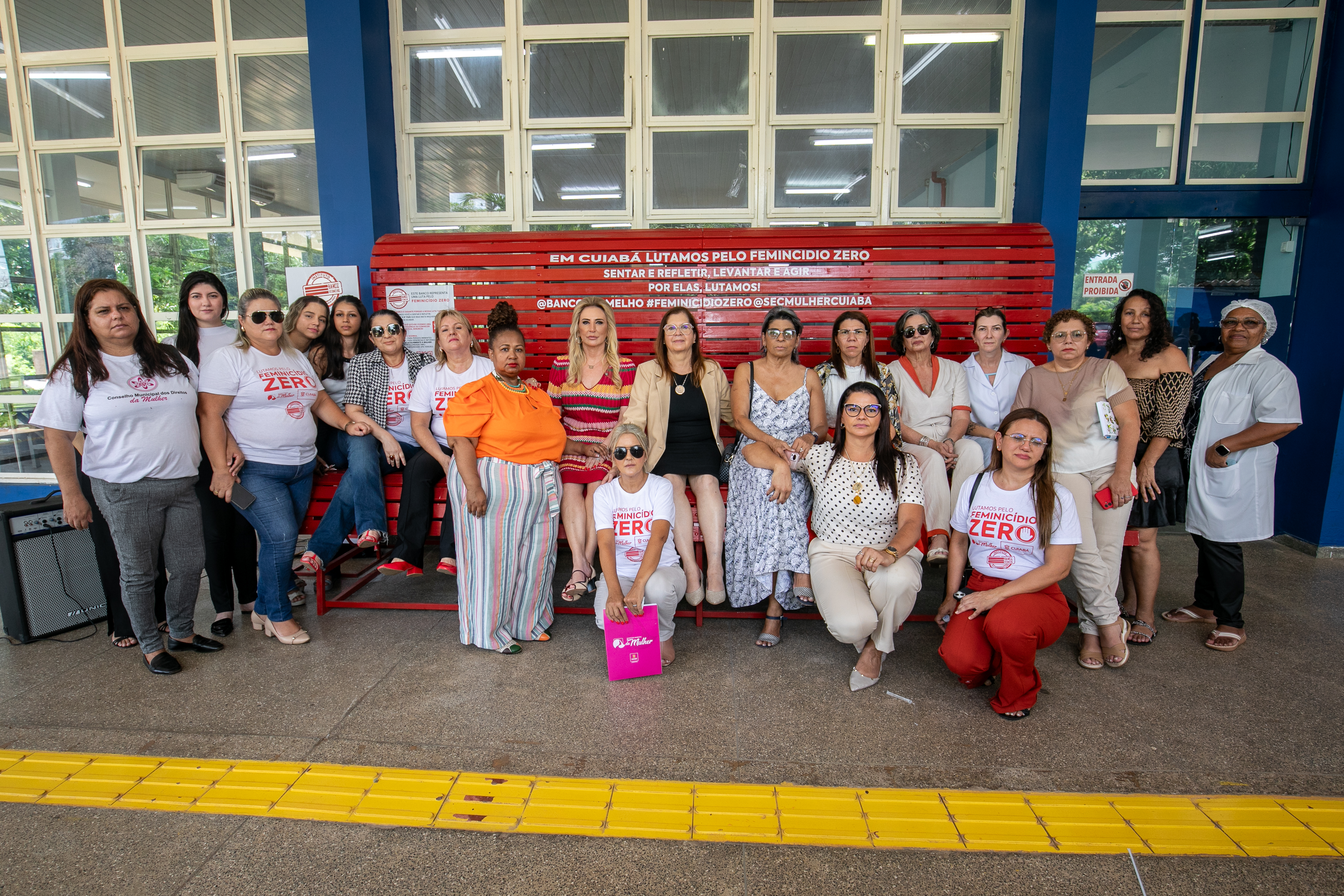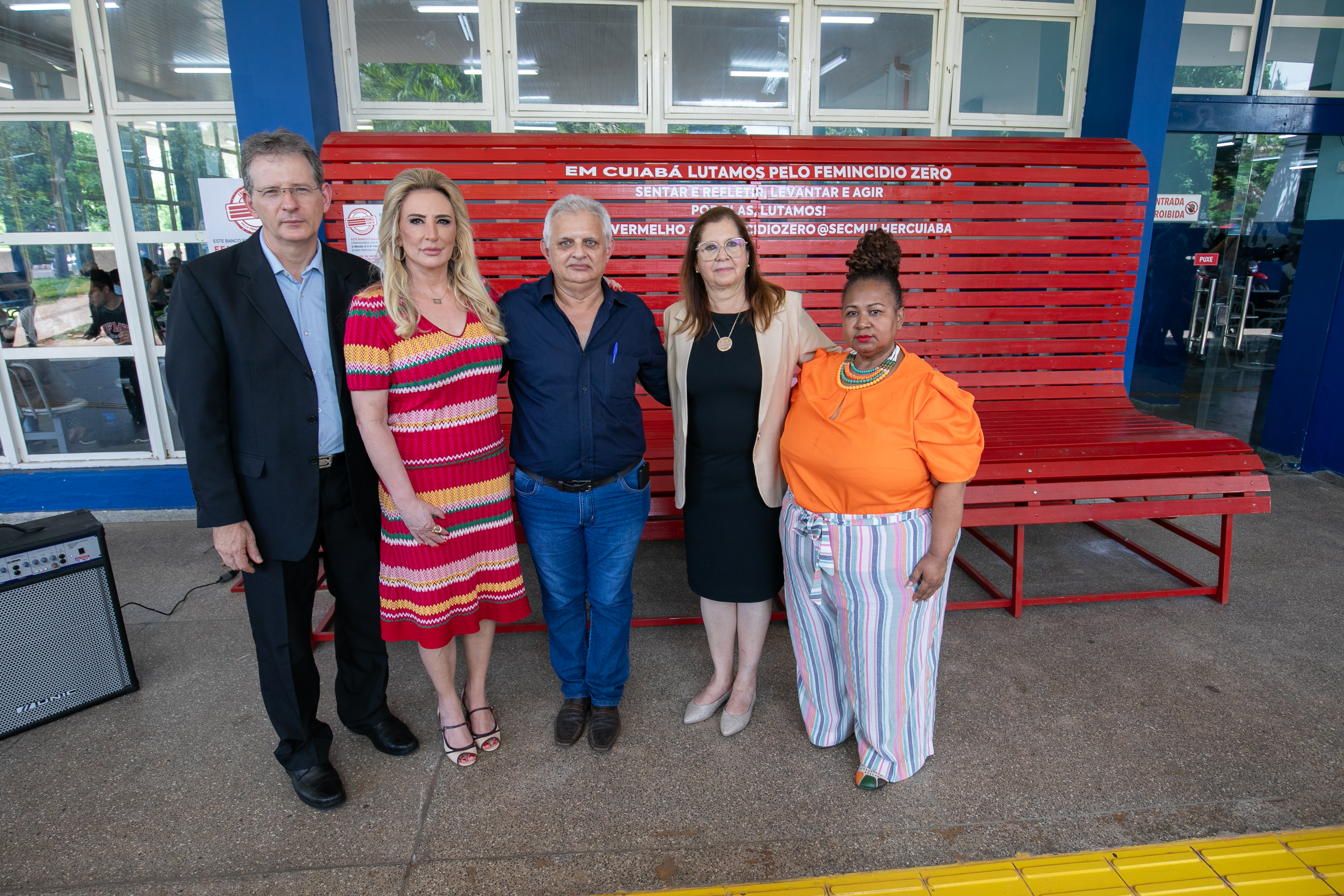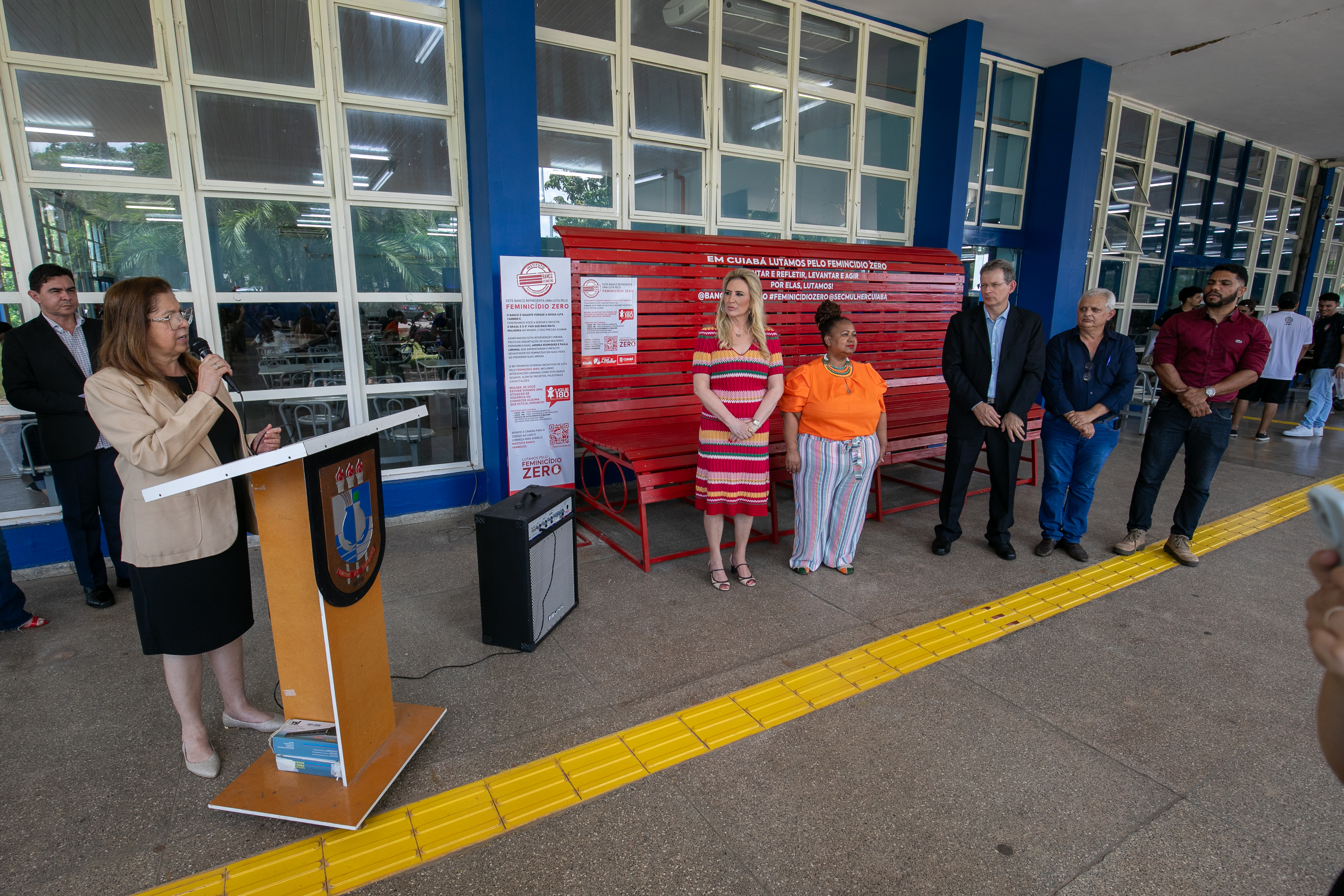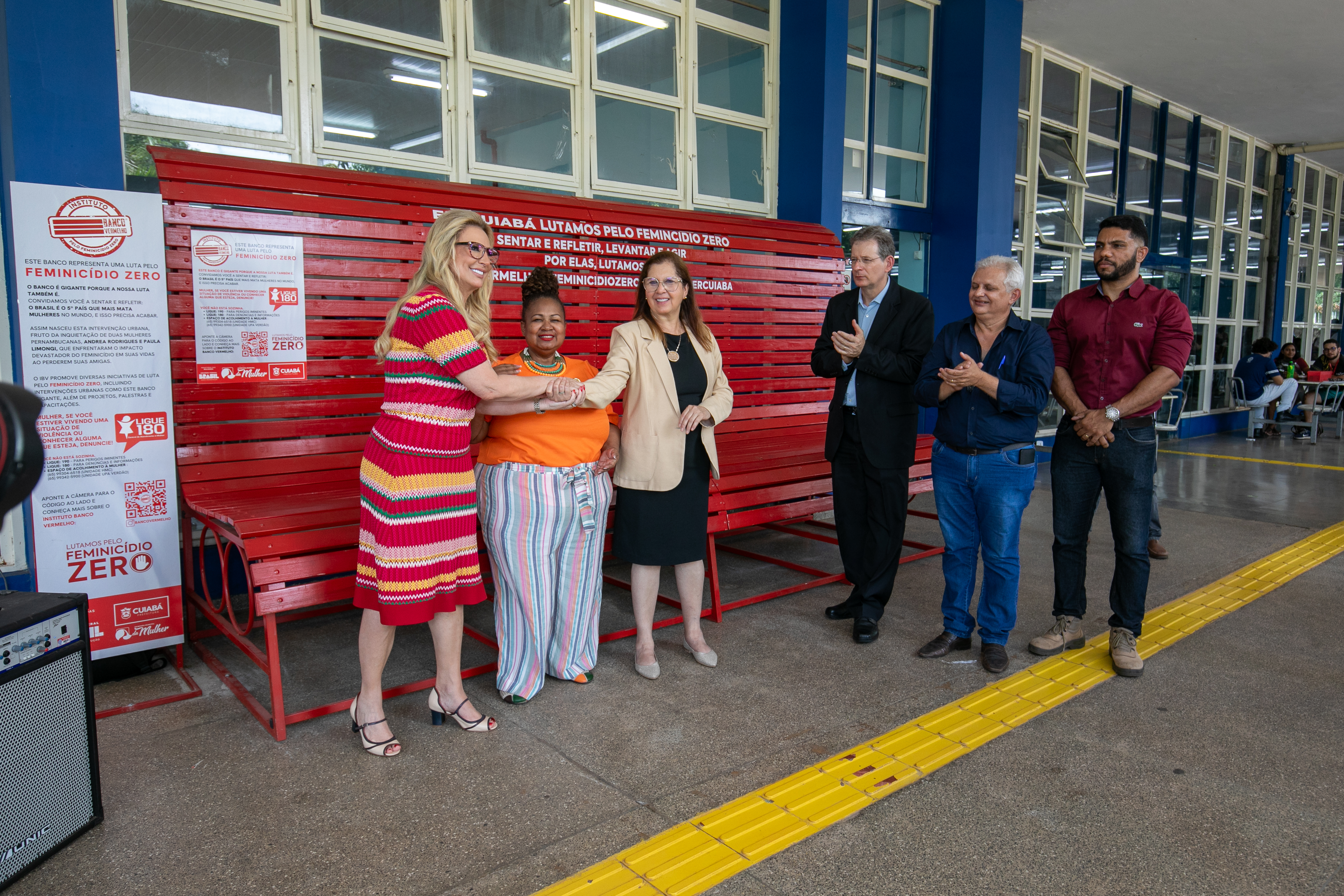 Diariamente, mais de quatro mil alunos da Universidade Federal de Mato Grosso (UFMT) serão impactados diariamente pela ação Banco Vermelho, voltada à conscientização contra a violência de gênero e o feminicídio. O lançamento do oitavo de dez bancos aconteceu nesta terça-feira (10), no Restaurante Universitário (RU) do campus da universidade. A iniciativa contou com a participação da primeira-dama de Cuiabá, Márcia Pinheiro.