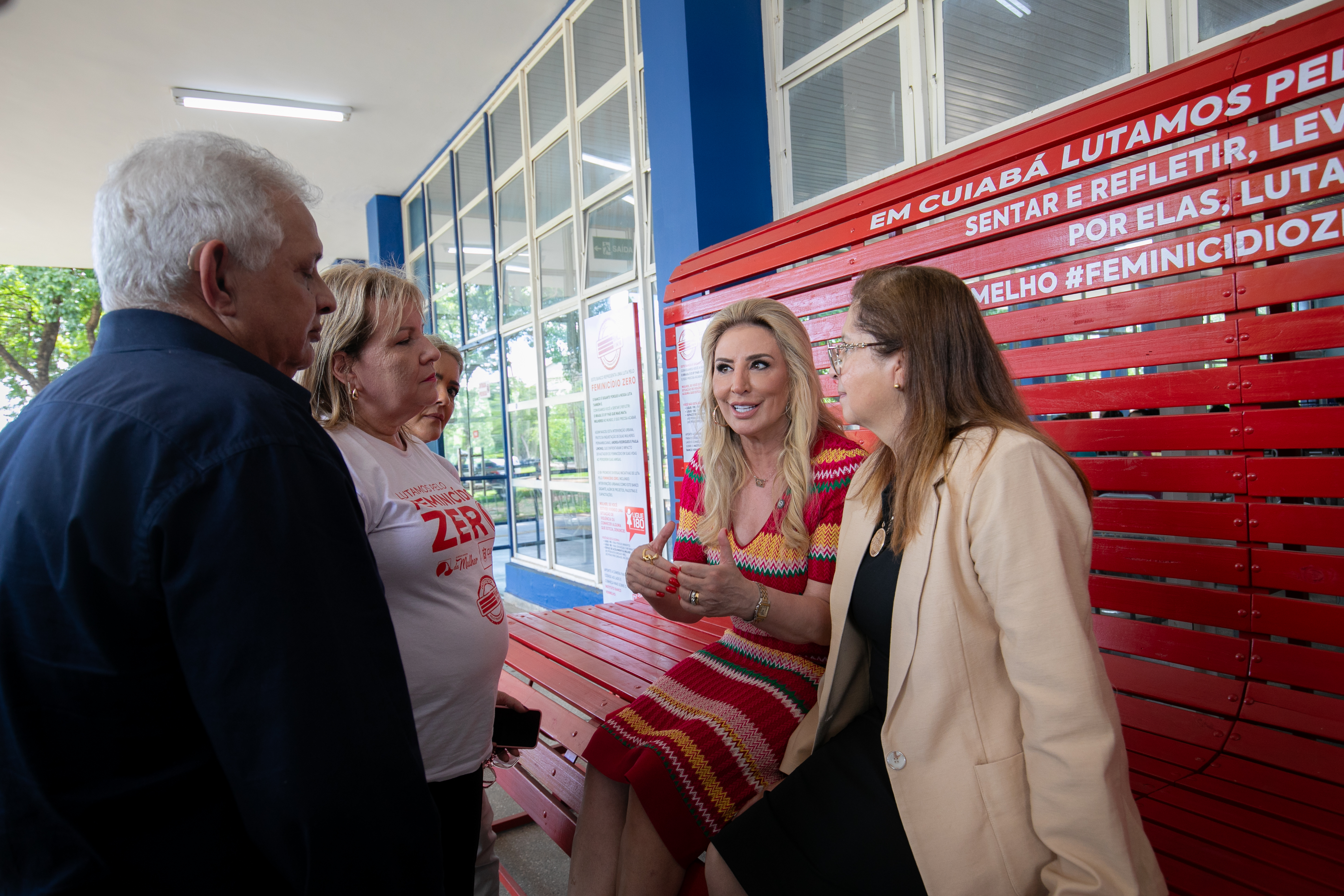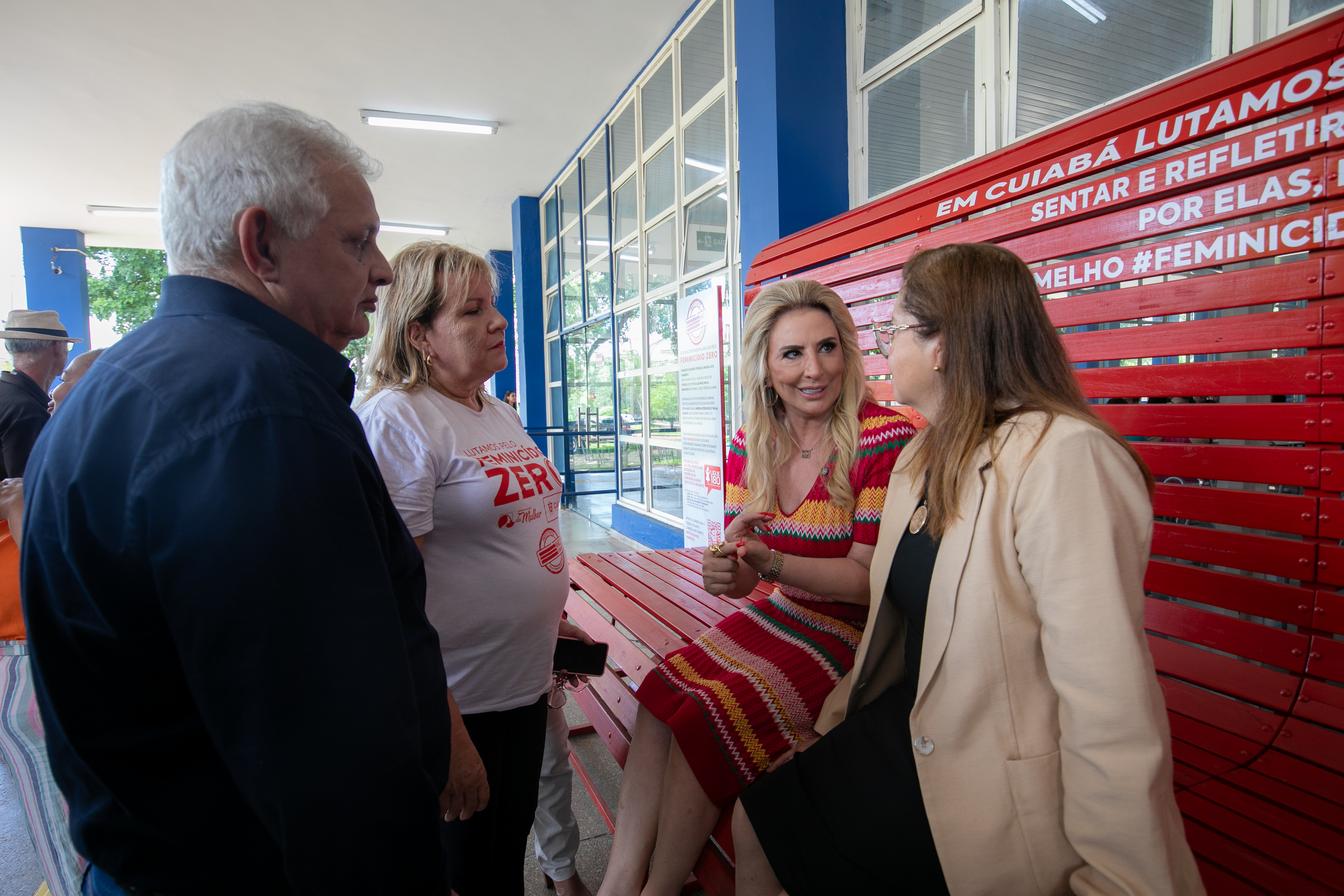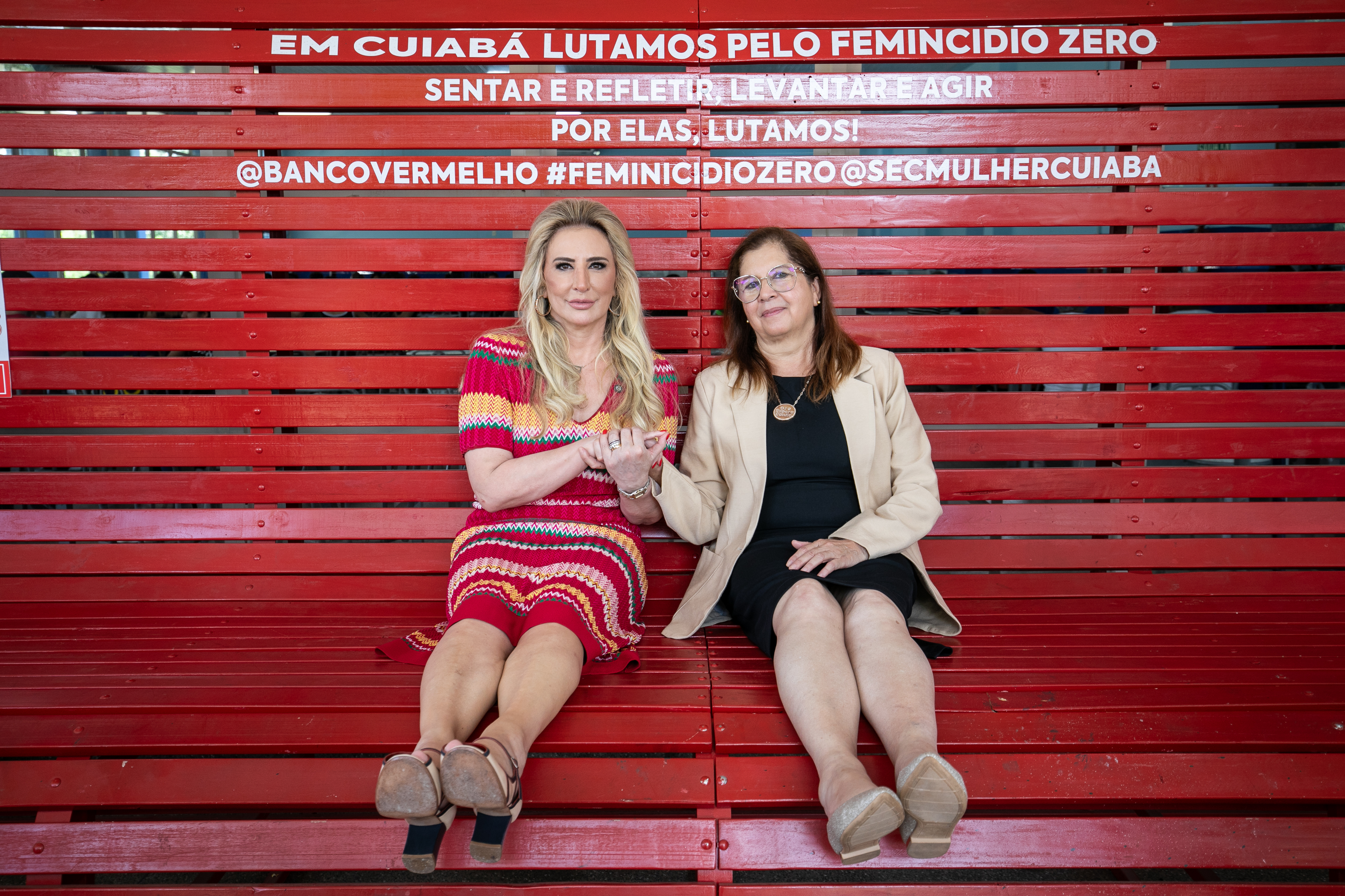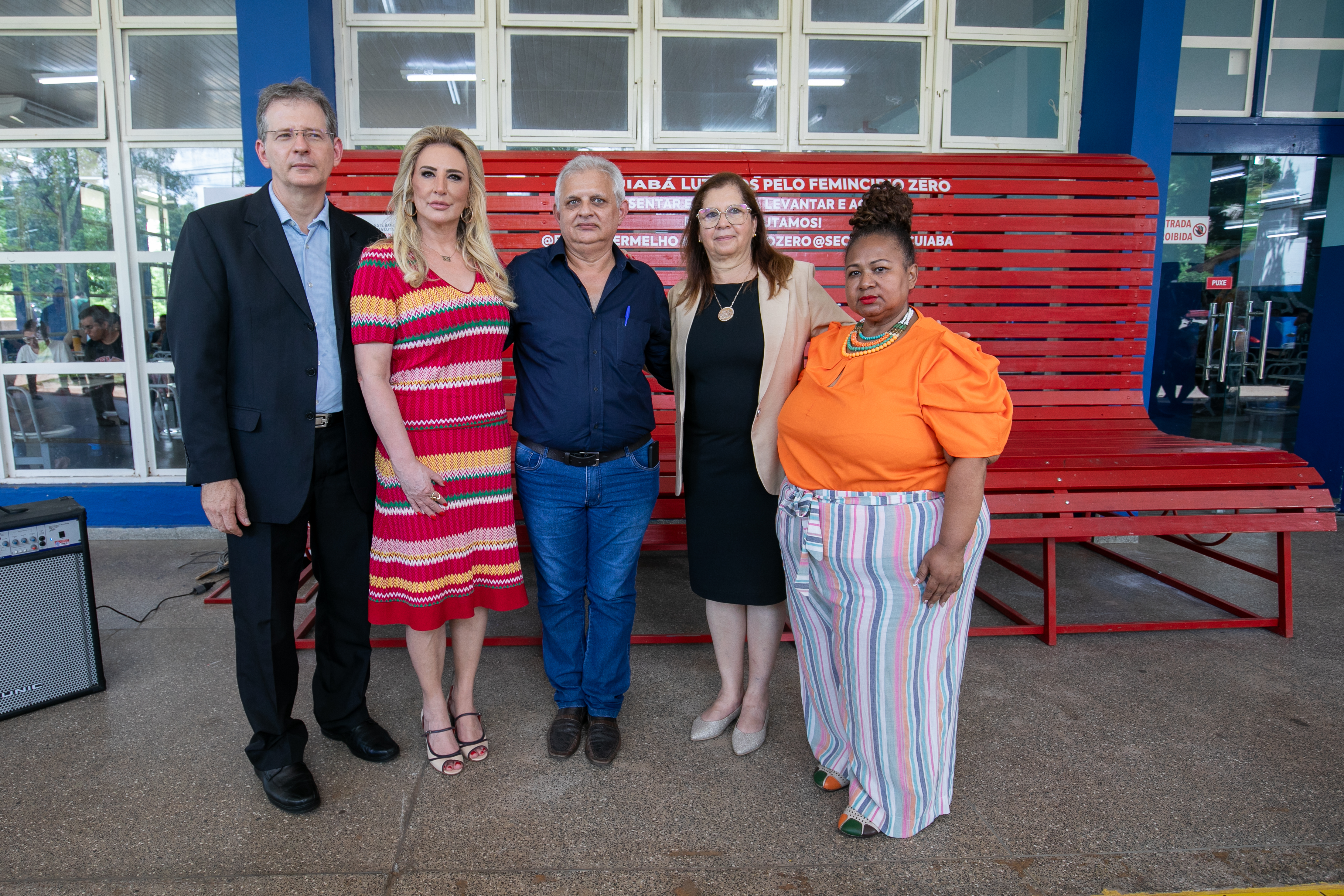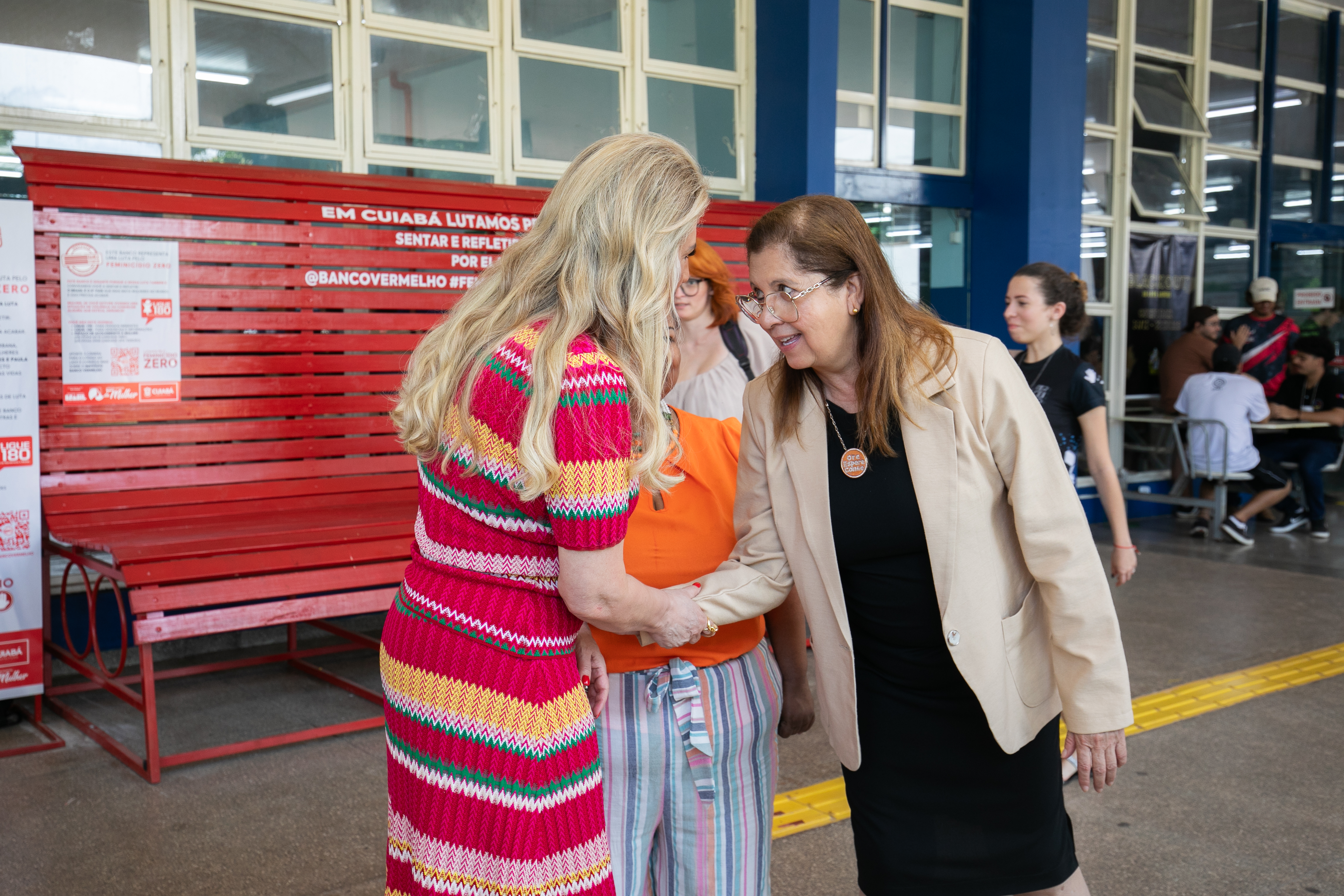 Diariamente, mais de quatro mil alunos da Universidade Federal de Mato Grosso (UFMT) serão impactados diariamente pela ação Banco Vermelho, voltada à conscientização contra a violência de gênero e o feminicídio. O lançamento do oitavo de dez bancos aconteceu nesta terça-feira (10), no Restaurante Universitário (RU) do campus da universidade. A iniciativa contou com a participação da primeira-dama de Cuiabá, Márcia Pinheiro.