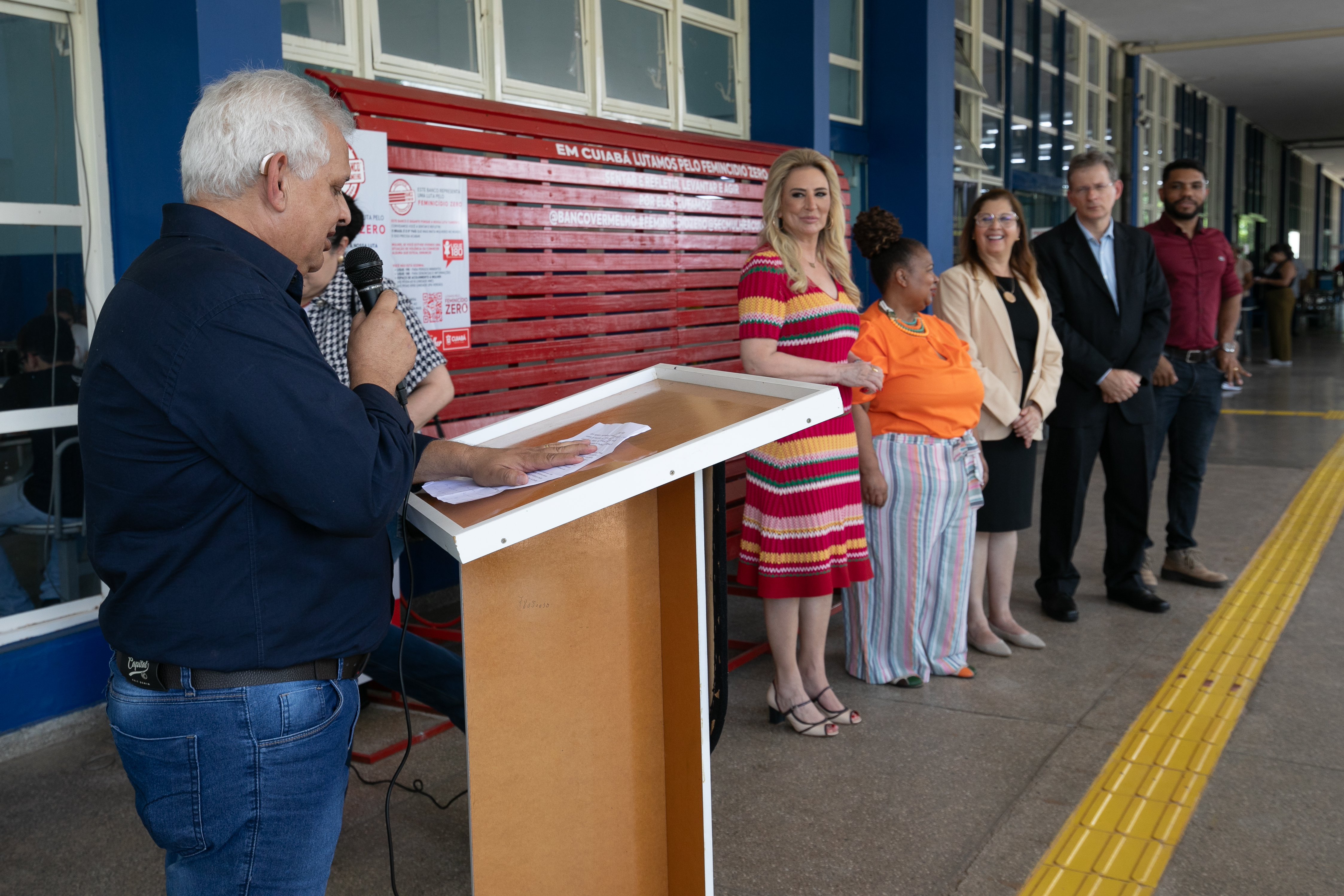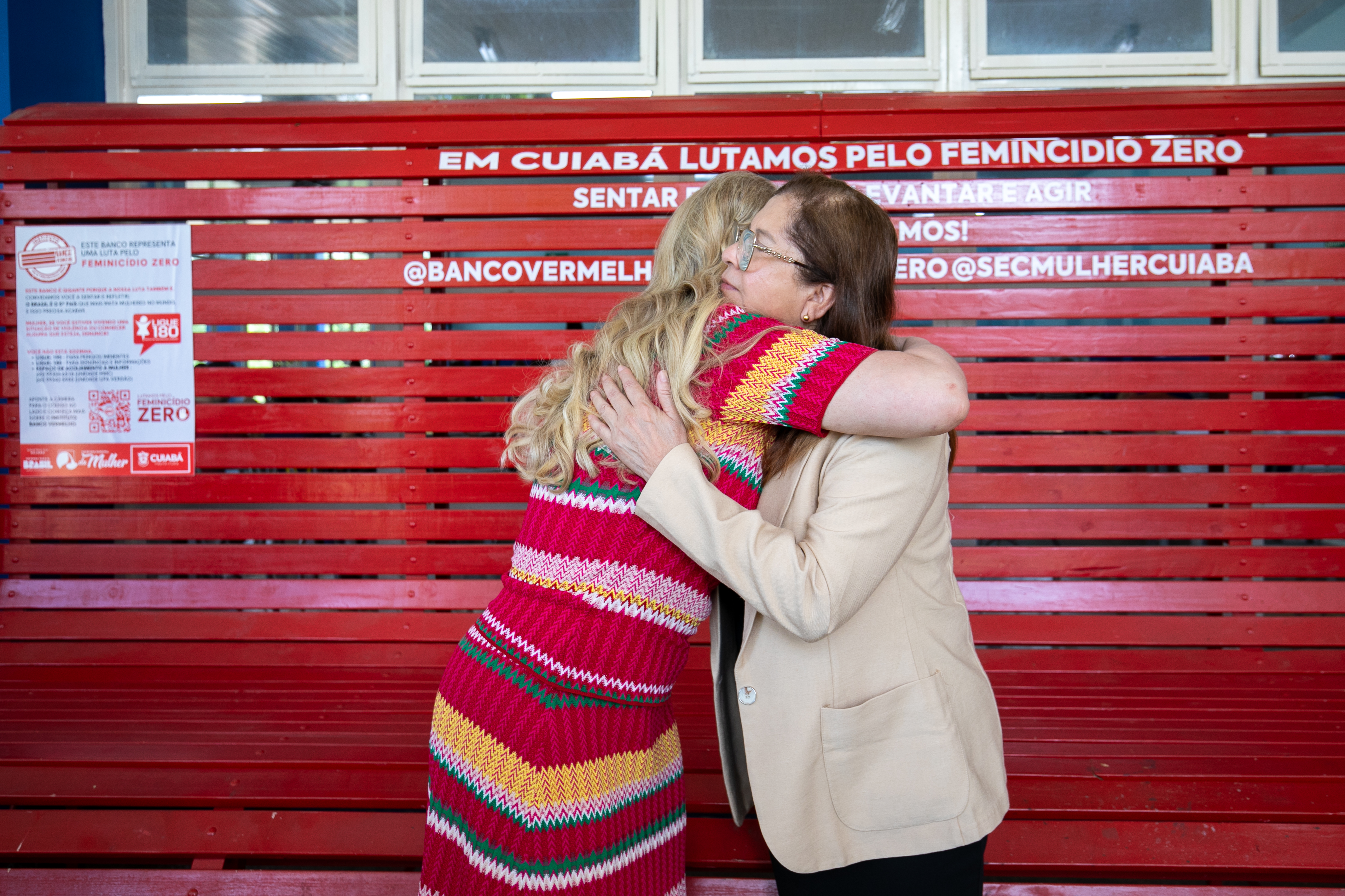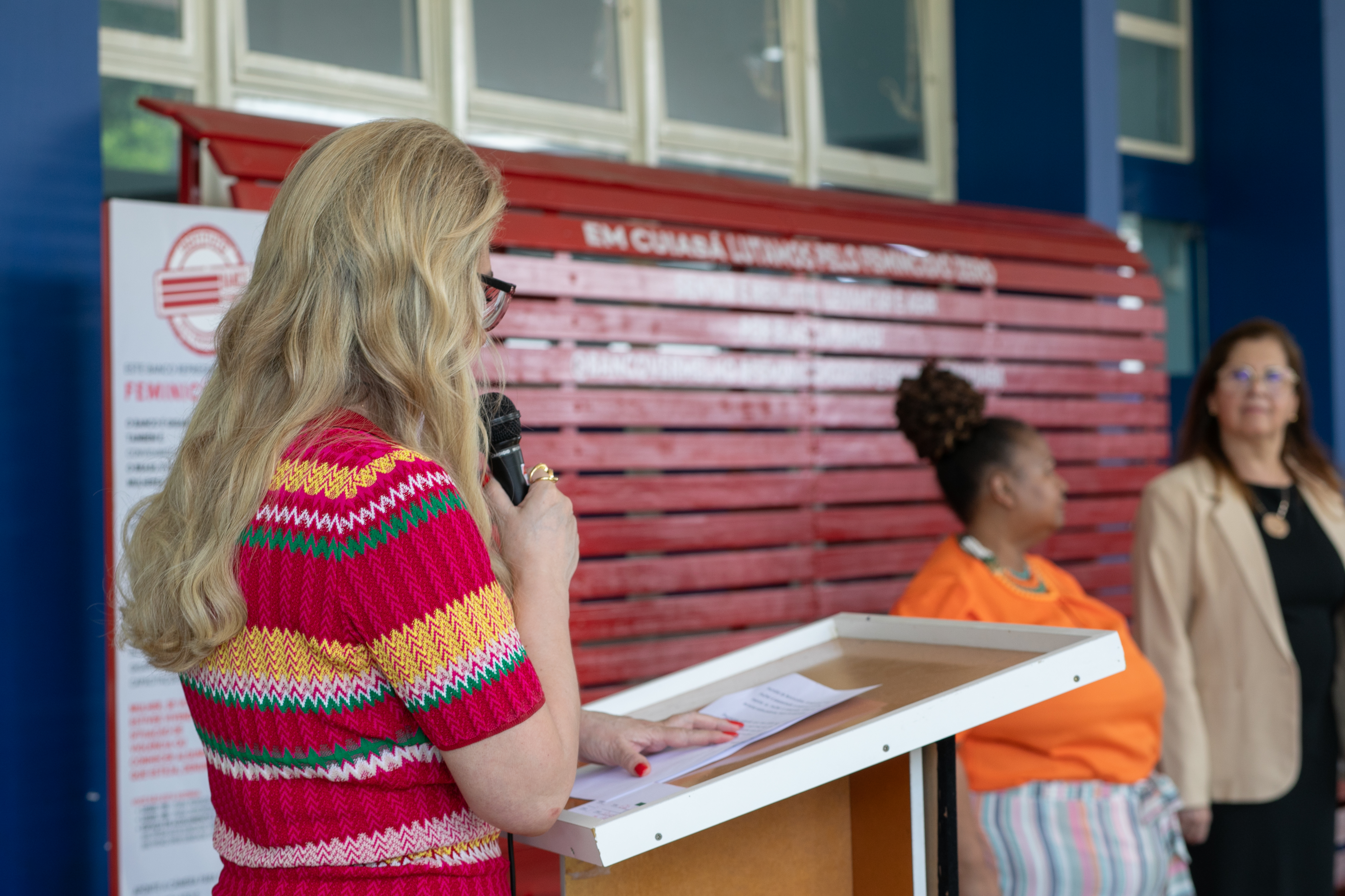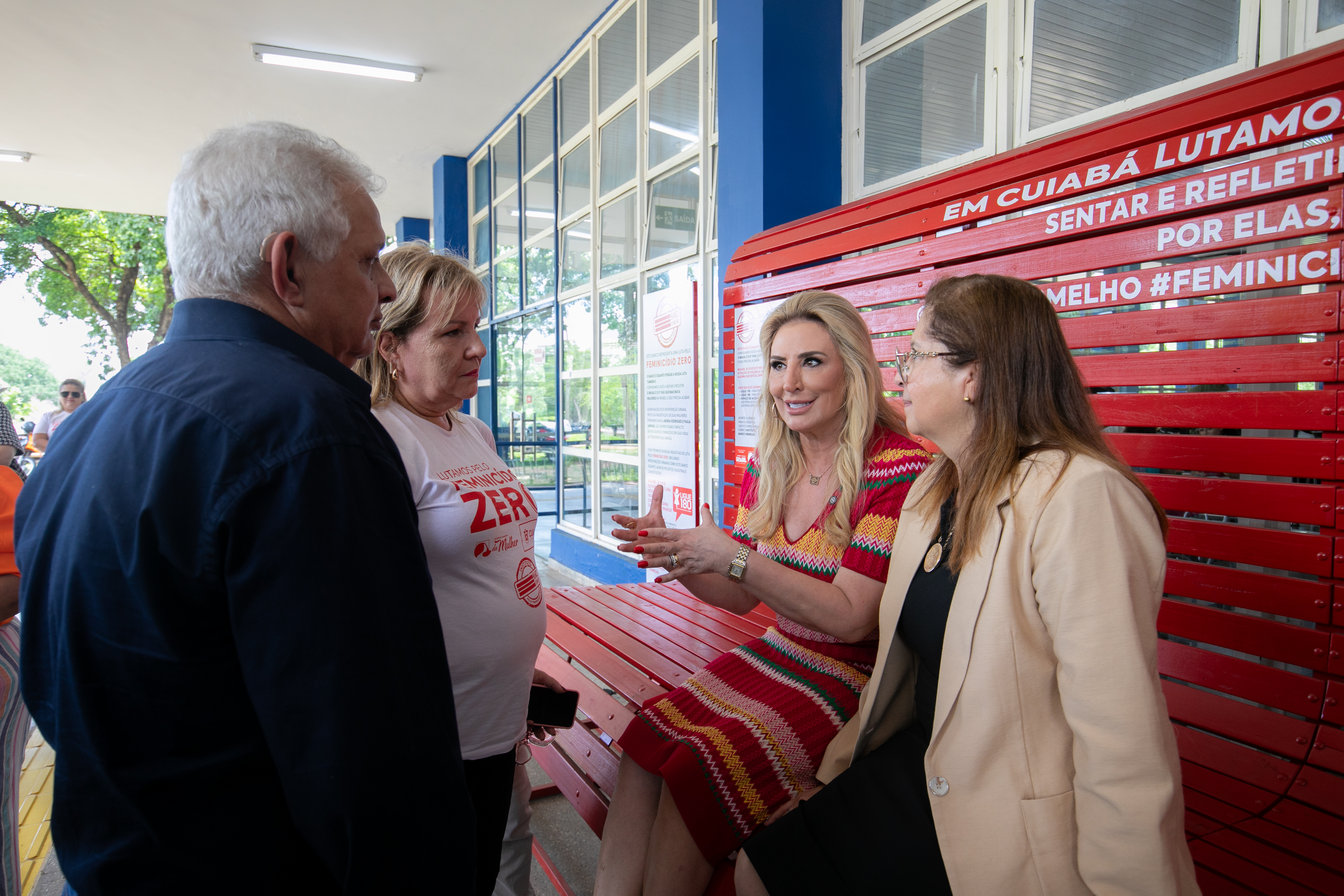 Diariamente, mais de quatro mil alunos da Universidade Federal de Mato Grosso (UFMT) serão impactados diariamente pela ação Banco Vermelho, voltada à conscientização contra a violência de gênero e o feminicídio. O lançamento do oitavo de dez bancos aconteceu nesta terça-feira (10), no Restaurante Universitário (RU) do campus da universidade. A iniciativa contou com a participação da primeira-dama de Cuiabá, Márcia Pinheiro.