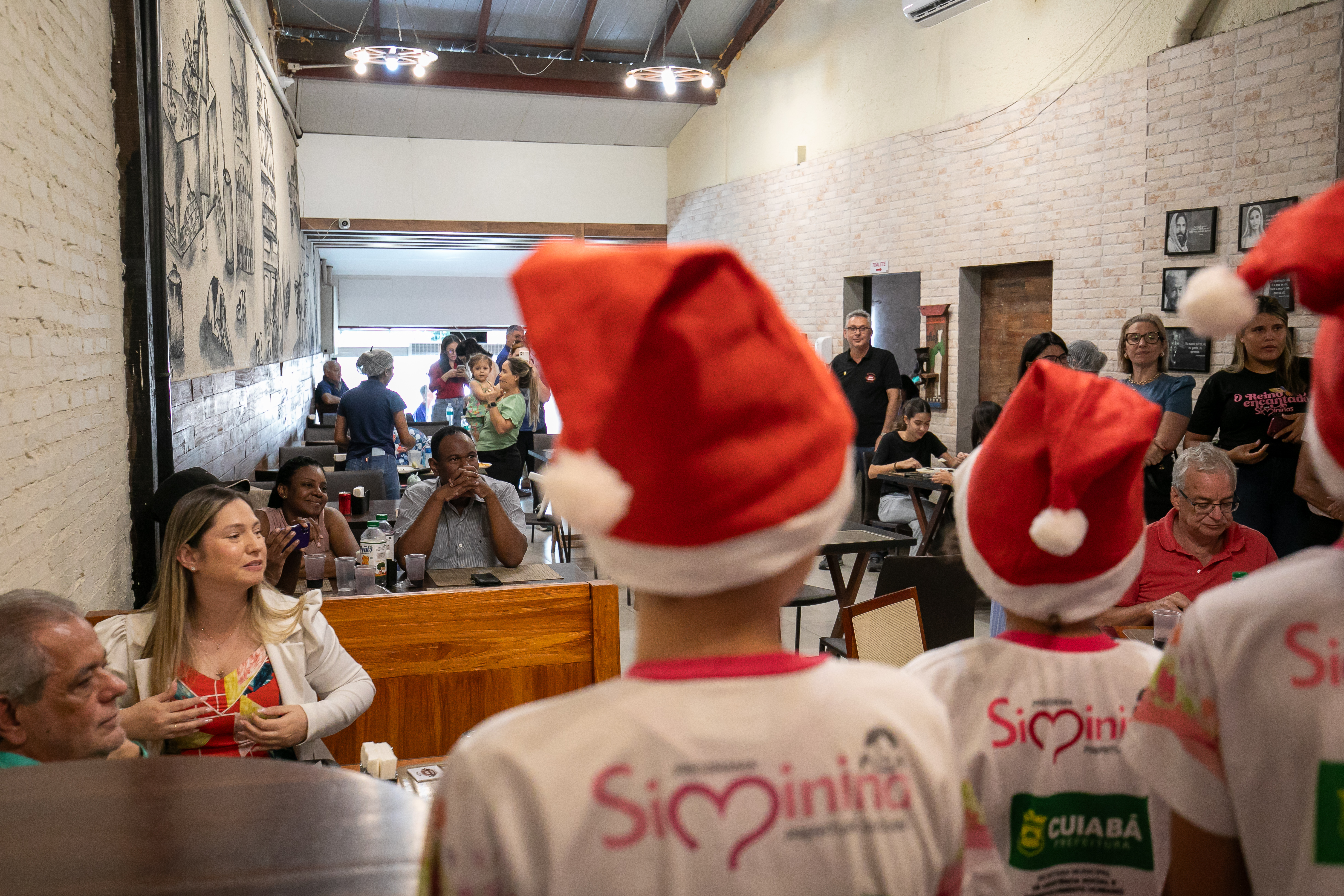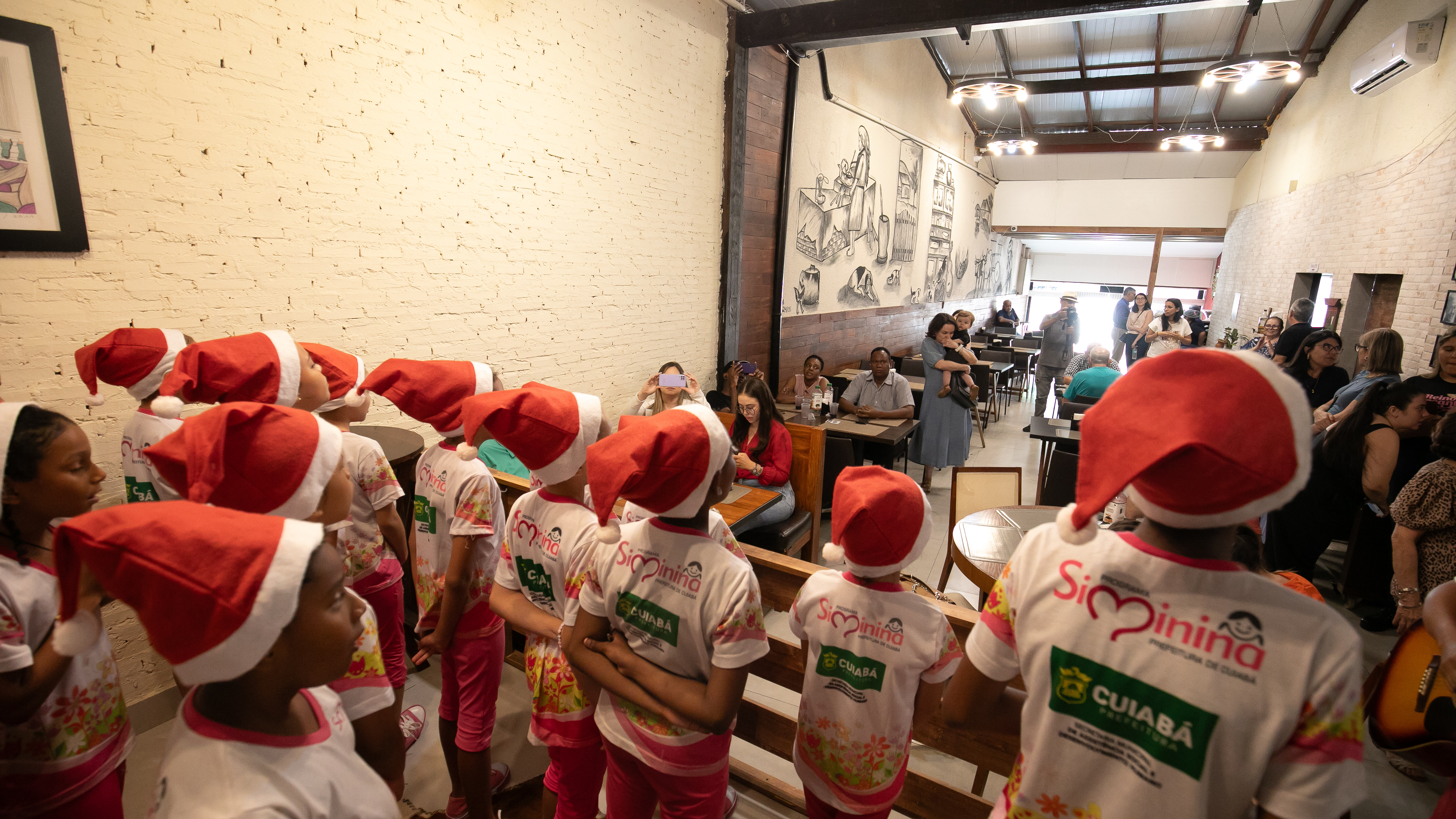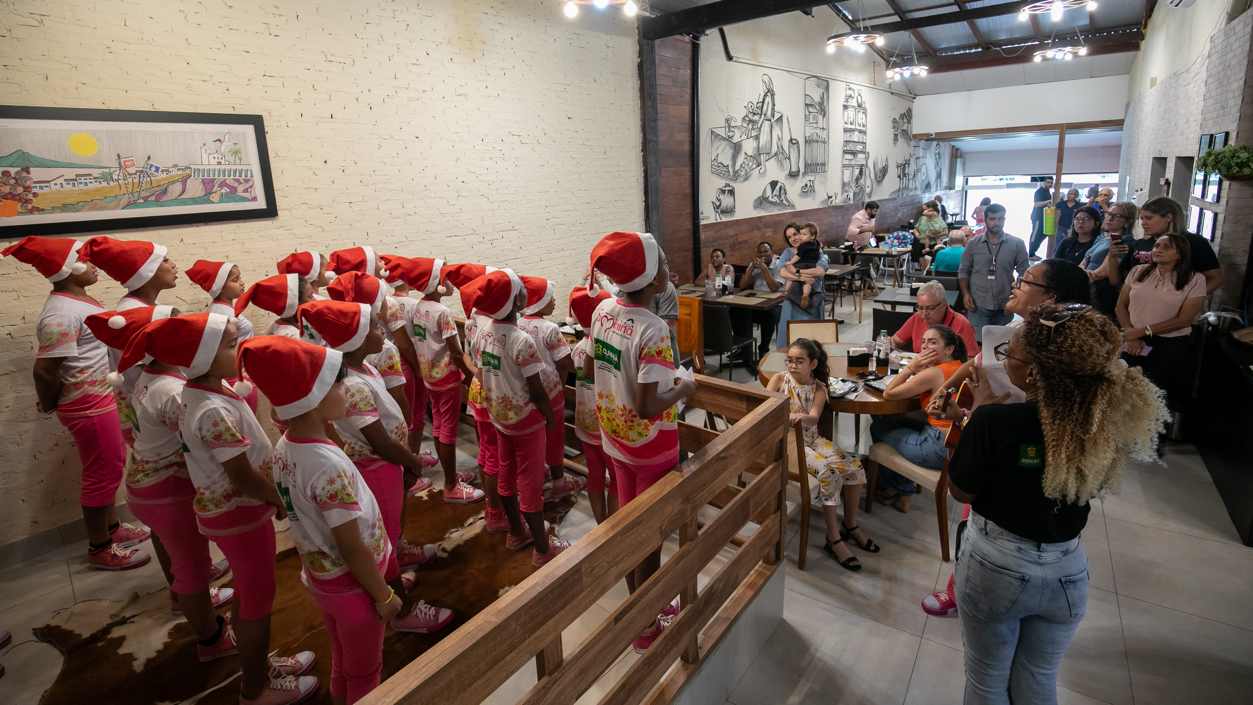 Uniformizadas e com adornos natalinos, as participantes do Programa Siminina, promovido pela Prefeitura de Cuiabá, através da Secretaria Municipal de Assistência Social, Direitos Humanos e da Pessoa com Deficiência, encantaram o público com uma apresentação musical especial nesta quarta-feira (4). O evento ocorreu no restaurante Arte na Roça, um dos parceiros do programa, proporcionando aos clientes uma experiência única ao desfrutarem de pratos regionais ao som de canções natalinas interpretadas pelo coral das meninas.