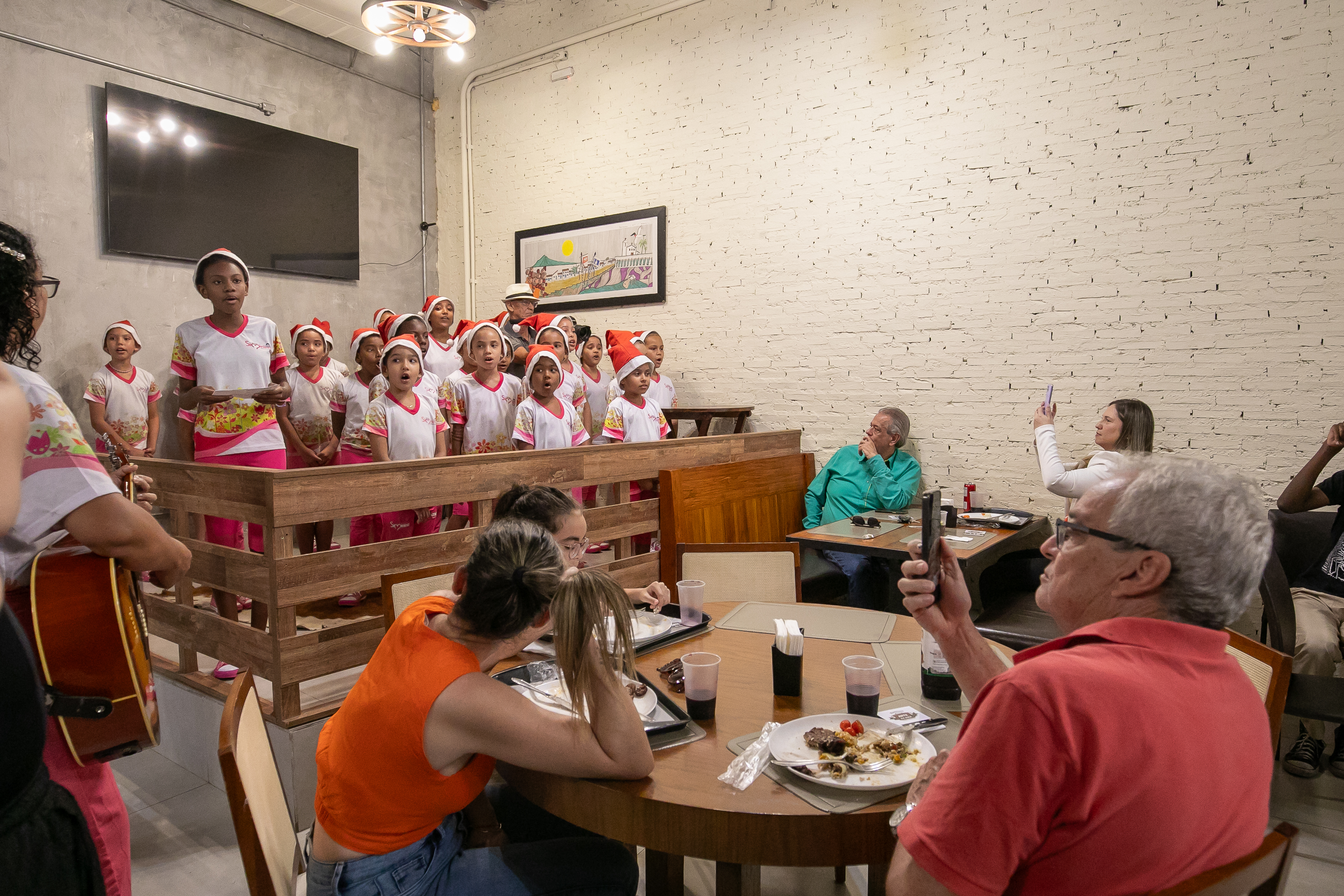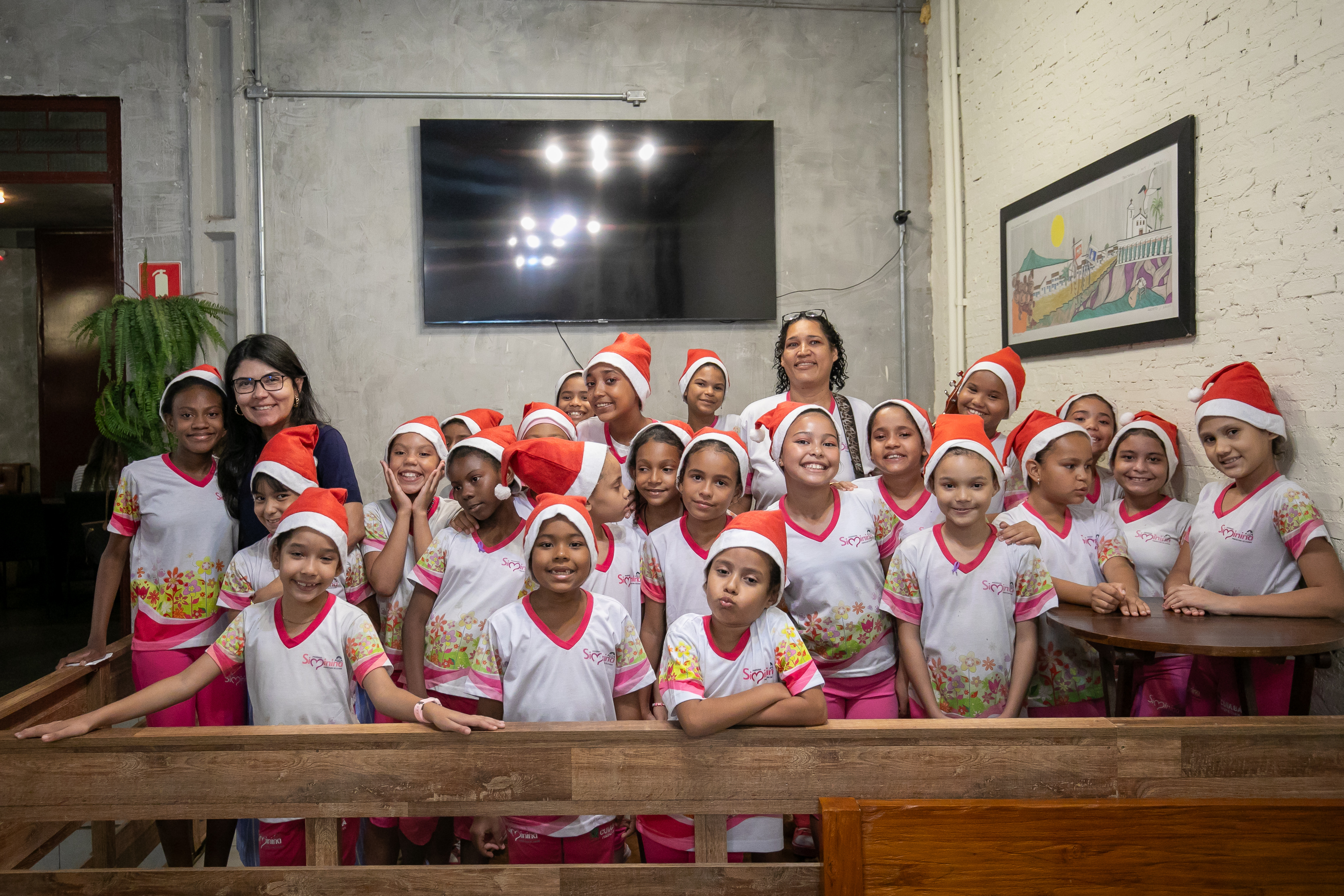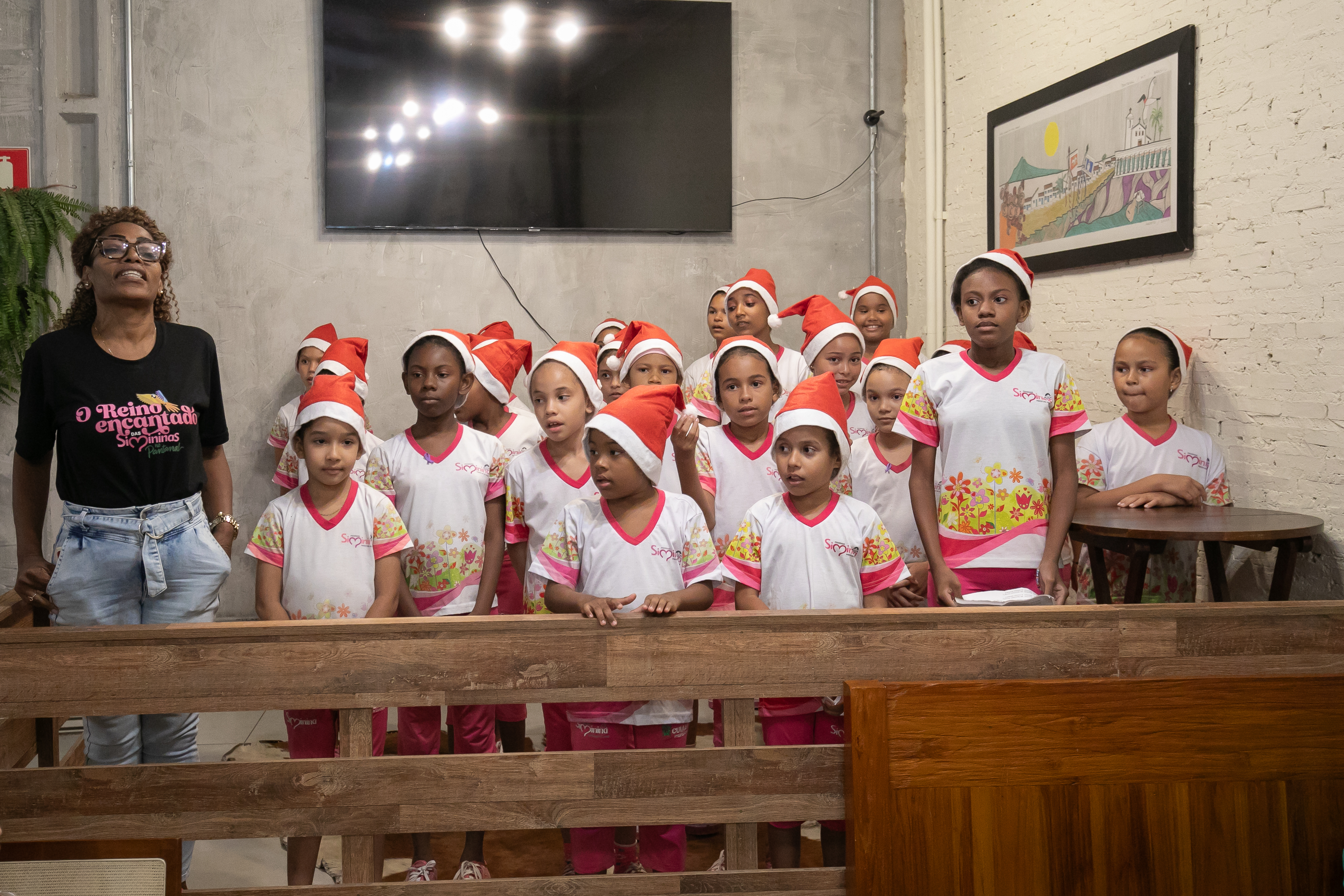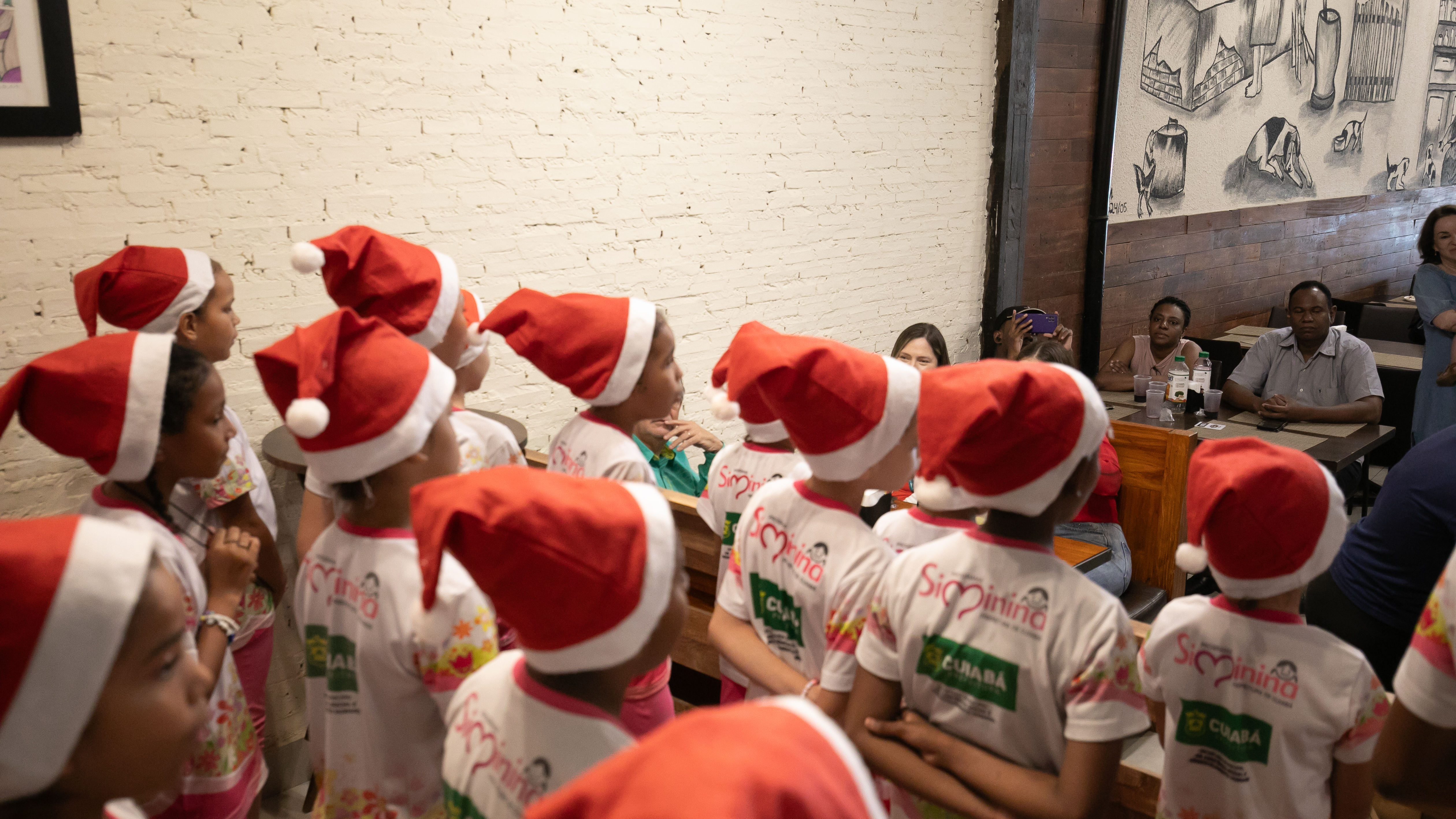 Uniformizadas e com adornos natalinos, as participantes do Programa Siminina, promovido pela Prefeitura de Cuiabá, através da Secretaria Municipal de Assistência Social, Direitos Humanos e da Pessoa com Deficiência, encantaram o público com uma apresentação musical especial nesta quarta-feira (4). O evento ocorreu no restaurante Arte na Roça, um dos parceiros do programa, proporcionando aos clientes uma experiência única ao desfrutarem de pratos regionais ao som de canções natalinas interpretadas pelo coral das meninas.