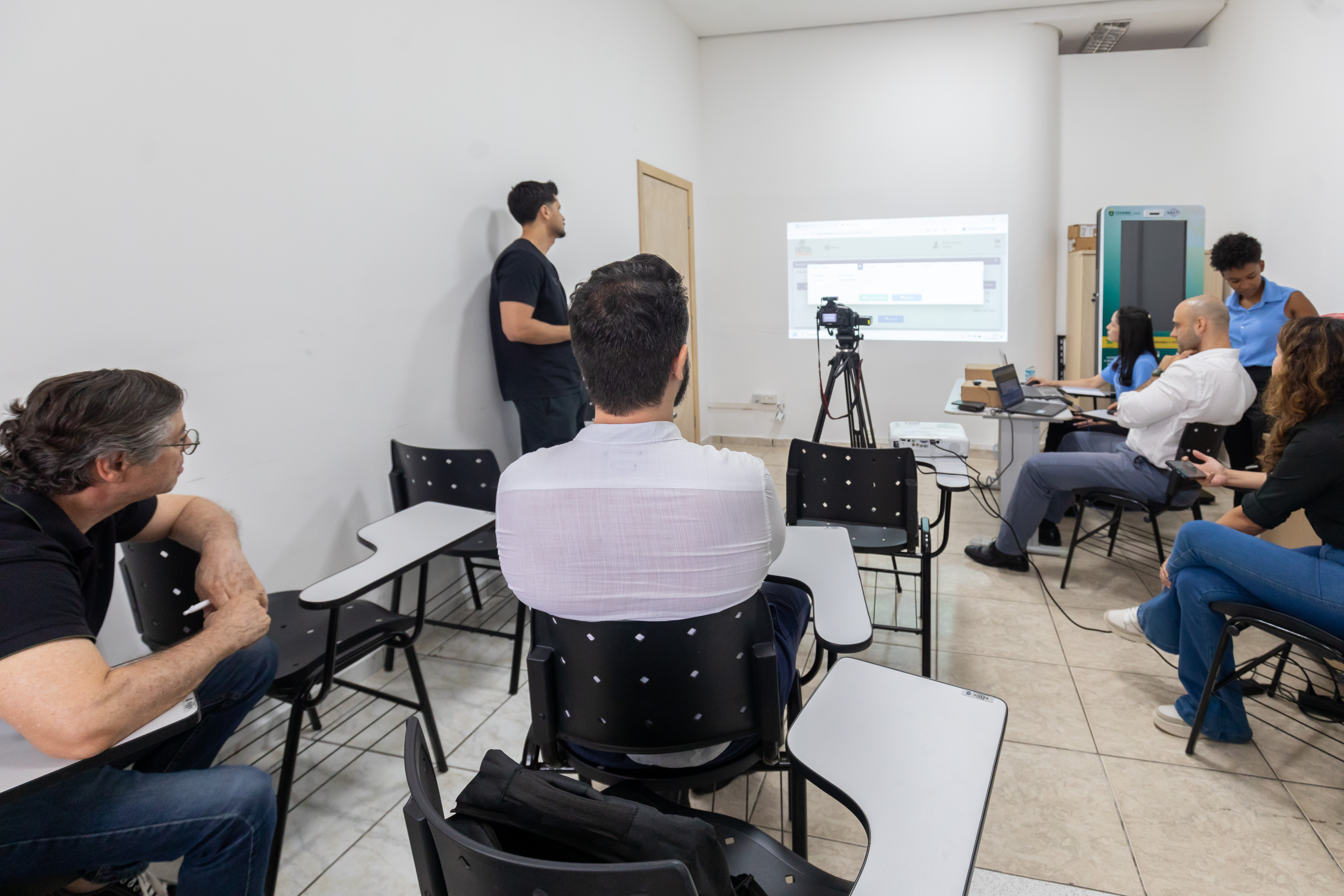 A foto ilustra servidores públicos sentados em cadeira almofadadas e prestando atenção numa teça que exibe nomes extraídos do sorteio da Nota Cuiabana. O cenário é uma sala com paredes brancas e uma porta de cor bege clara.