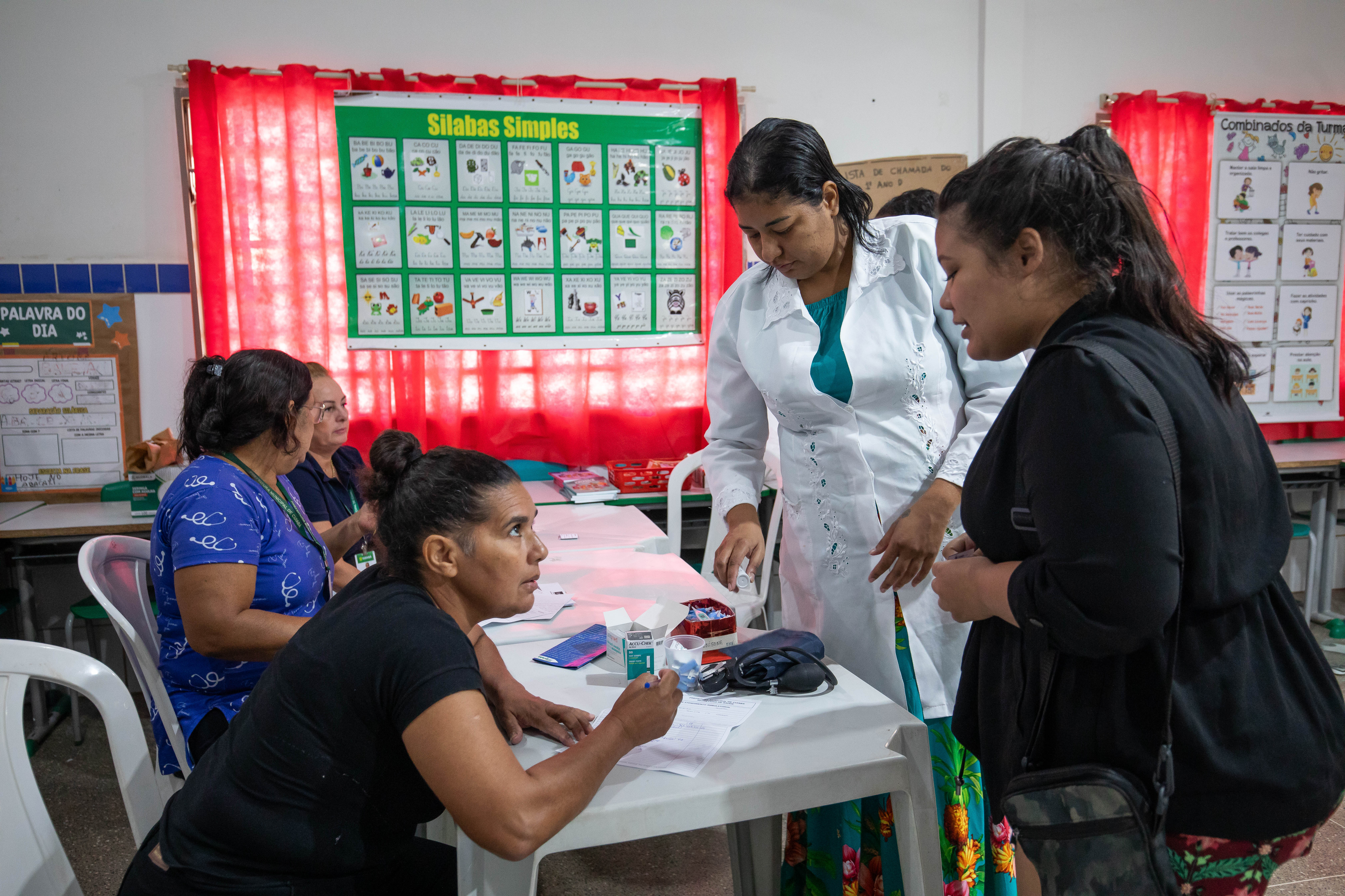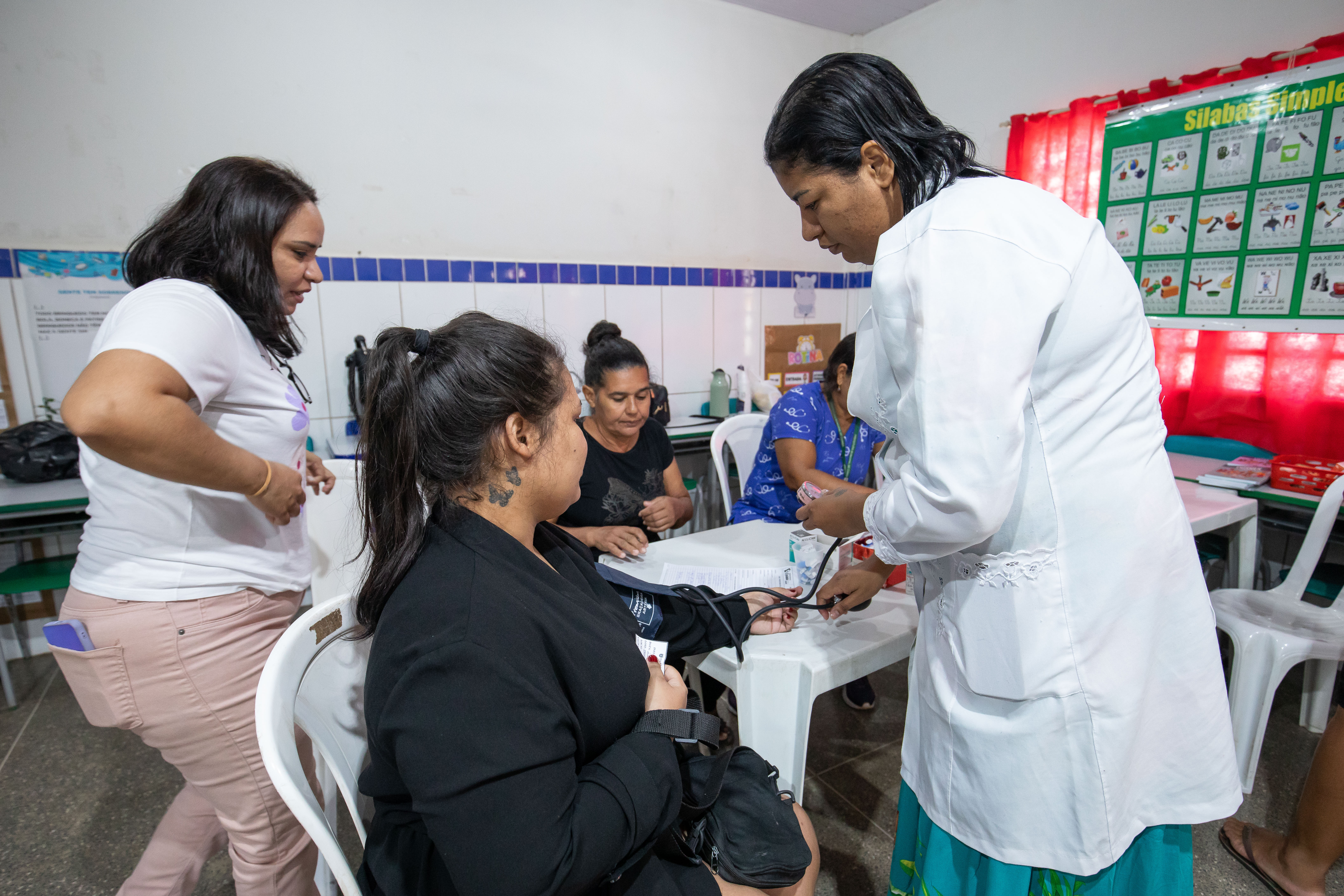 A foto registra o momento do atendimento à comunidade do bairro Altos da Glória, durante o “Mutirão Especial do Mês das Mães”.