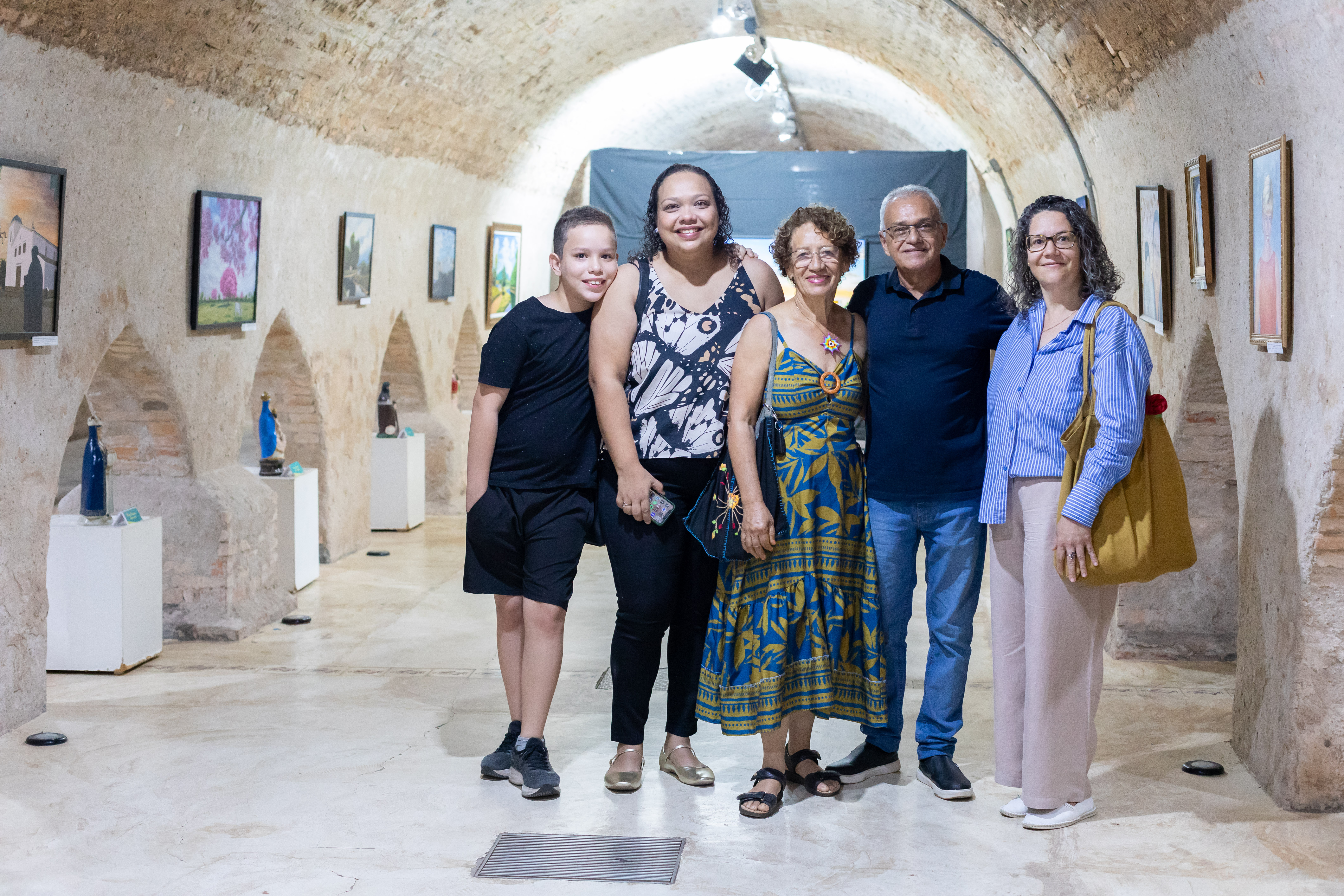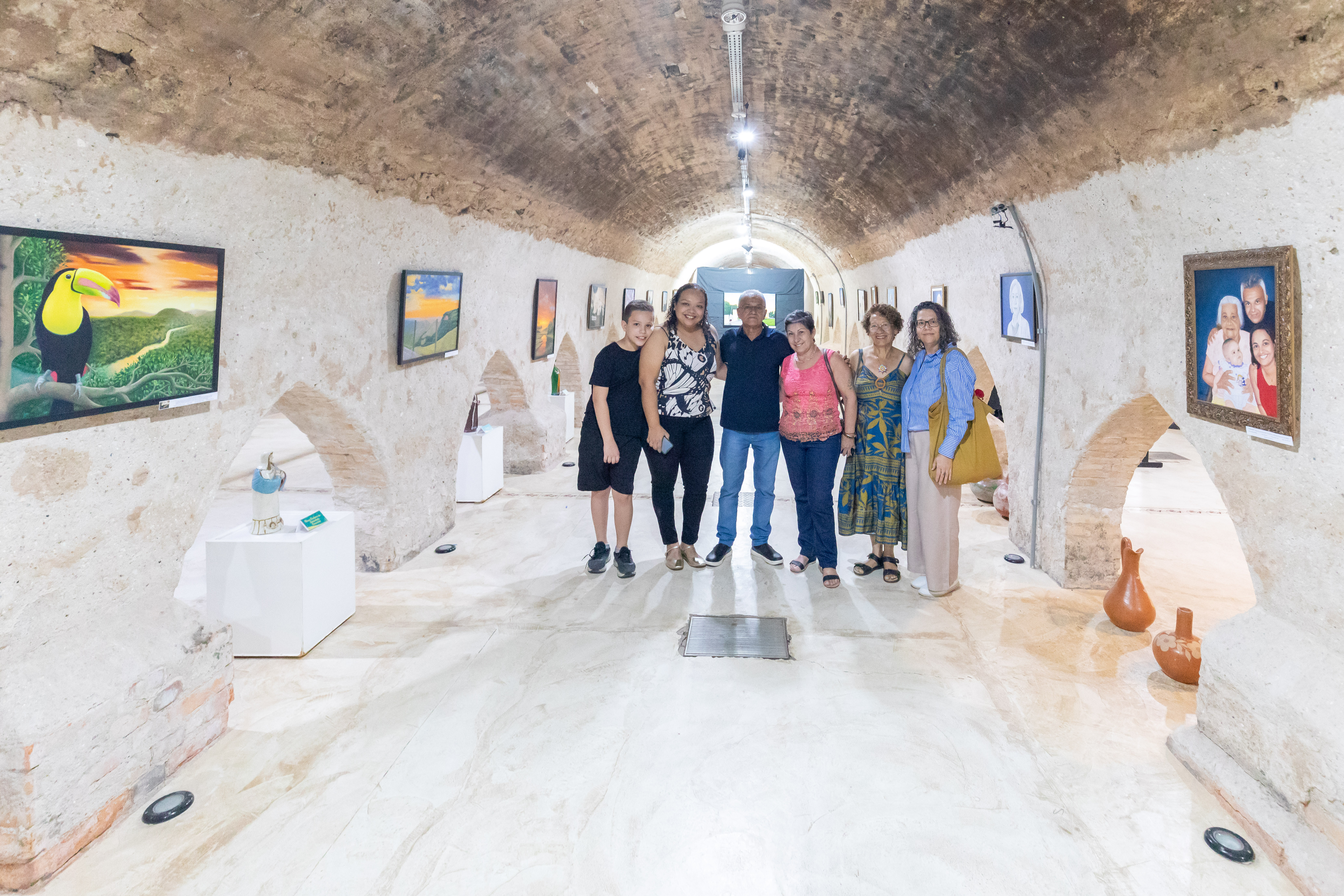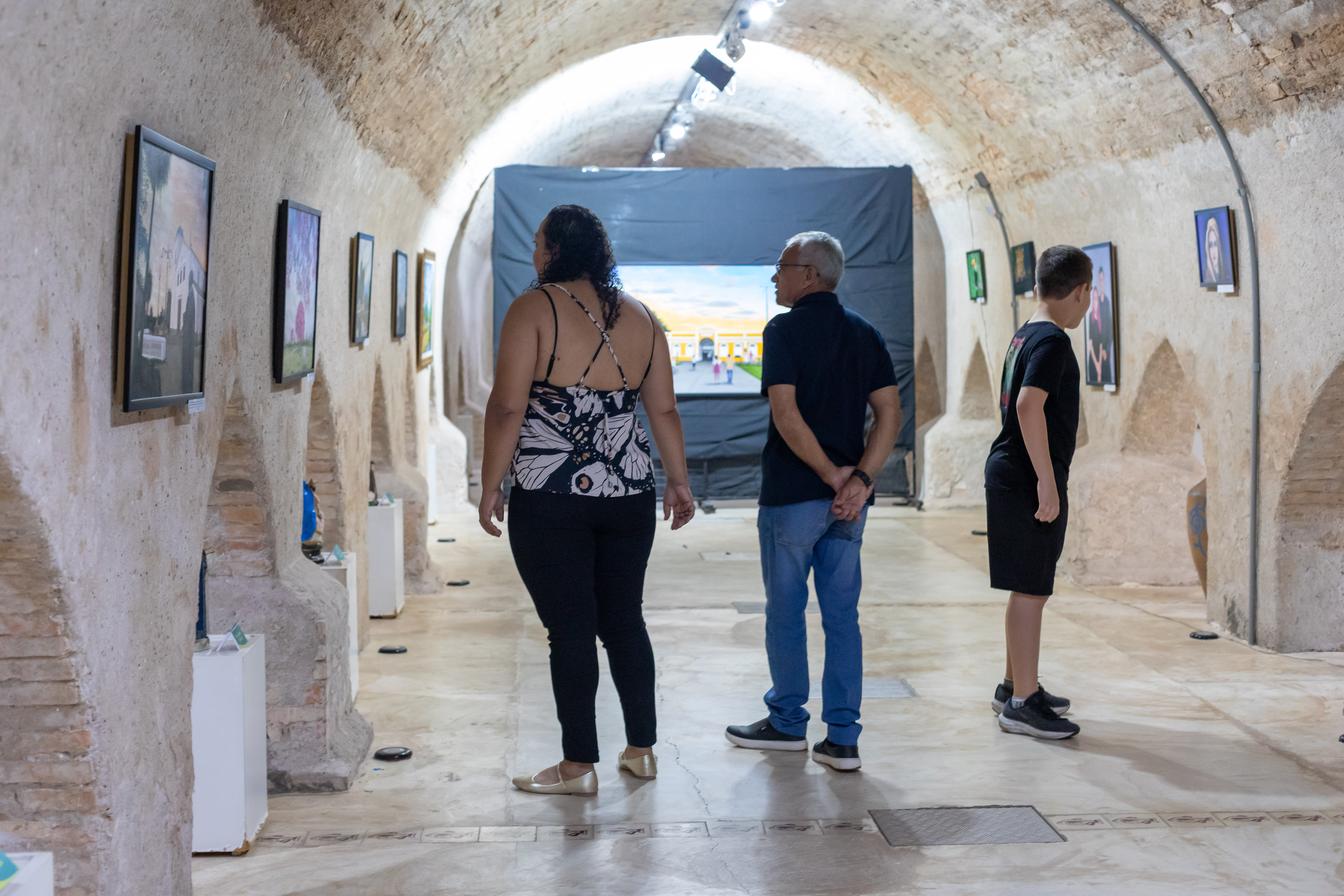 A imagem que ilustra a matéria mostra visitantes do Museu da Caixa D’Água, apreciando telas da mostra “A Magia do Pôr do Sol”.
