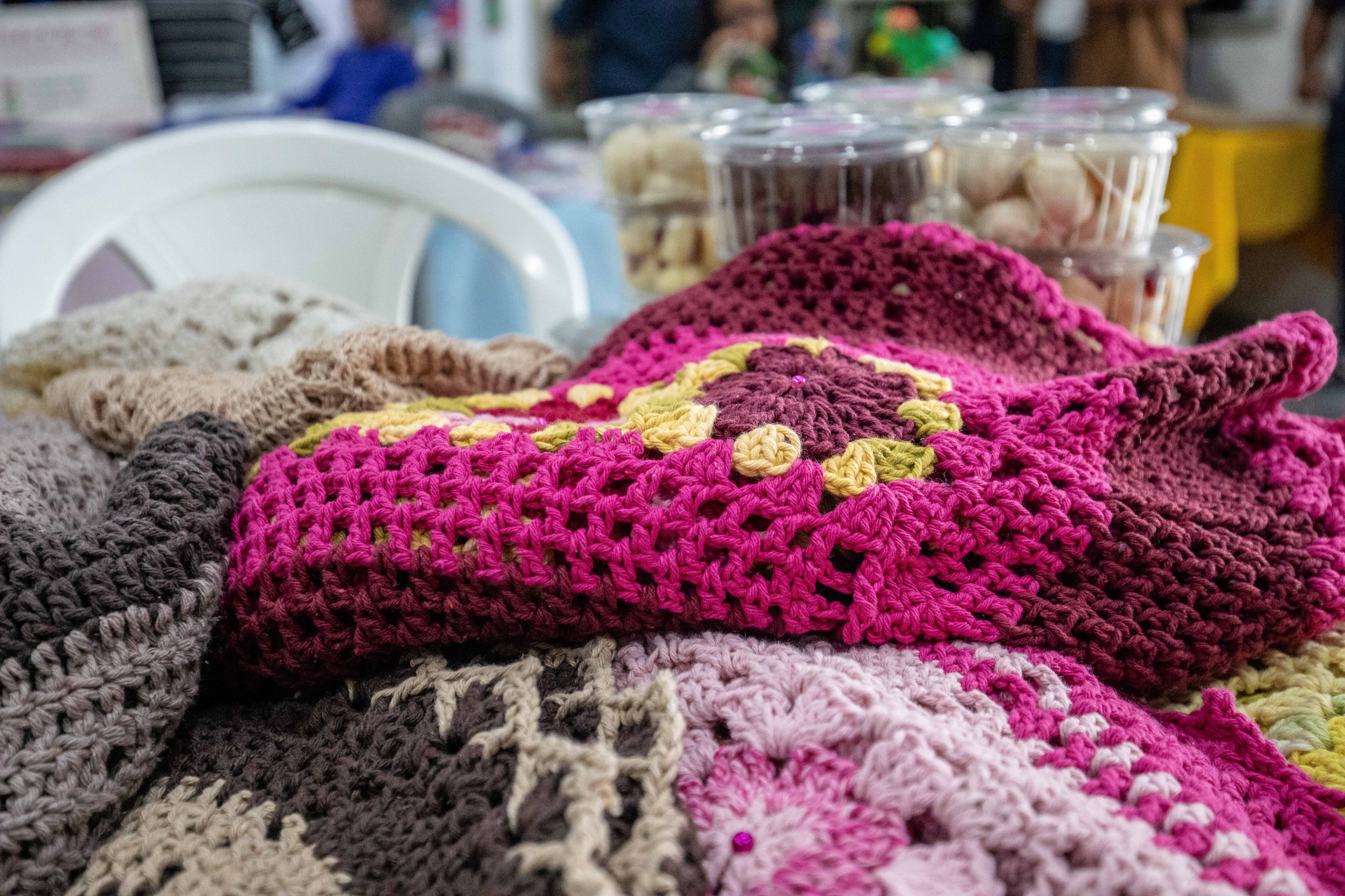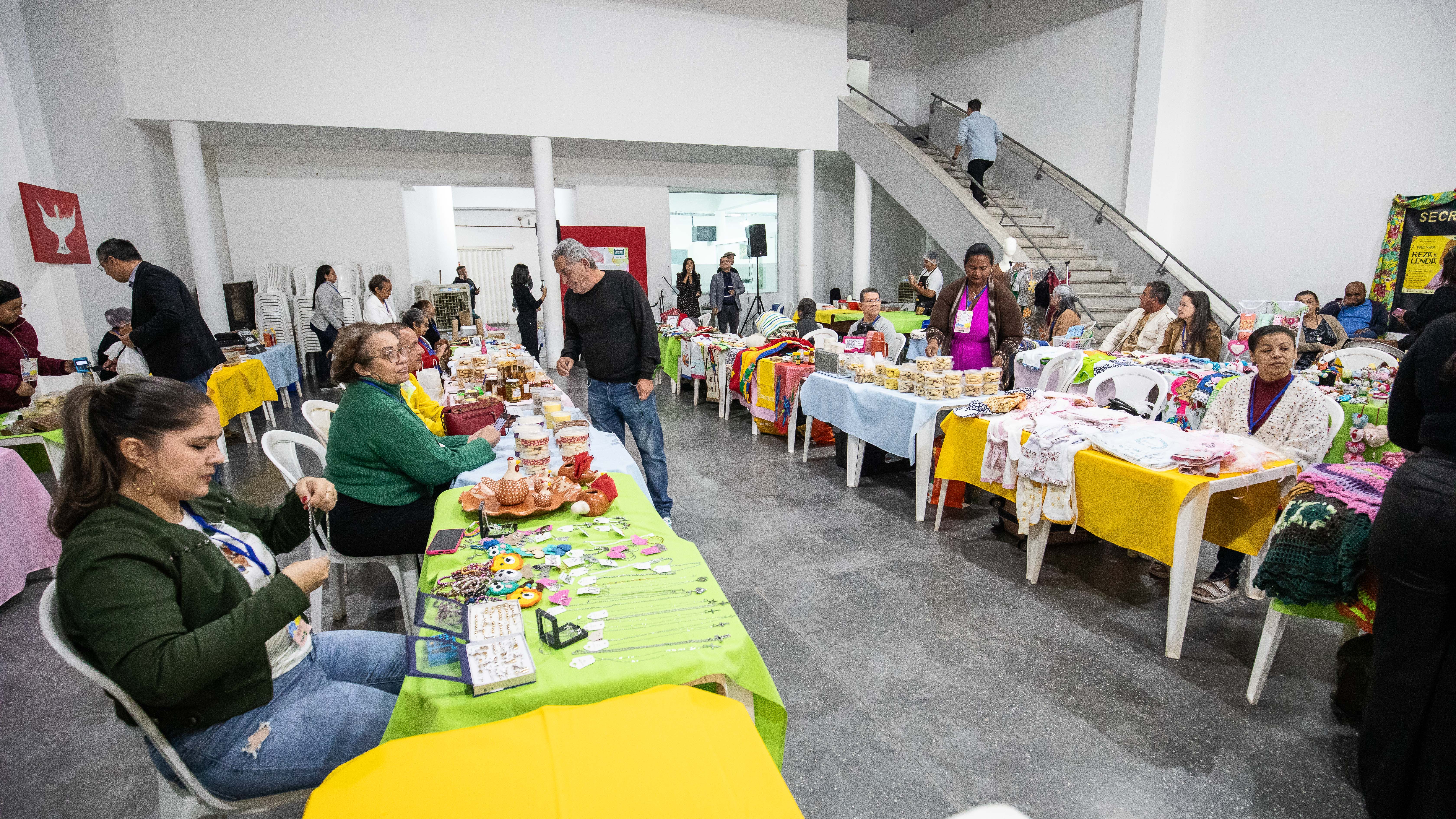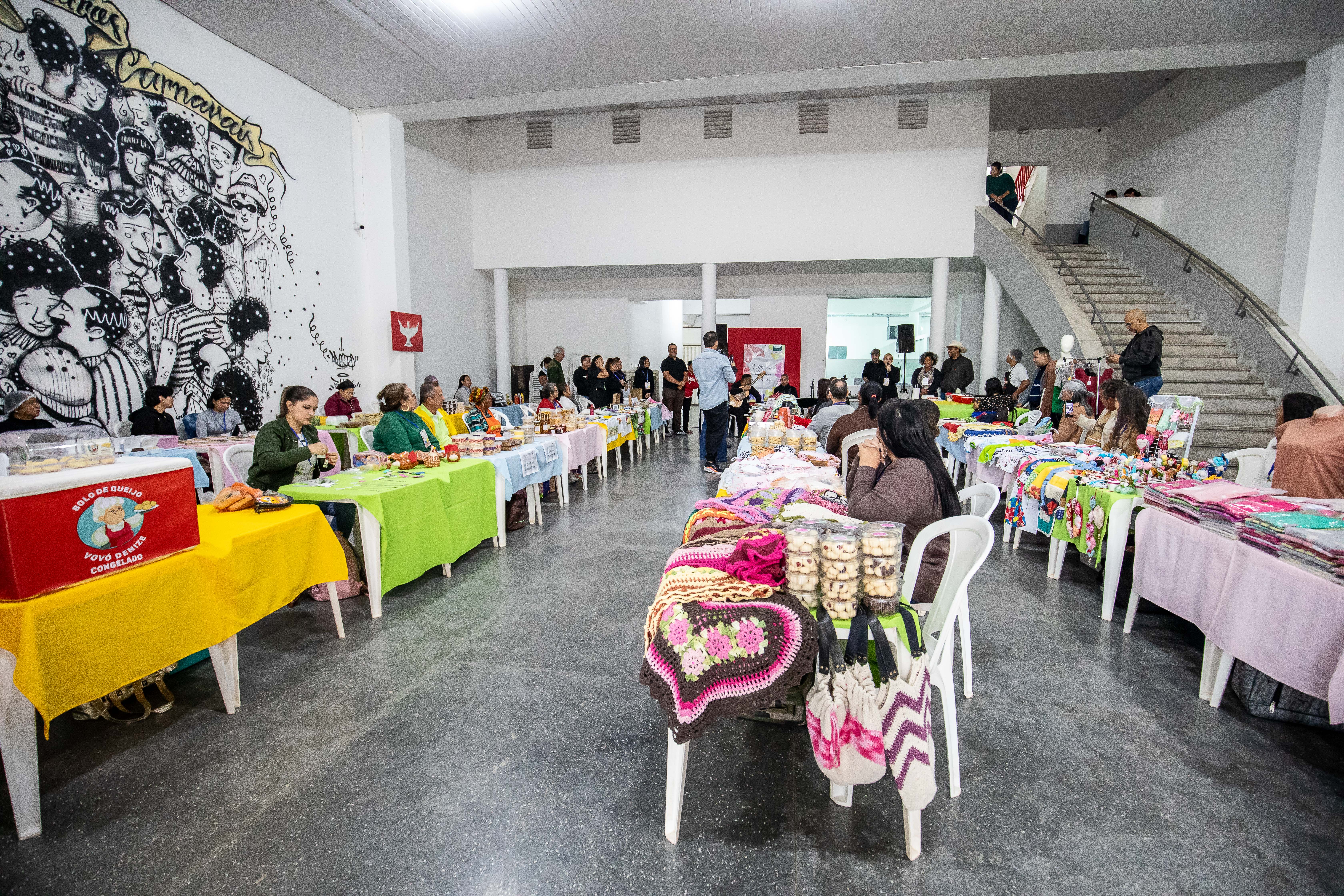 A imagem mostra o saguão da feira com diversas opções de artesanato, comidas típicas, doces, presentes criativos e atrações musicais ao vivo.