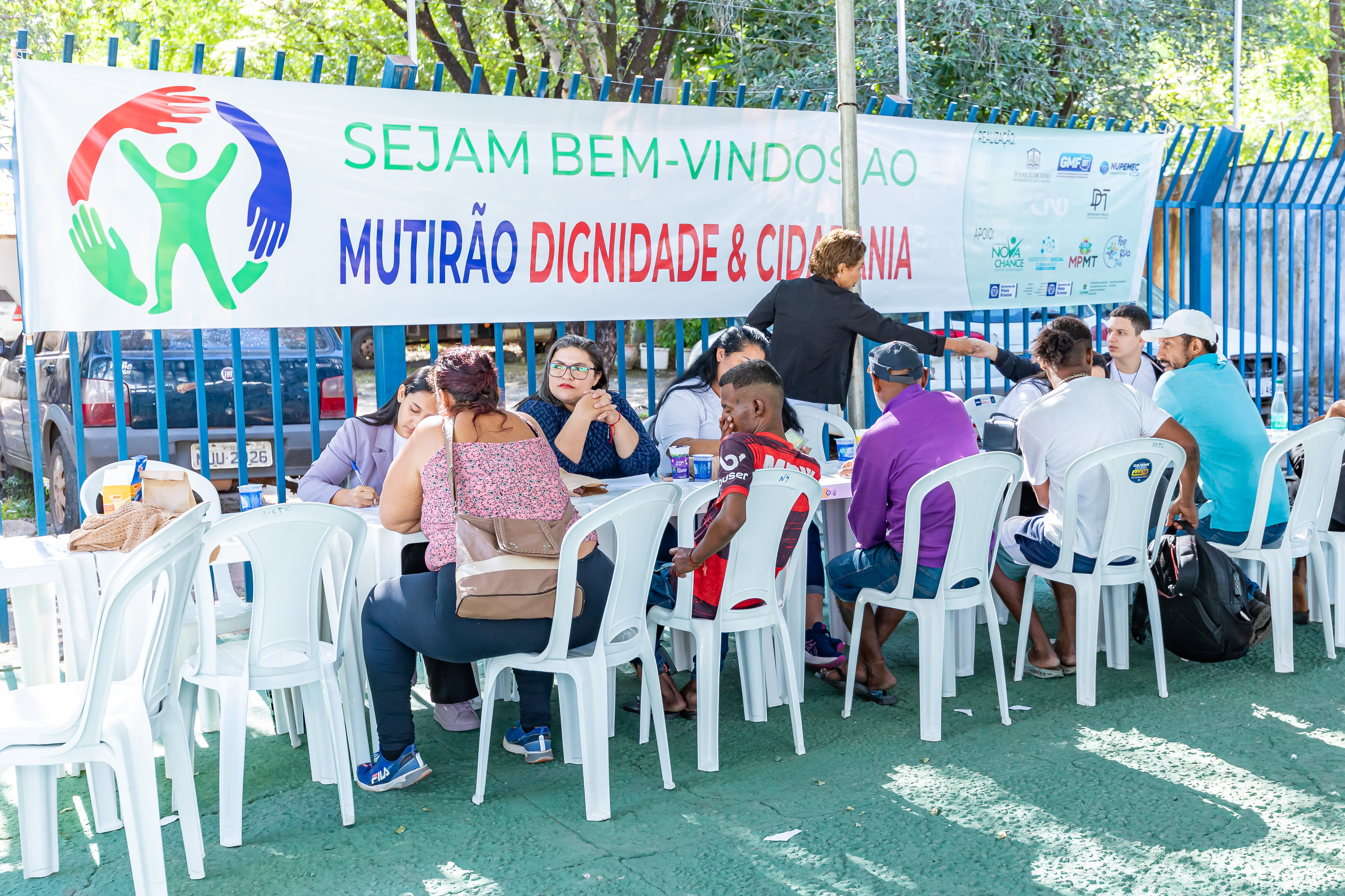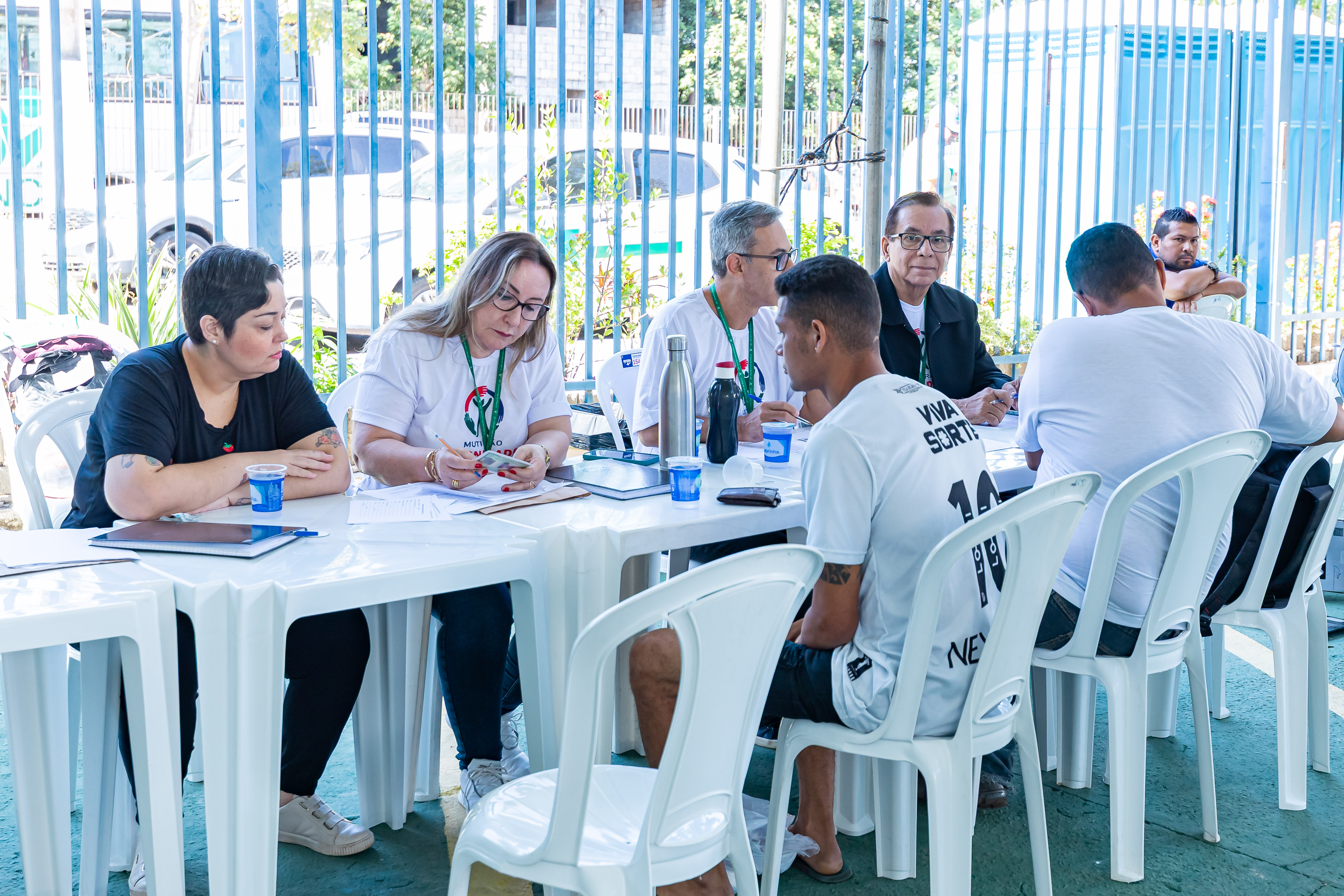 A imagem principal mostra um homem de costas sendo atendido por proficcionais durante o mutirão da cidadania no espaço da Associação Nova Chance. Entre os serviços levados estavam convecção de documentos, cadastro no CAD Único e outros benefícios.