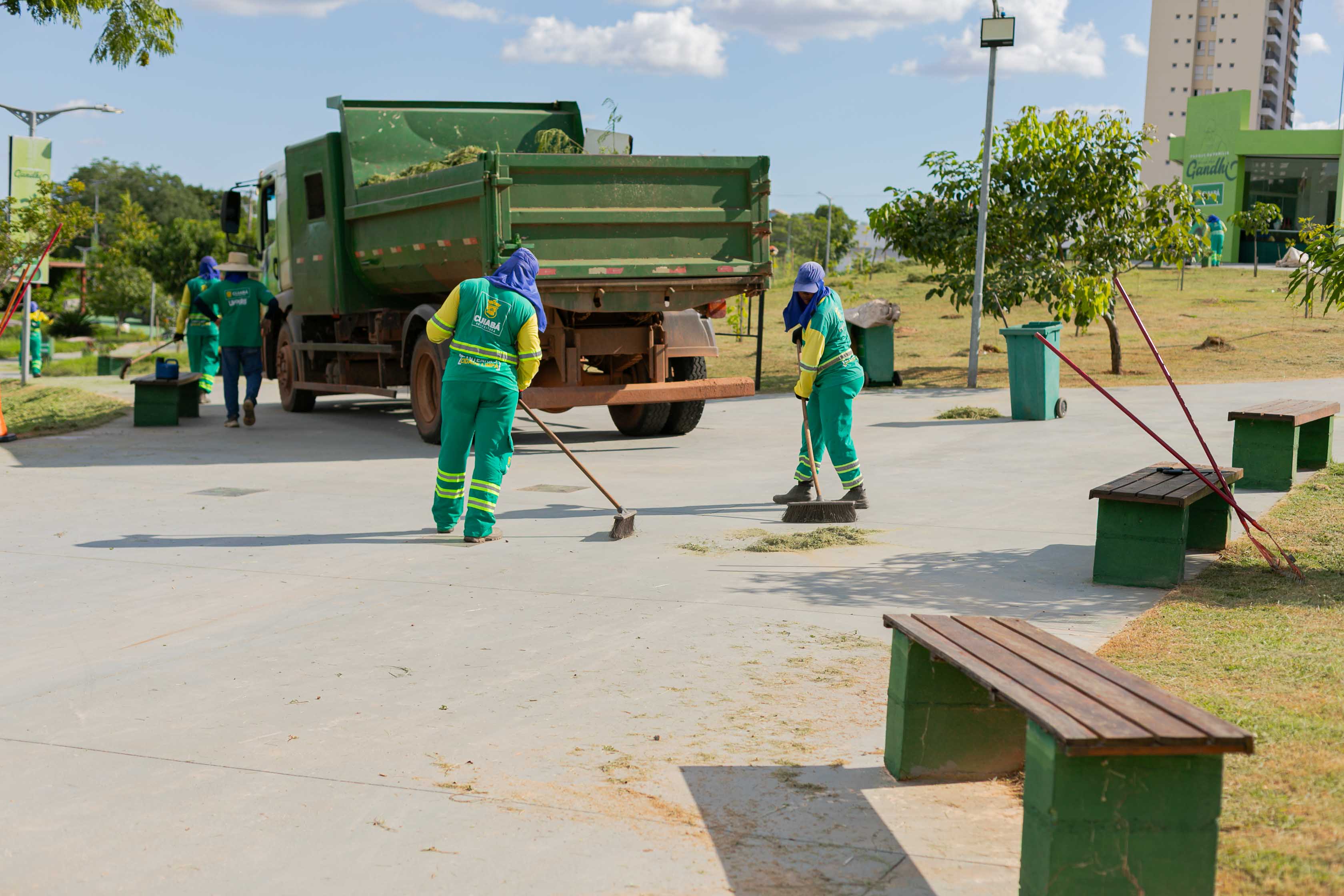 A imagem mostra colaboradores da Limpurb em força-tarefa de limpeza no Parque da Família. Os funcionários usam uniforme na cor verde, e está munido de Equipamento de Proteção Individual (EPIs).