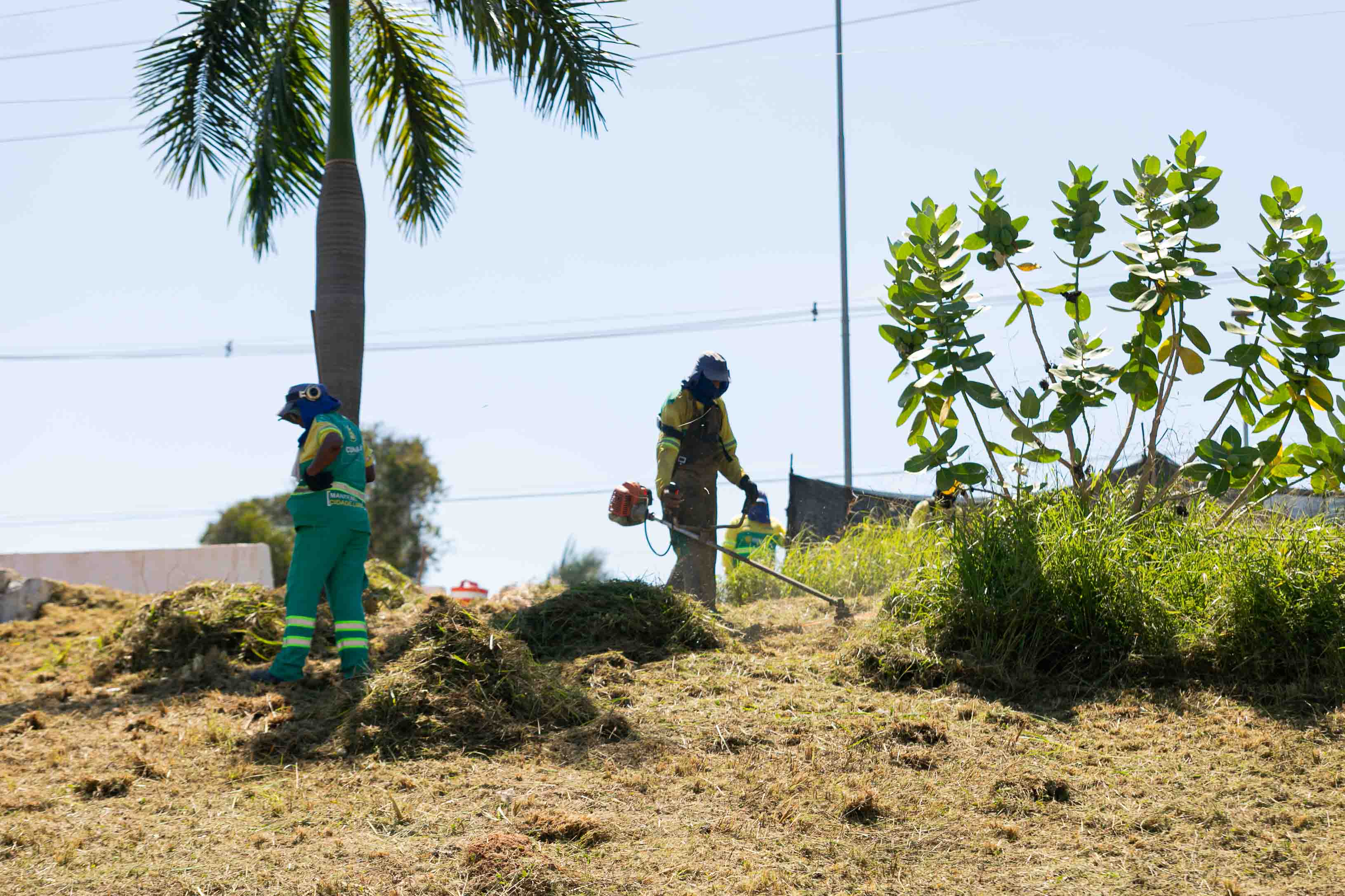A imagem mostra colaboradores da Limpurb em força-tarefa de limpeza na avenida Ciríaco Cândia. Os funcionários usam uniforme na cor verde, e está munido de Equipamento de Proteção Individual (EPIs).