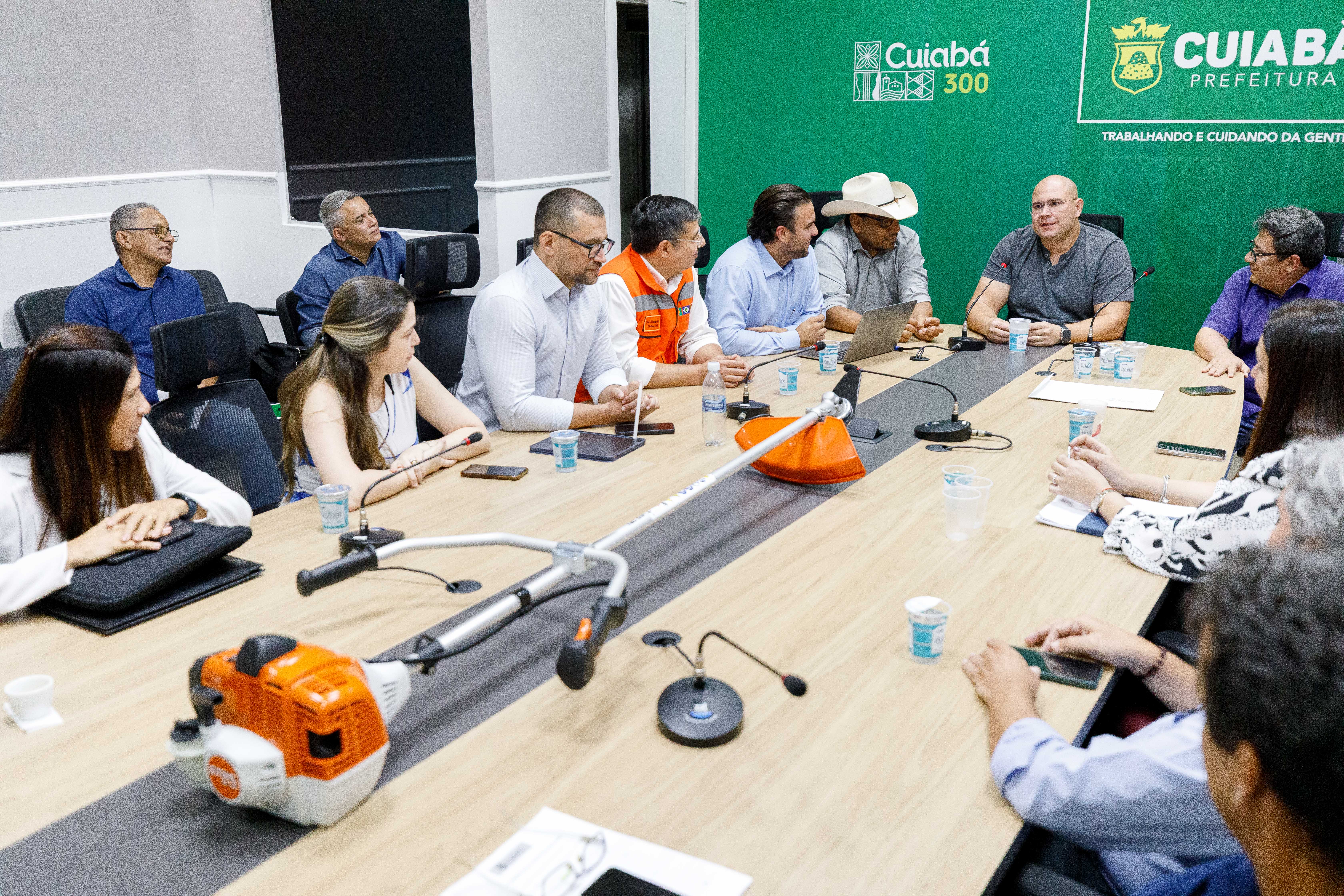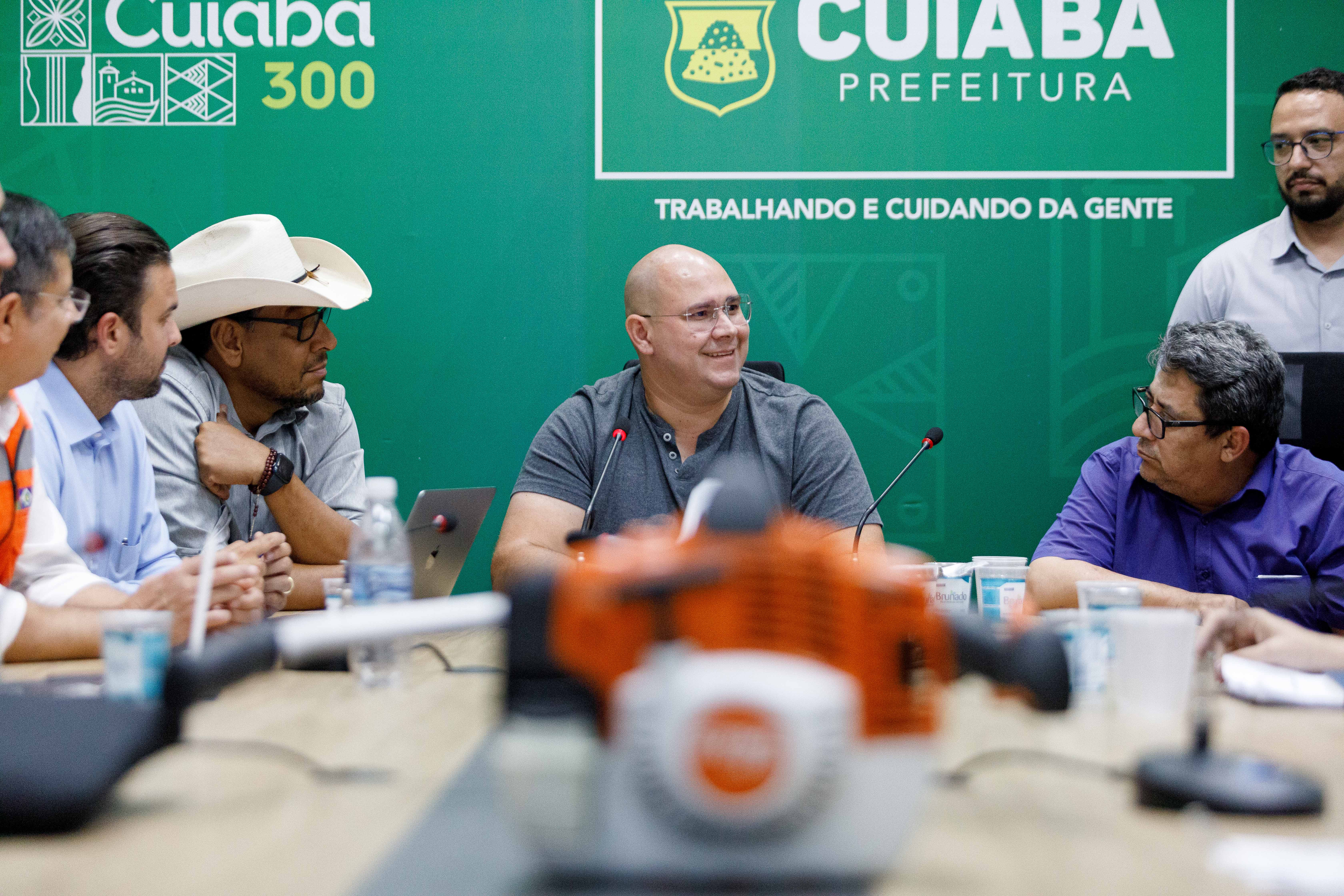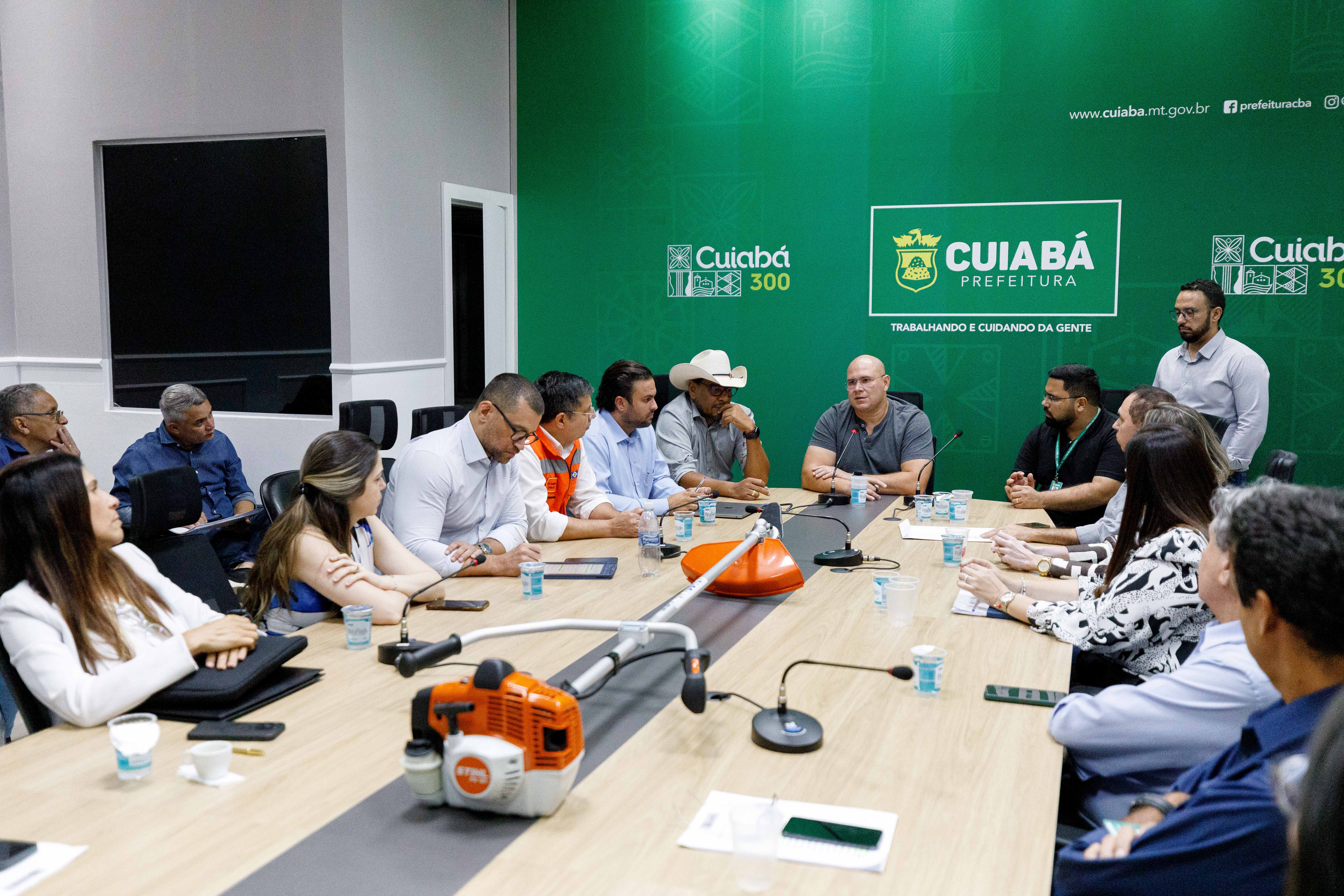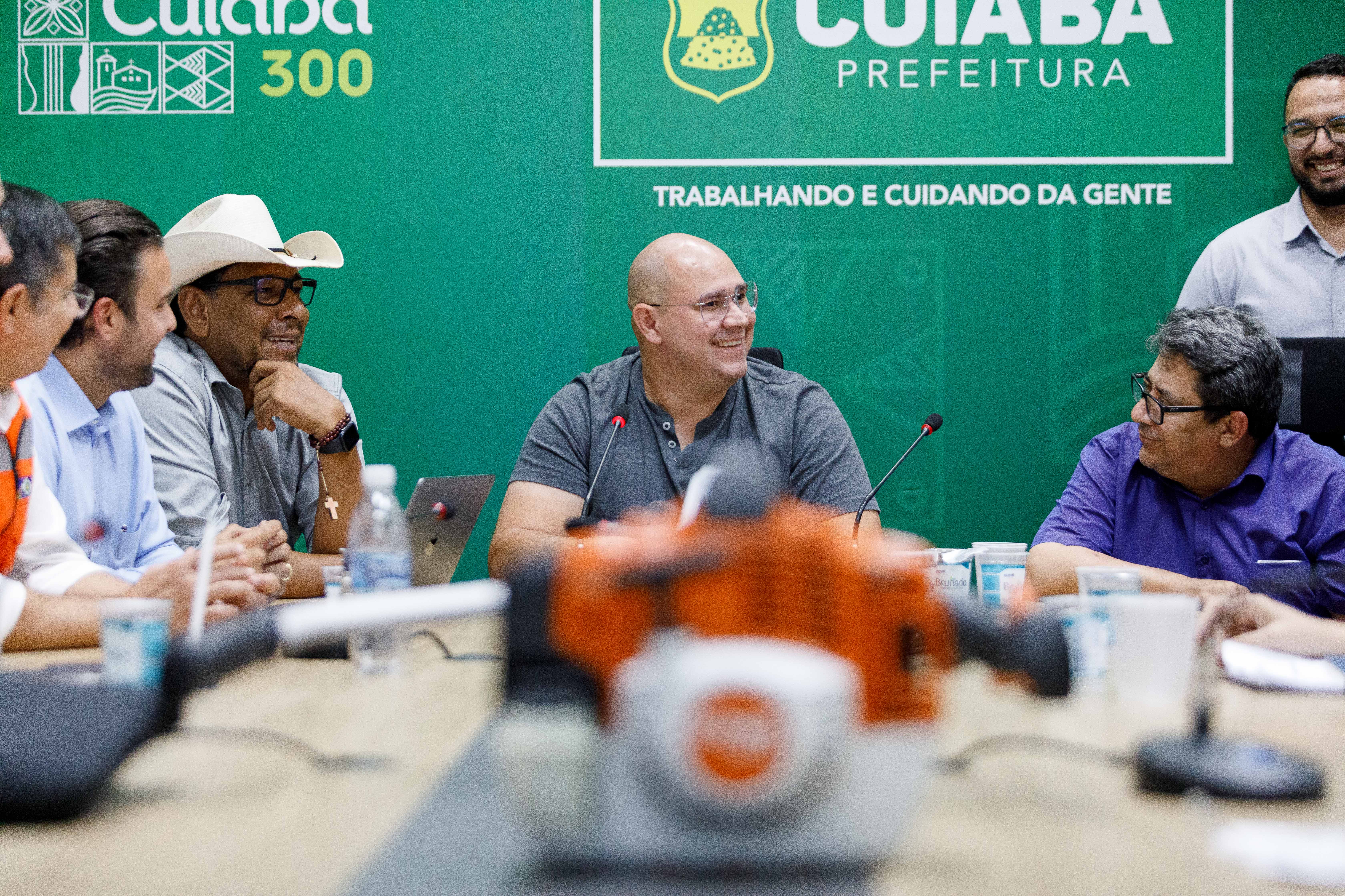 A imagem mostra o prefeito Abilio Brunini ao lado dos secretários que integram a comissão organizadora do mutirão de limpeza, que será realizado no dia 8 de abril em comemoração ao aniversário de Cuiabá.