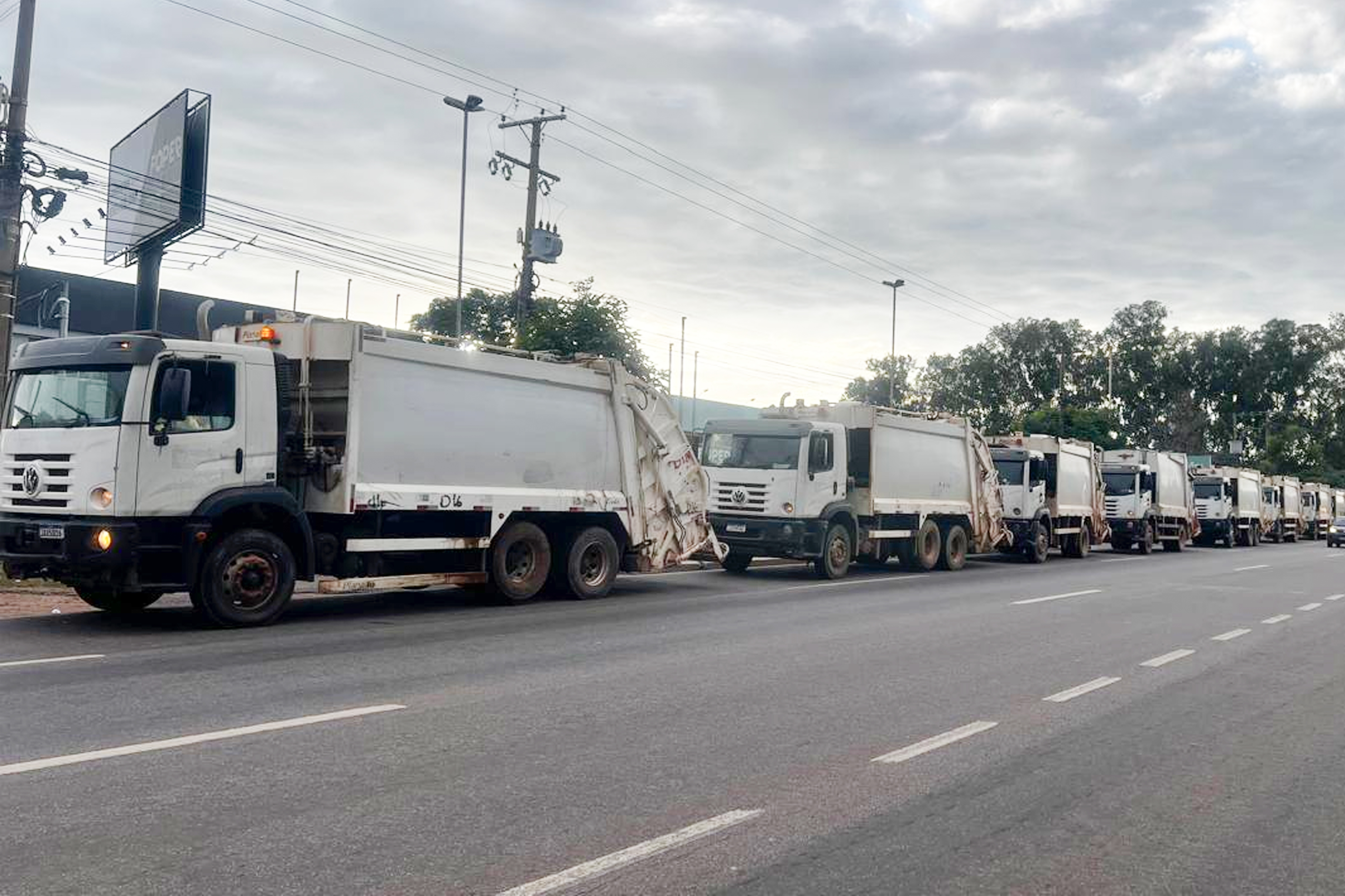 A imagem mostra os caminhões compactadores se deslocando para as rotas de coleta, logo nas primeiras horas da manhã, como parte do mutirão intensivo realizado neste domingo (25).
