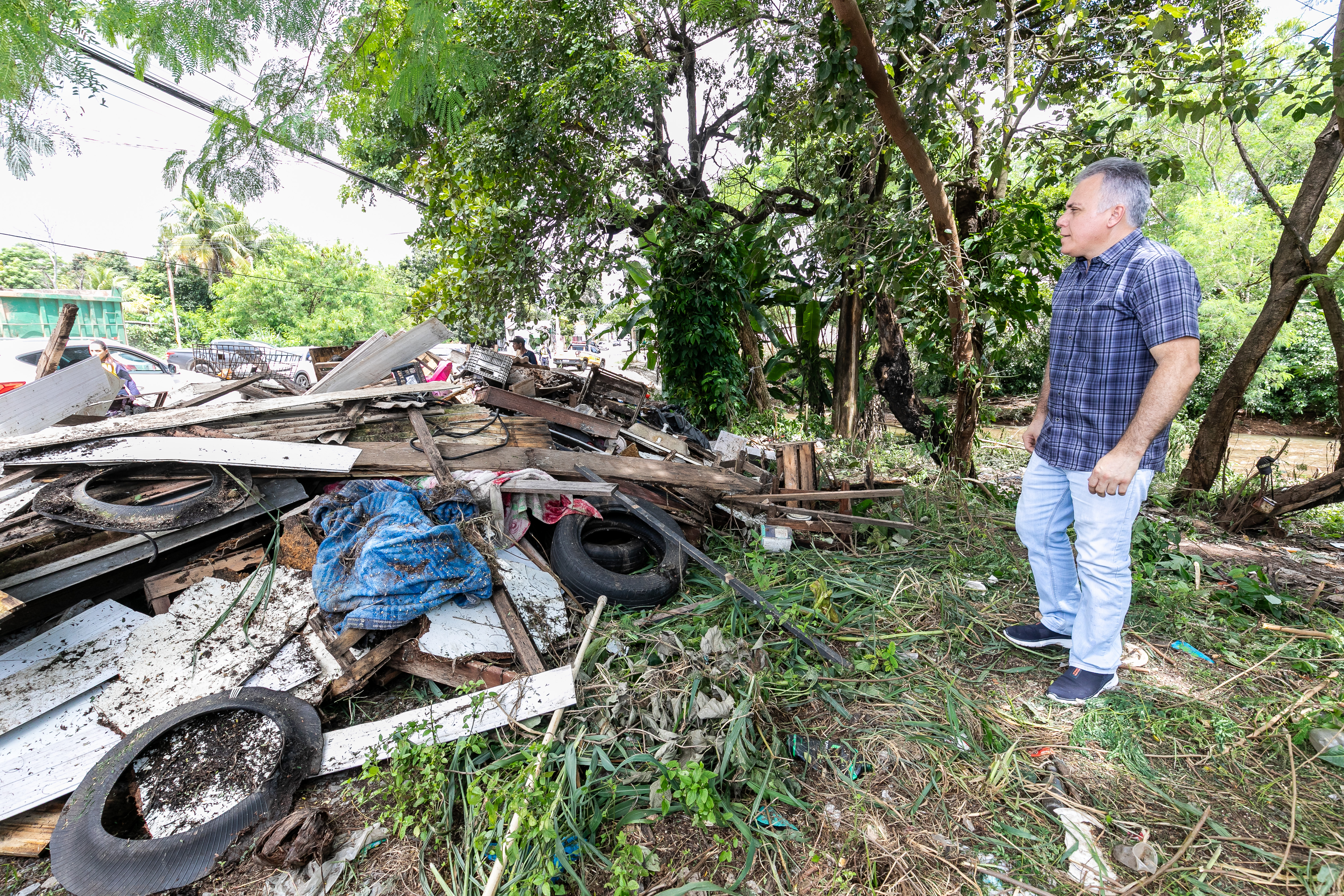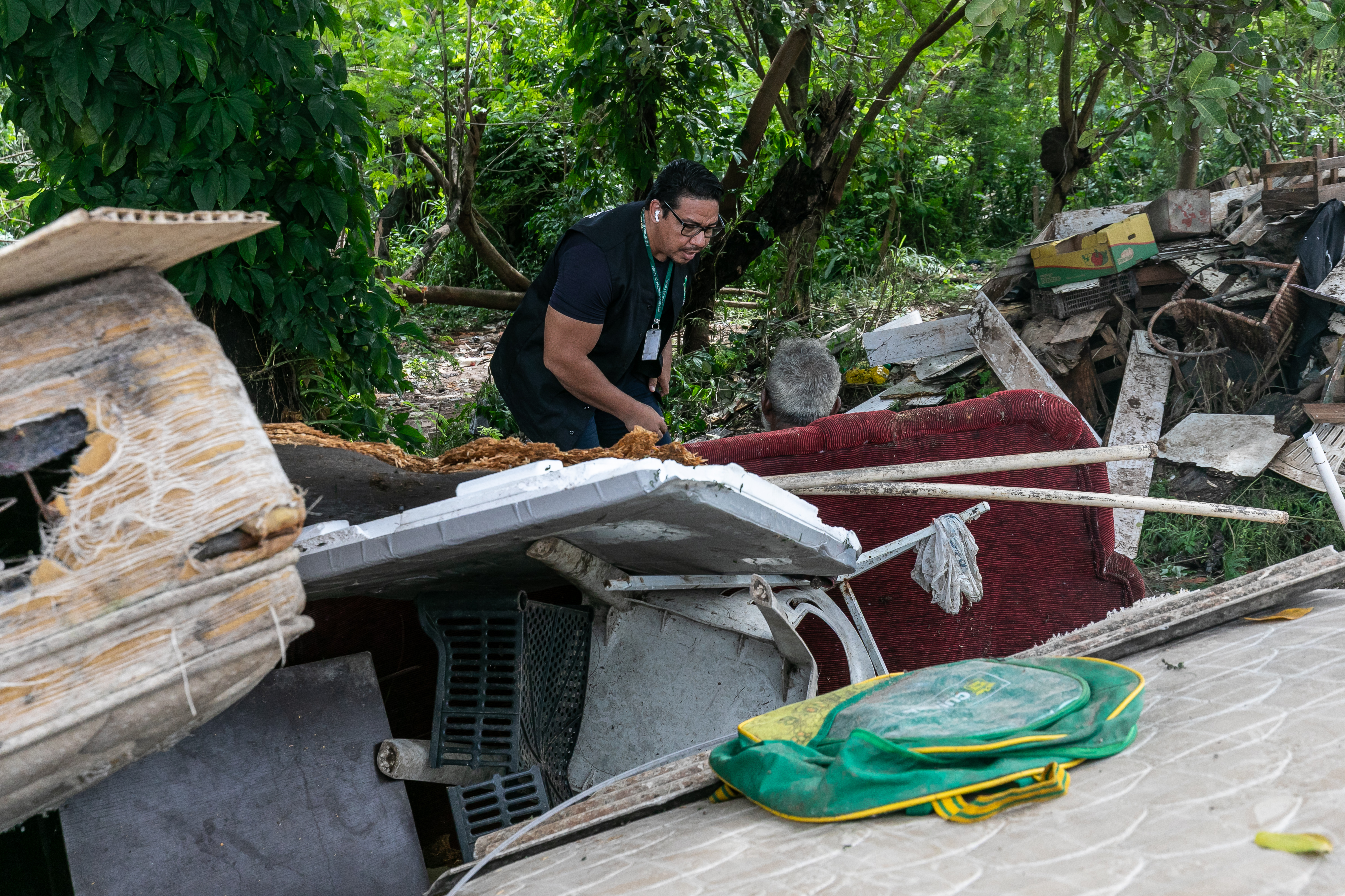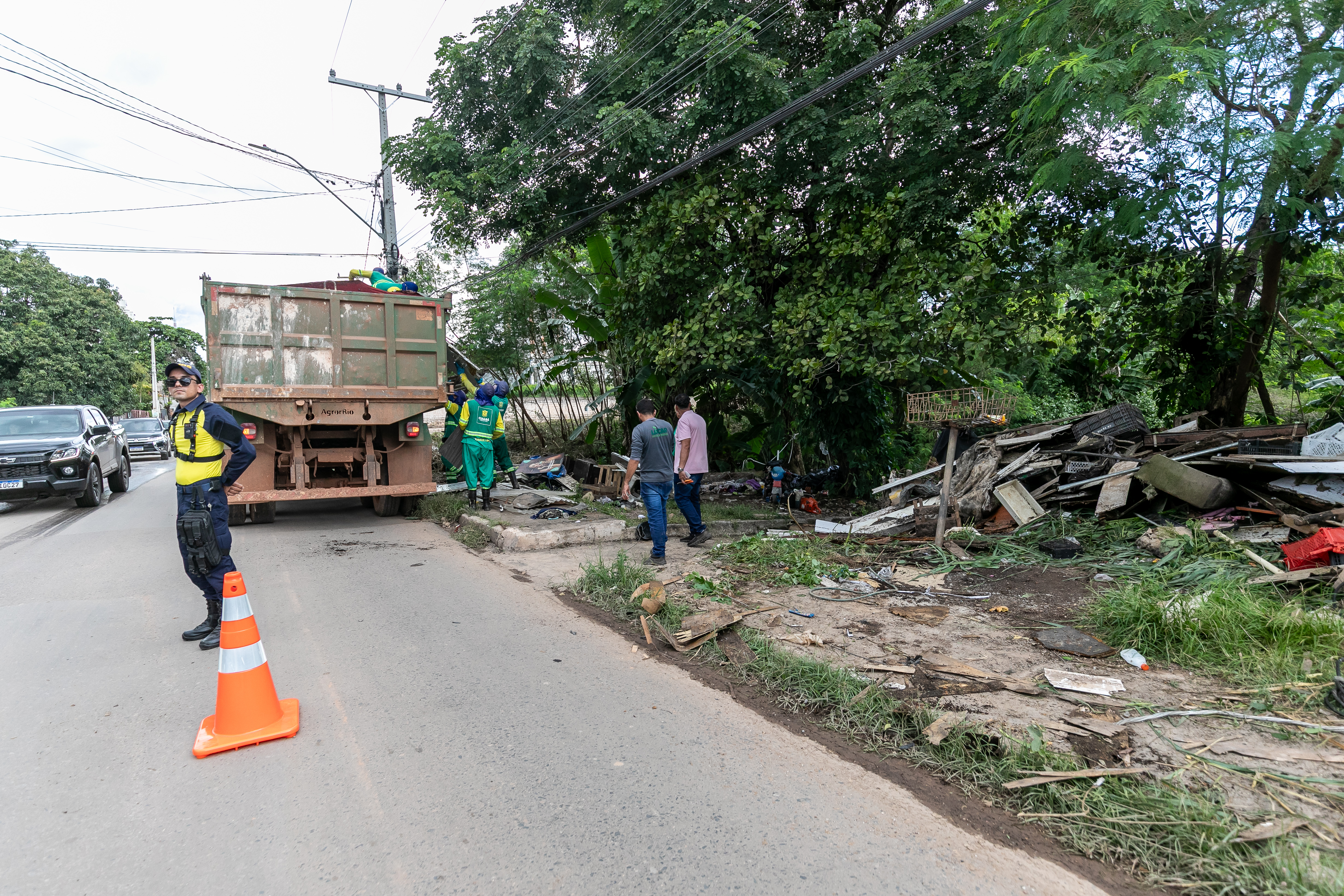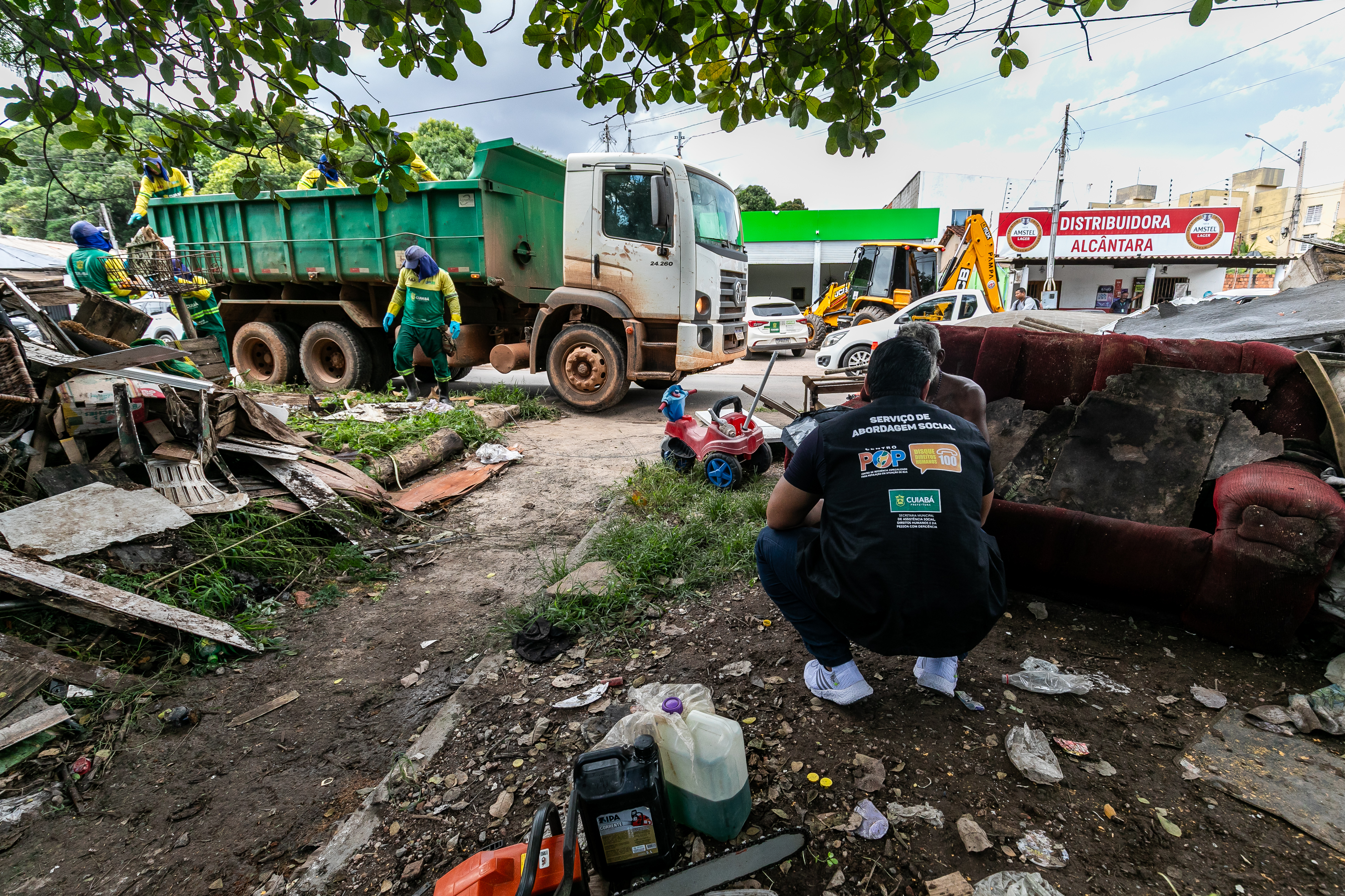 A imagem mostra um agente da Secretaria Municipal de Assistência Social durante uma abordagem no bairro Residencial Despraiado. Ao fundo, colaboradores da Limpurb realizam a remoção de um bolsão de descarte irregular localizado às margens de um córrego.