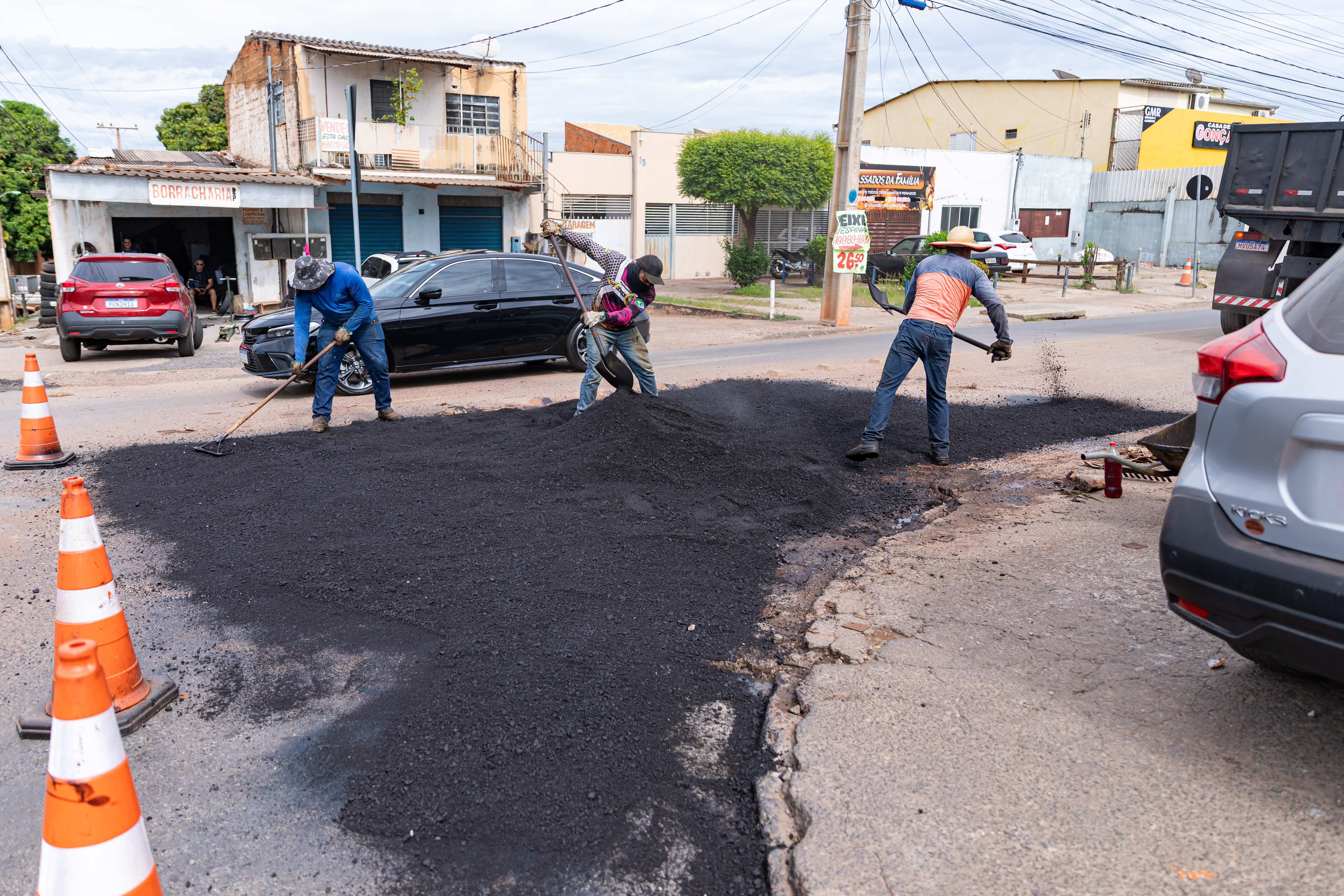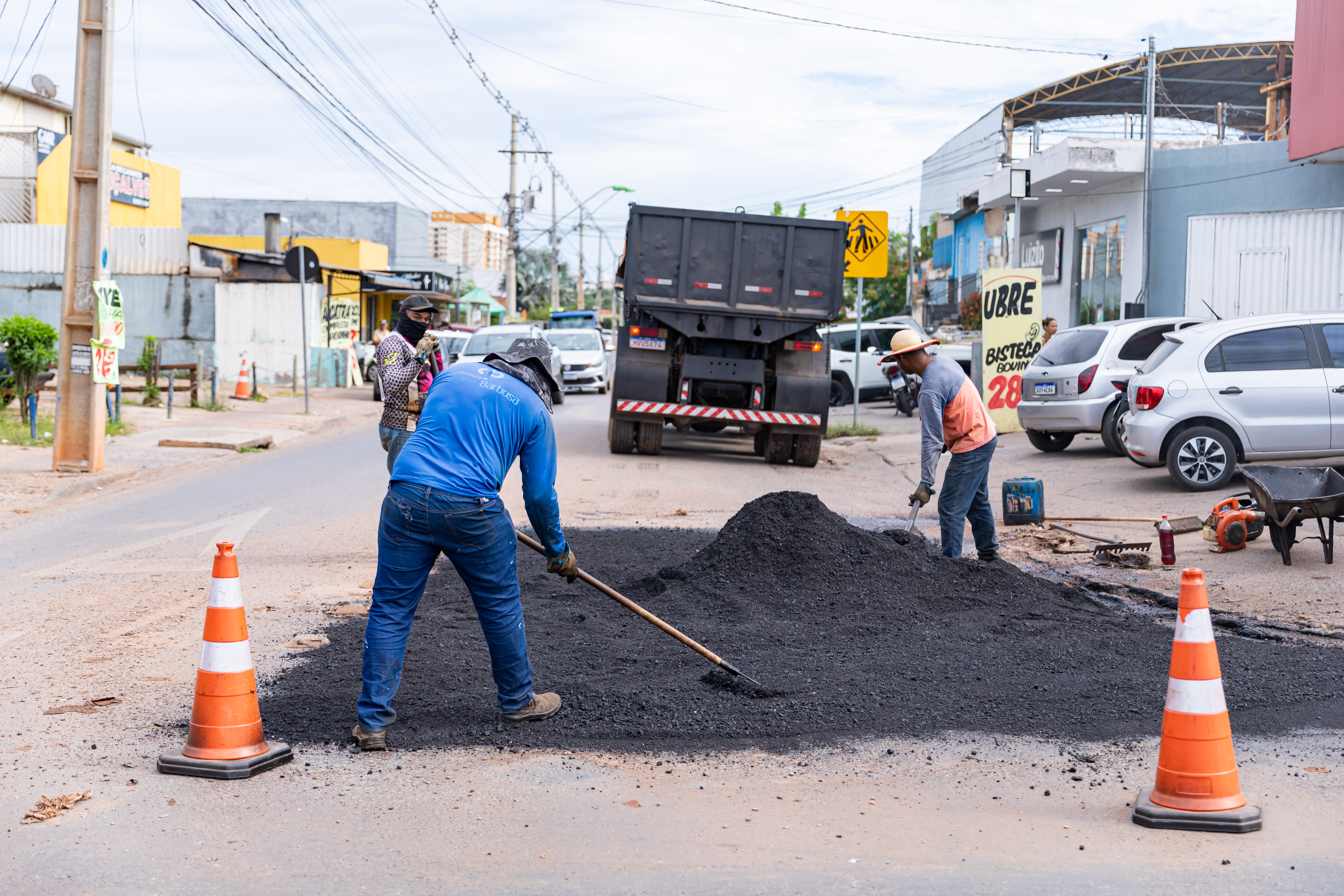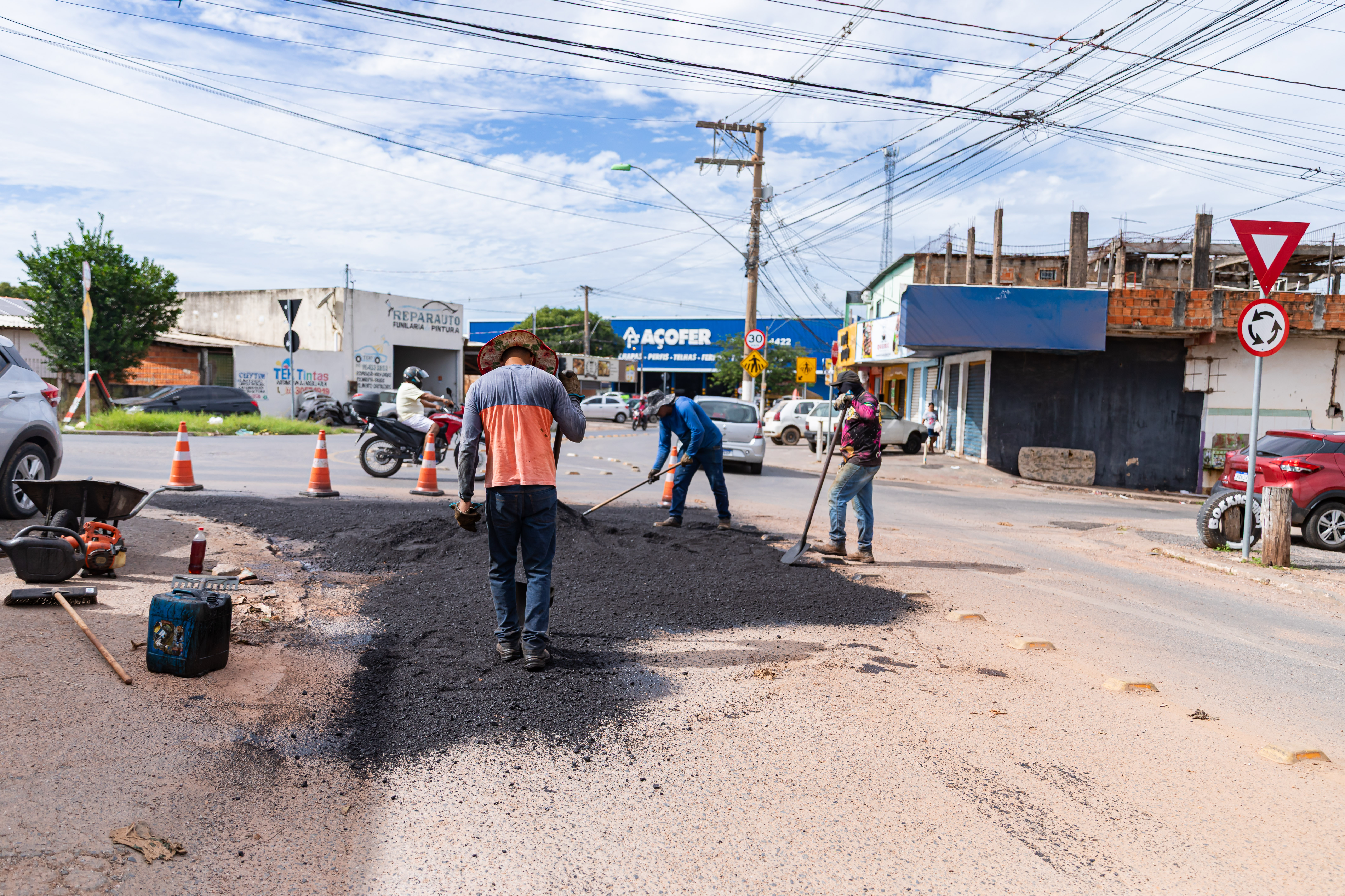 A imagem mostra as equipes de tapa-buraco atuando em uma das principais avenidas do bairro CPA III.