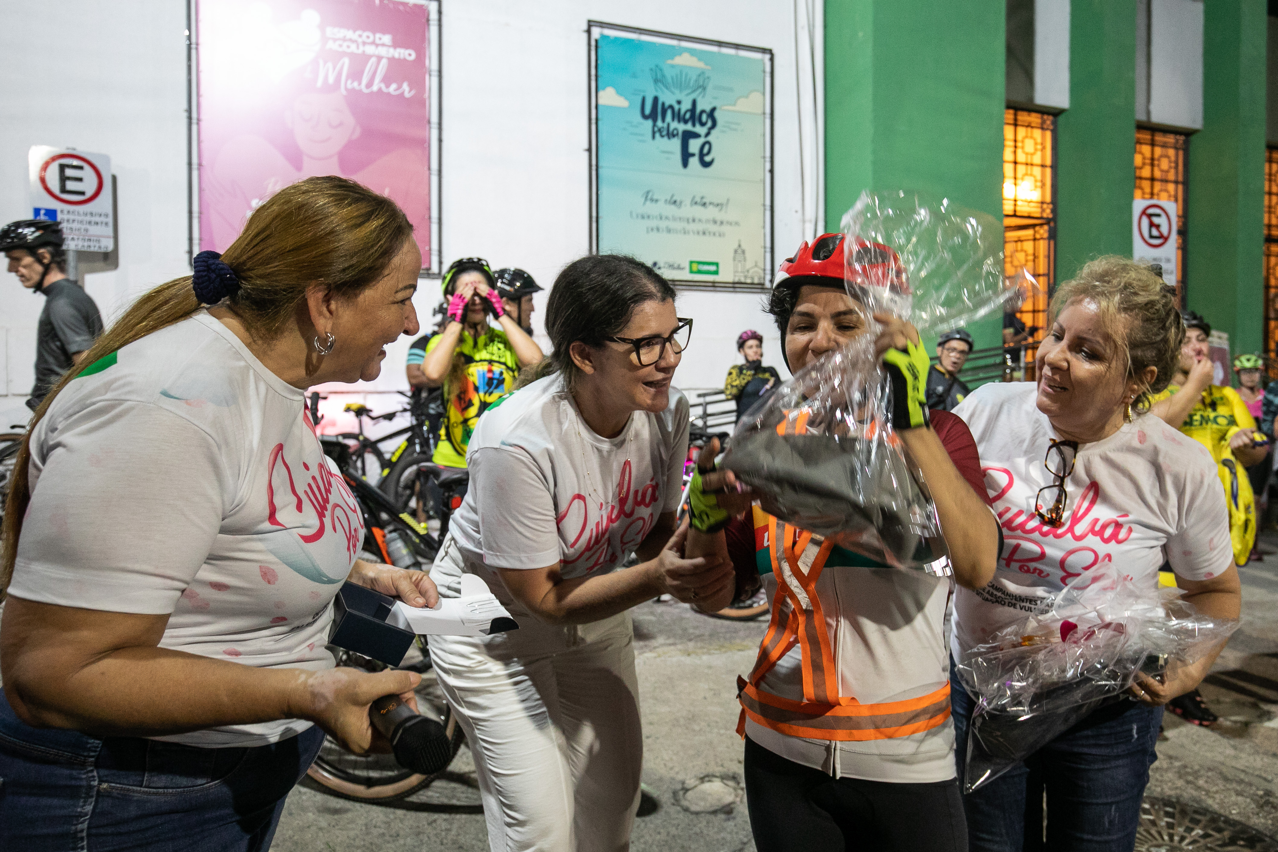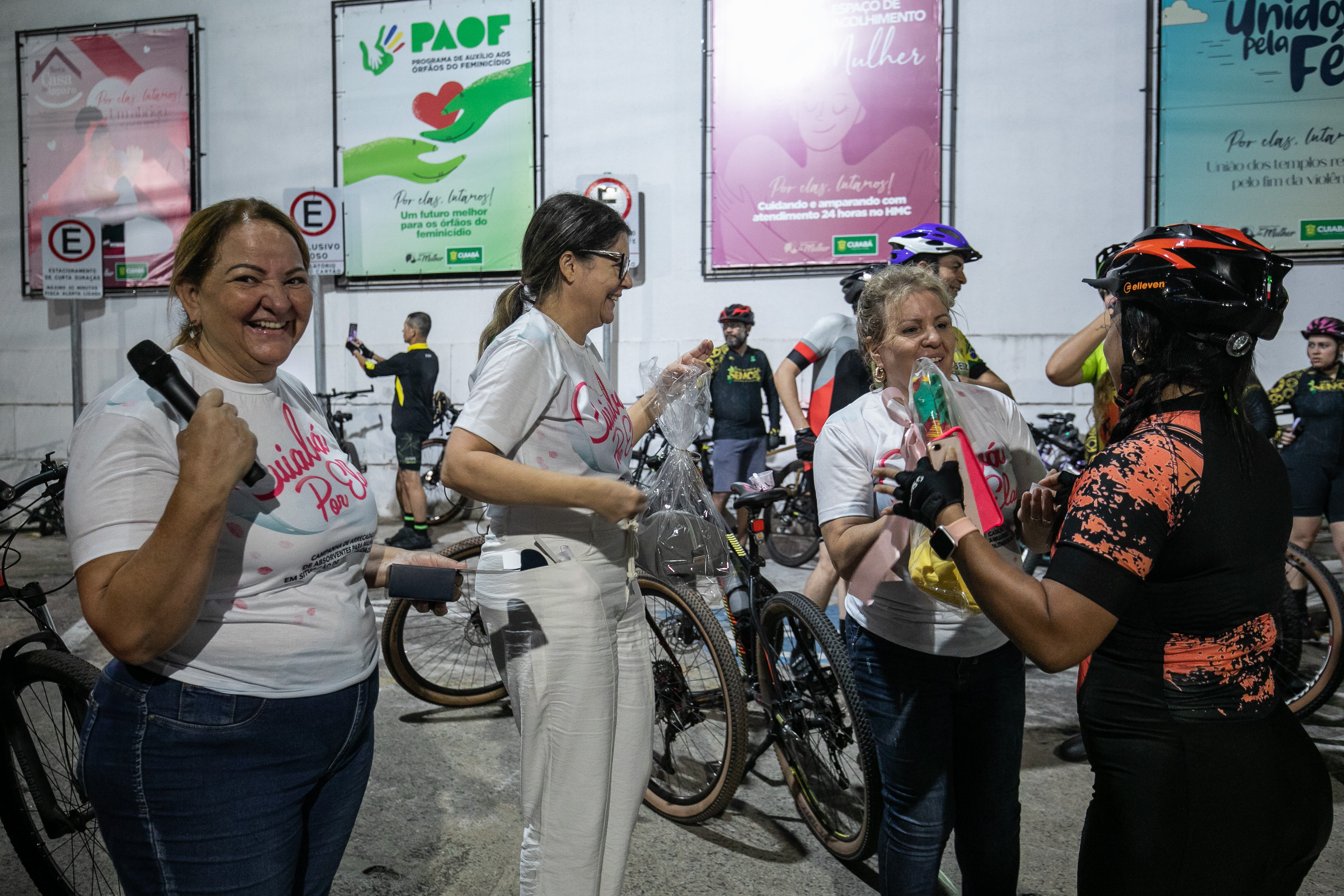 A assessora especial da Mulher, Silvana Veloso, agradeceu o empenho dos ciclistas do Pedal da Semob, coordenado por Raimundo Ribeiro, e também do Sindicato dos Agentes de Trânsito e Transporte da Capital (Sinattrac), cujo presidente é Ademir de Arruda. Ela informou que além da Semob, todas as secretarias municipais estão envolvidas, cada uma fazendo arrecadação dentro de sua instituição.