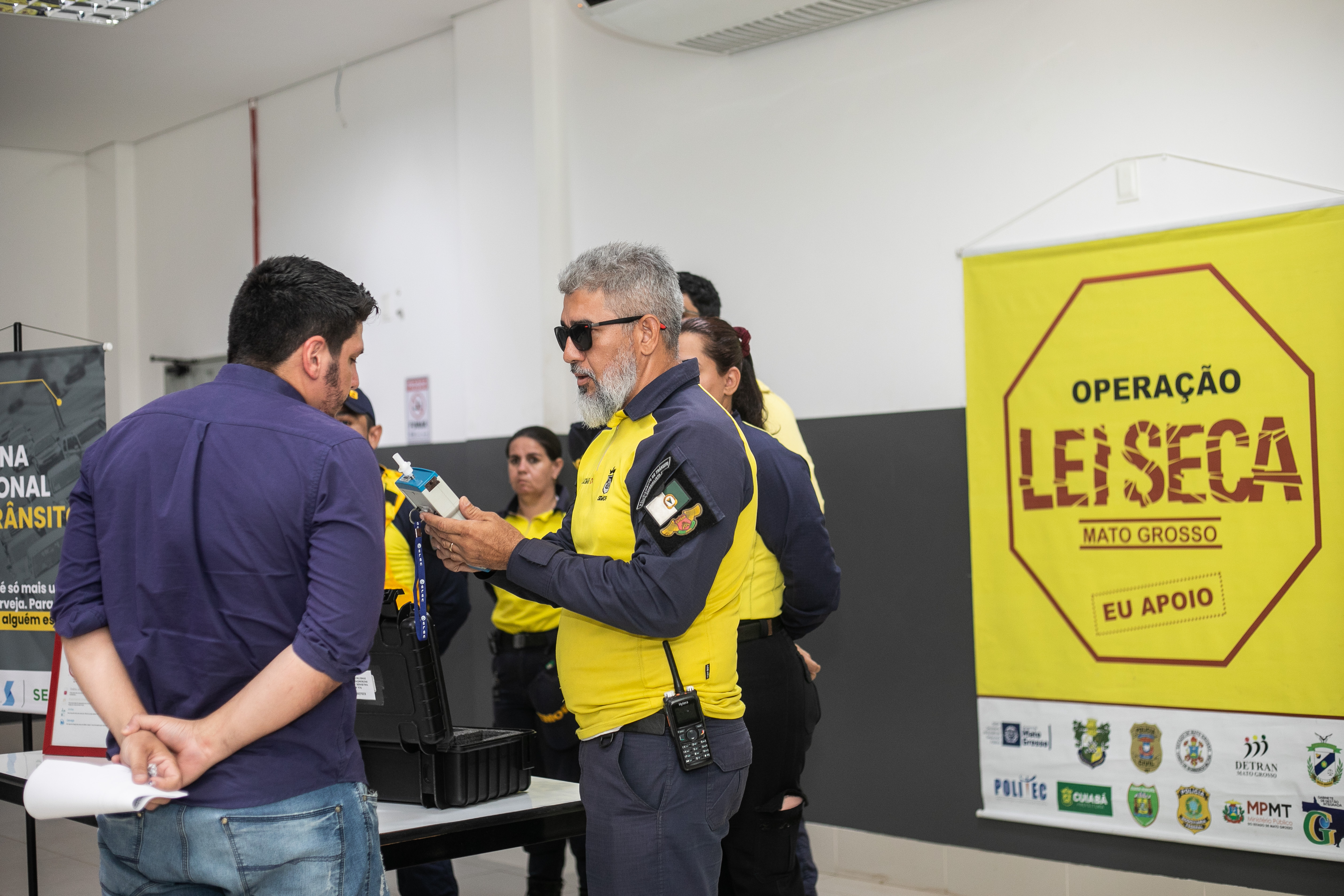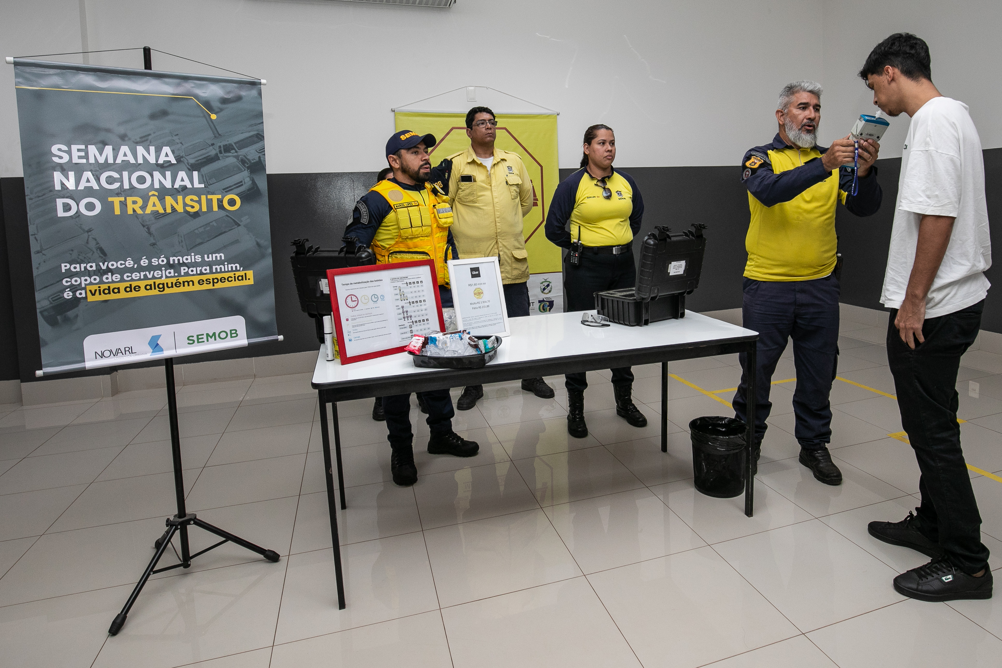 Na Semana Nacional do Trânsito, que ocorre entre os dias 18 a 25 de setembro, os agentes da Secretaria de Mobilidade Urbana (Semob) realizaram mais uma ação orientativa, dessa vez, sobre como é o funcionamento do etilômetro (o popular bafômetro). Também explicaram como é aplicada a Lei Seca, aos motoristas flagrados dirigindo sob efeito de álcool. A ação ocorreu no pátio de veículos removidos da empresa Rodando Legal, em Cuiabá.