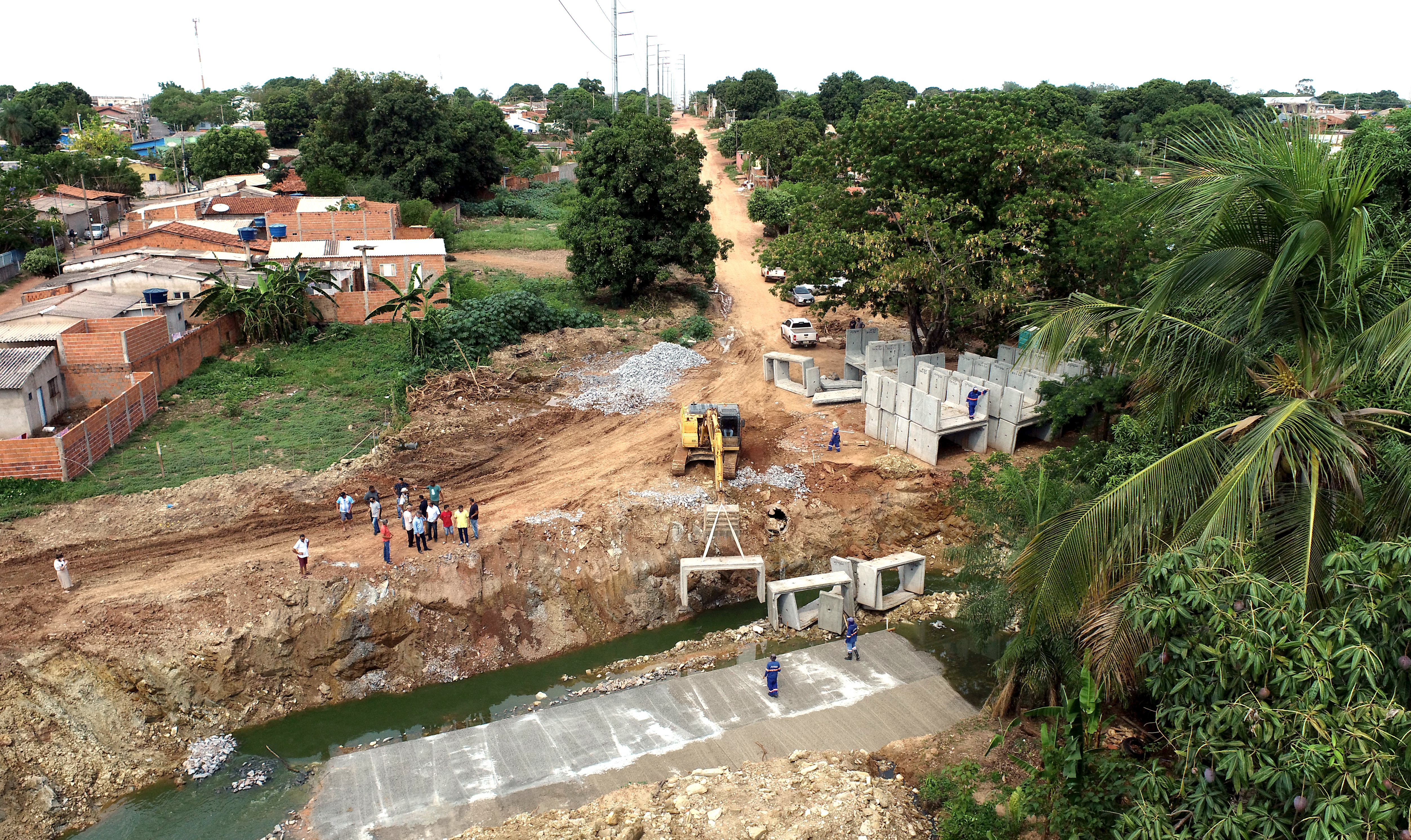 No local, que faz a ligação entre a Dante Martins de Oliveira (Planalto) e a Rua P (Novo Horizonte), os trabalhadores já efetuaram a concretagem da base de apoio para a instalação do conjunto de aduelas que formará o bueiro celular sobre o córrego. A edificação da travessia teve início neste mês e a previsão de que até o fim deste ano seja concluído, conforme cronograma da Secretaria Municipal de Obras Públicas.