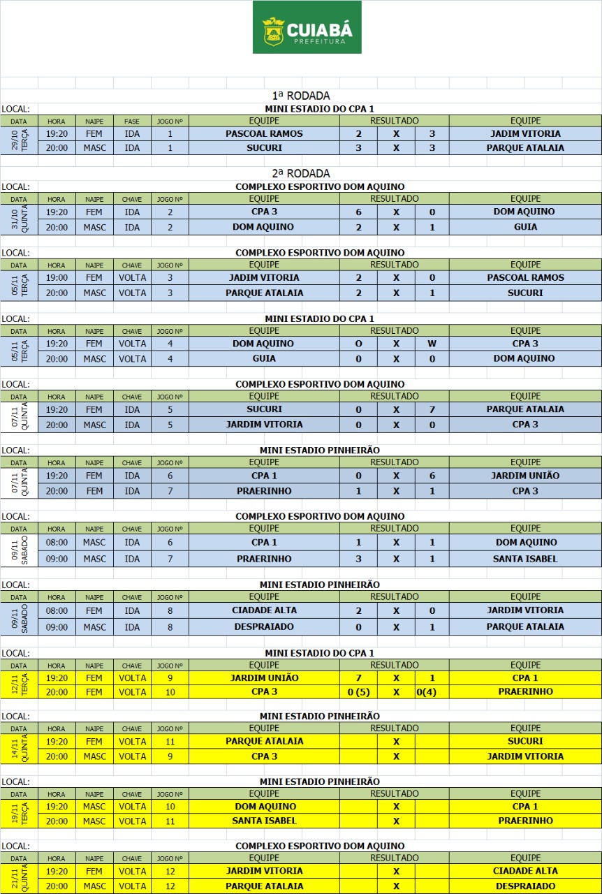 A rodada continua com jogos na próxima terça-feira (19) e quinta-feira (21), quando mais oito equipes entram em campo. No masculino, o Dom Aquino enfrenta o CPA I e o Santa Isabel joga contra o Praerinho, na terça (19), no Pinheirão. Enquanto que na quinta (21), as meninas do Jardim Vitória jogam contra as do Cidade Alta e os meninos do Parque Atalaia enfrentam os do Despraiado, no Complexo Esportivo Dom Aquino.
