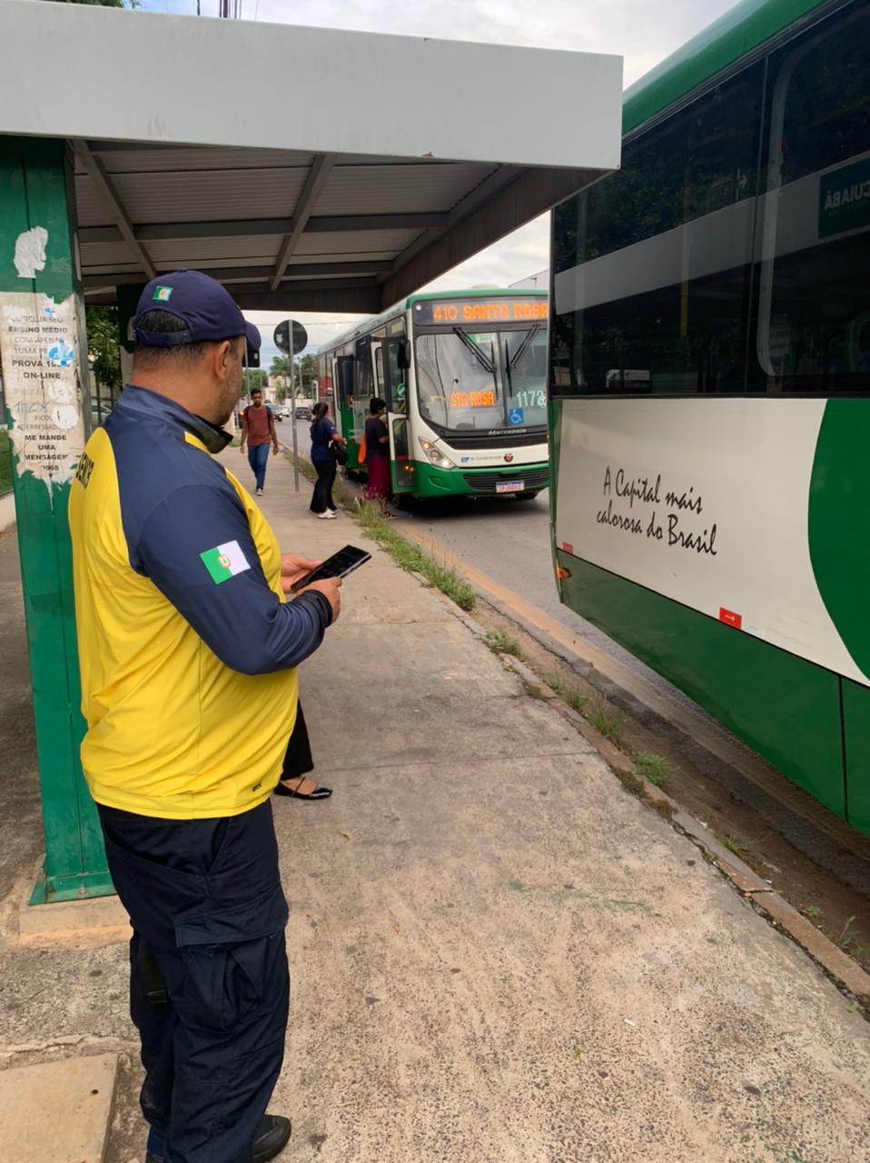A imagem mostra um agente de fiscalização observando ônibus de transporte público em operação, enquanto utiliza um dispositivo móvel para registrar informações. Ao fundo, passageiros entram em um dos ônibus, e o veículo possui a identificação de sua linha.