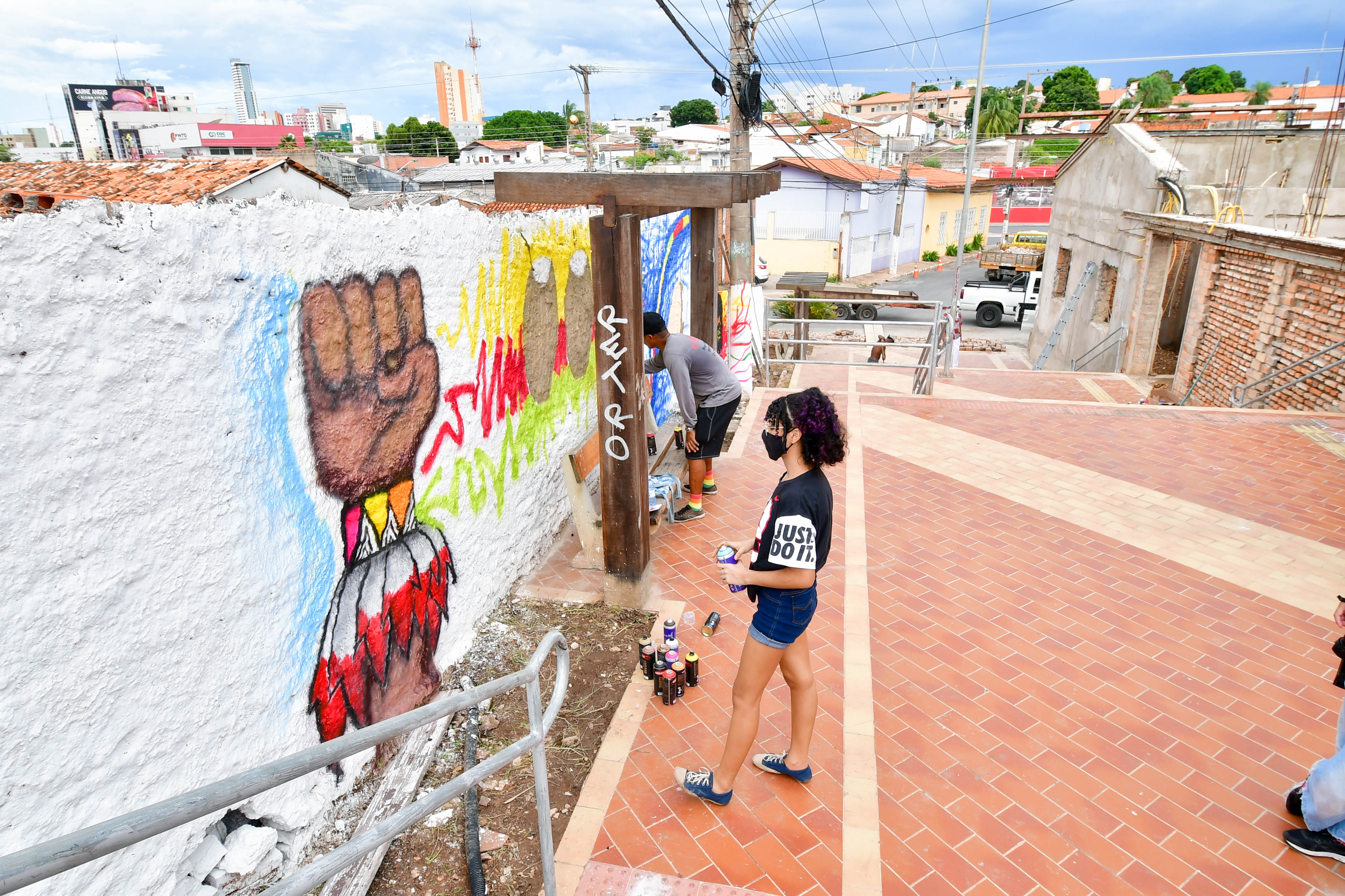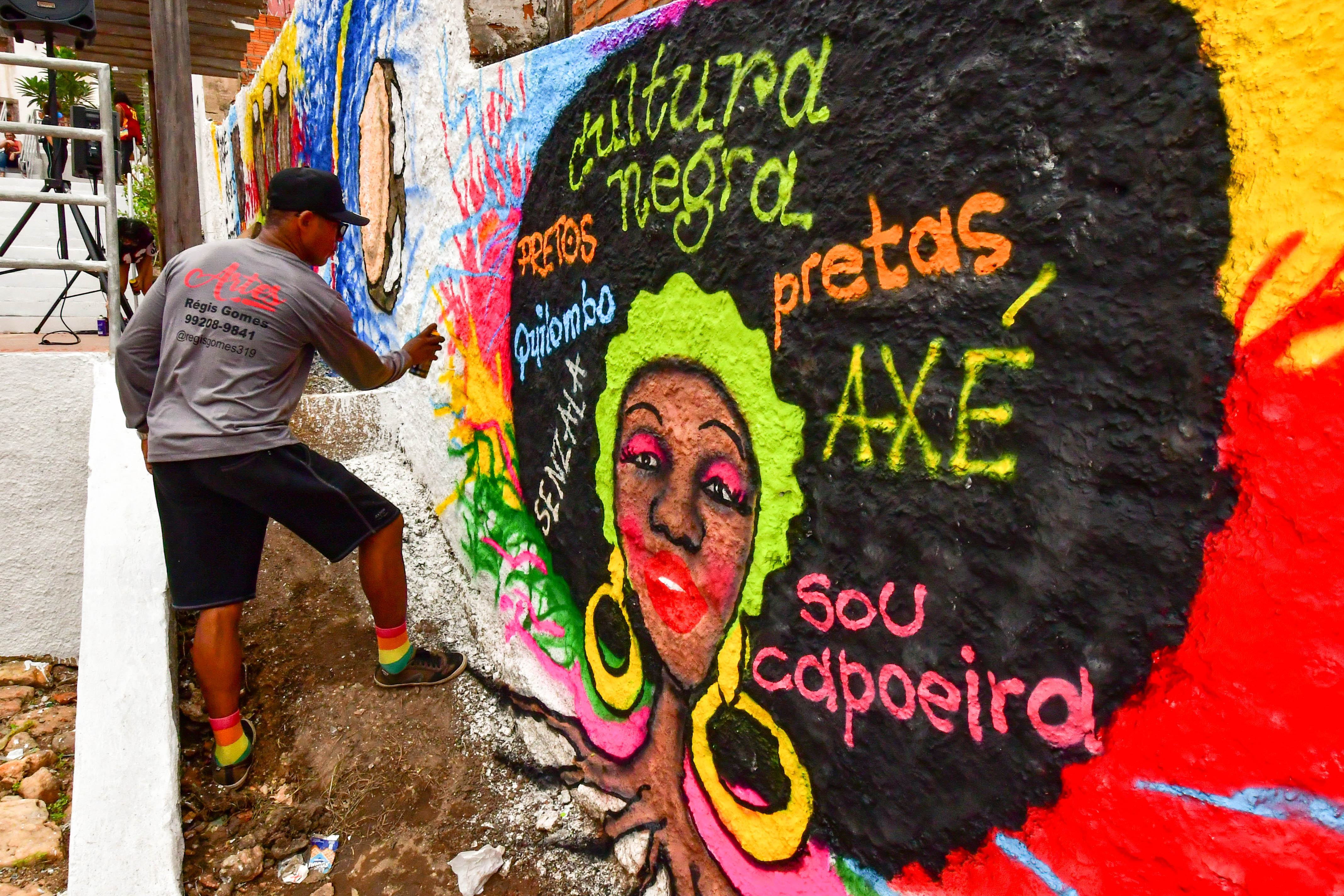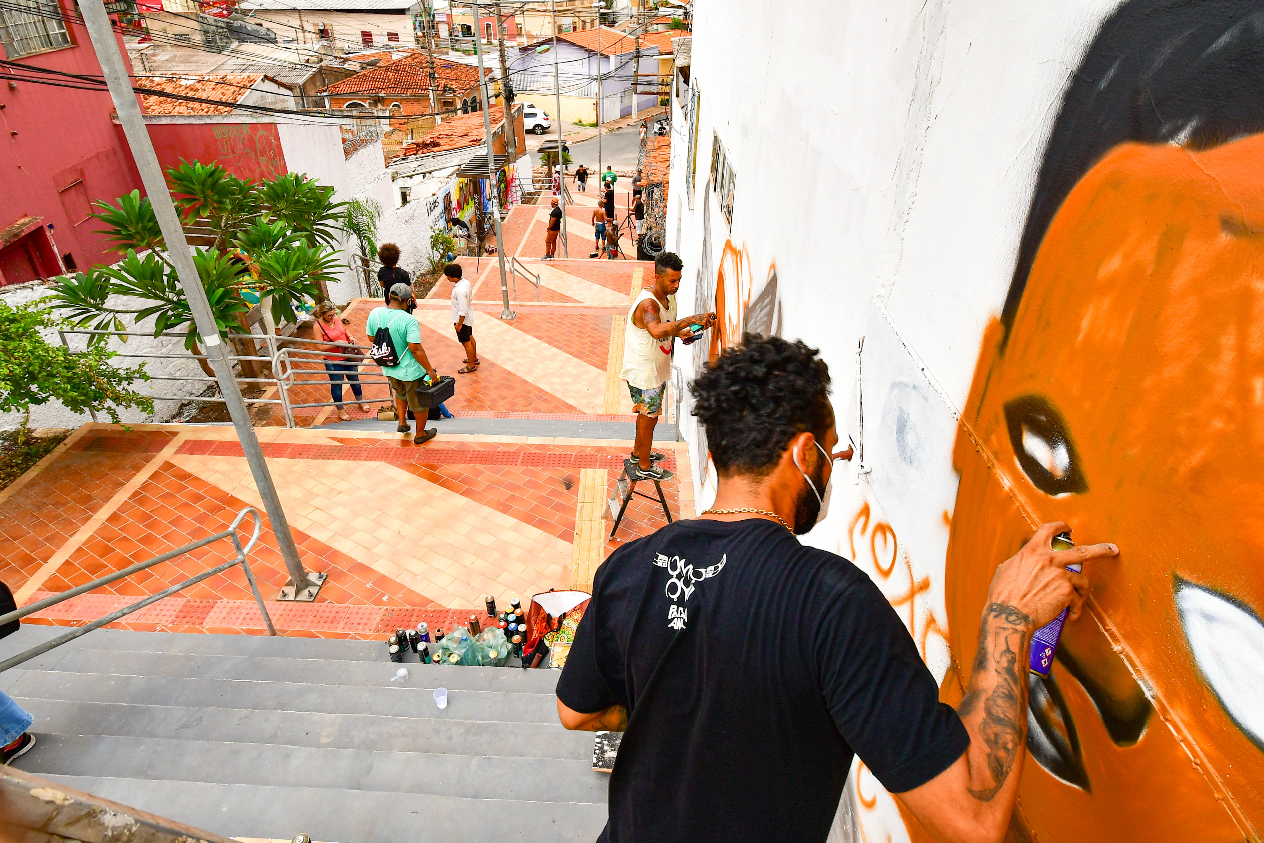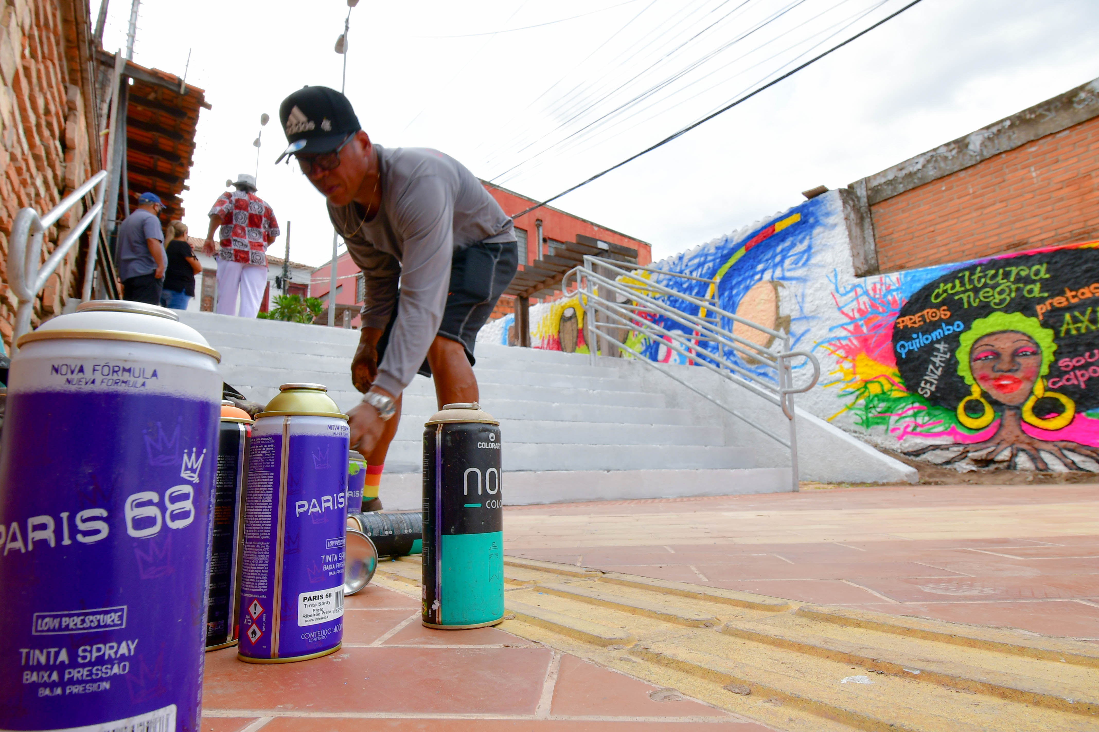 A escadaria do Beco Alto, localizado no Centro Histórico de Cuiabá, foi ponto de encontro no último sábado (13) de artistas plásticos e grafiteiros. A ação, uma homenagem no mês em que celebra-se o dia dac Consciência Negra (20 de novembro), contou ainda com muita música, dança, capoeira e poesias. Assim foi o encontro ‘Arte na Rua: O Último Tom da Cor', realizado pela Prefeitura de Cuiabá, por meio da Secretaria de Cultura, Esporte e Lazer, e o Museu da Imagem e Som (Misc).